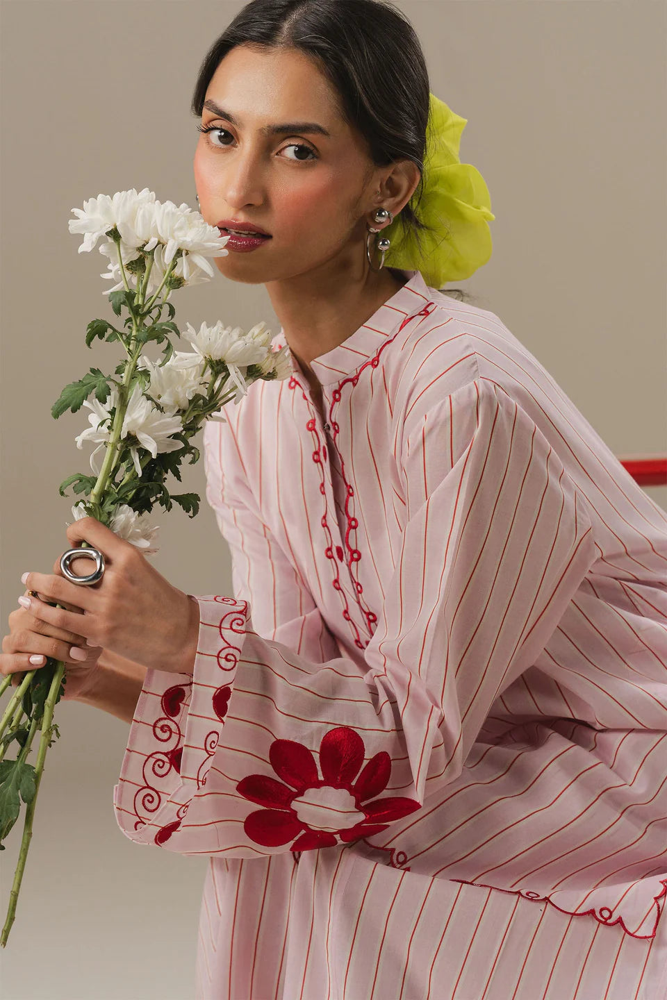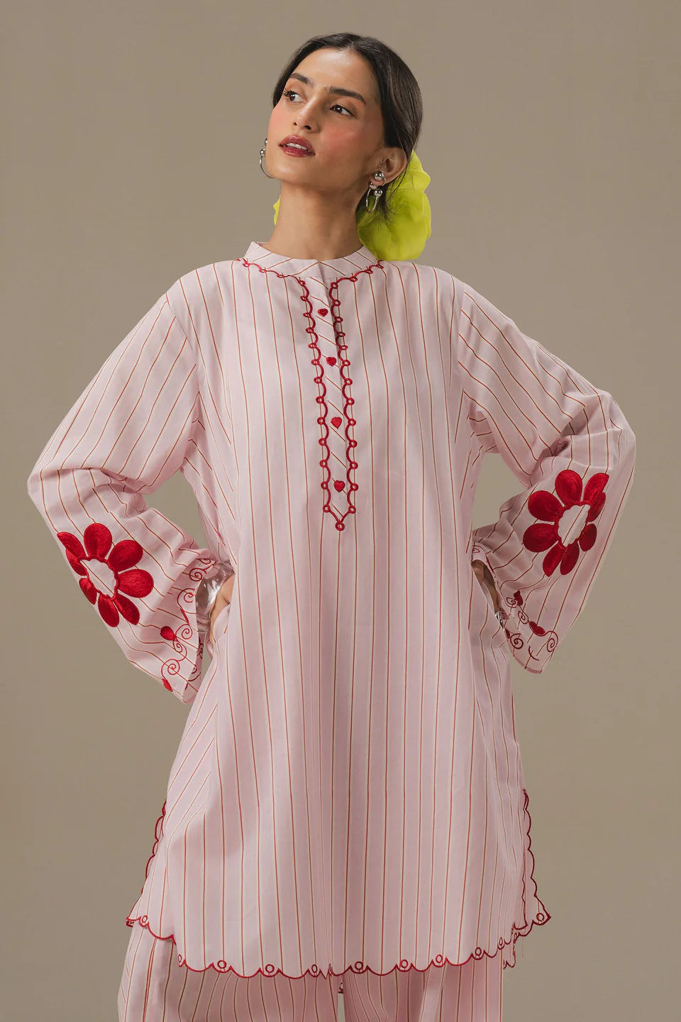 A soft pink cambric shirt with red and white stripes, featuring red embroidery on the sleeves and delicate detailing on the neckline. Light, fun, and effortlessly stylish, this set brings a fresh, modern touch to your wardrobe.