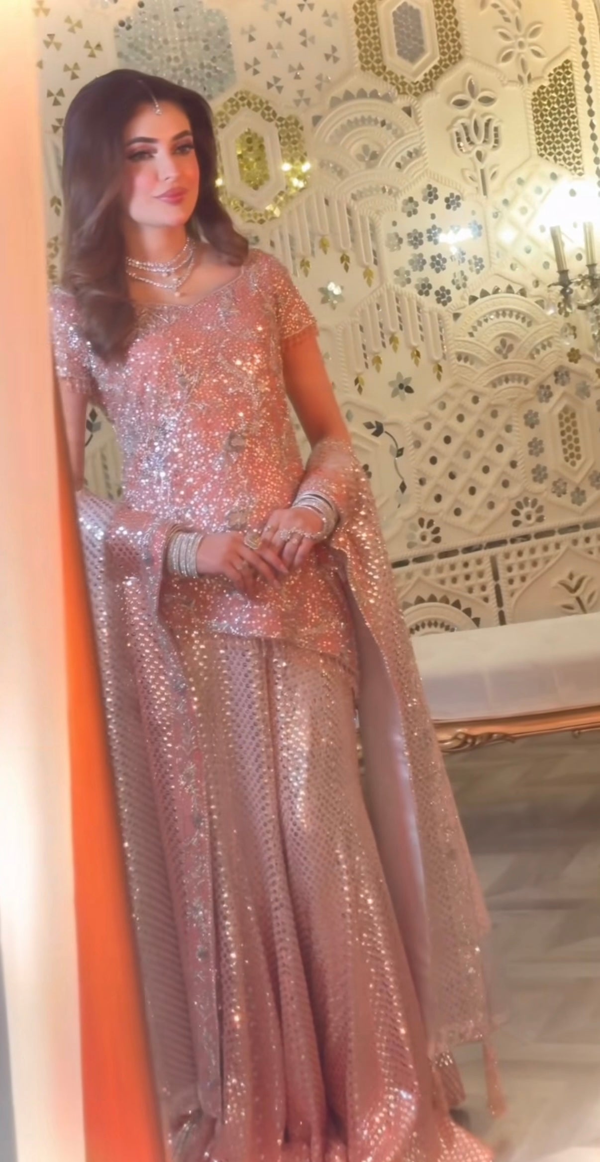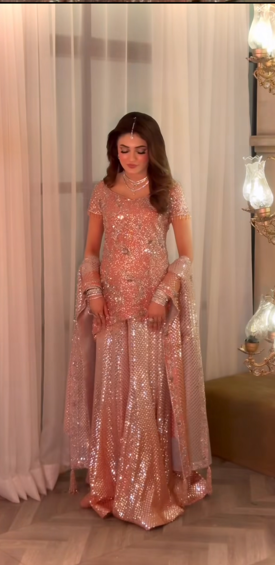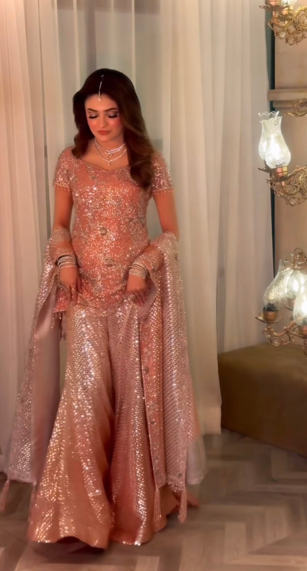 Our exquisite Bole Chudiyan–inspired engagement bridal is a true celebration of timeless grandeur and artisanal craftsmanship. The statement shirt is meticulously hand-worked from edge to edge, featuring an opulent blend of kora, dabka, naqshi, baitki, and fine traditional embellishments, executed with precision to create depth, texture, and old-world charm.