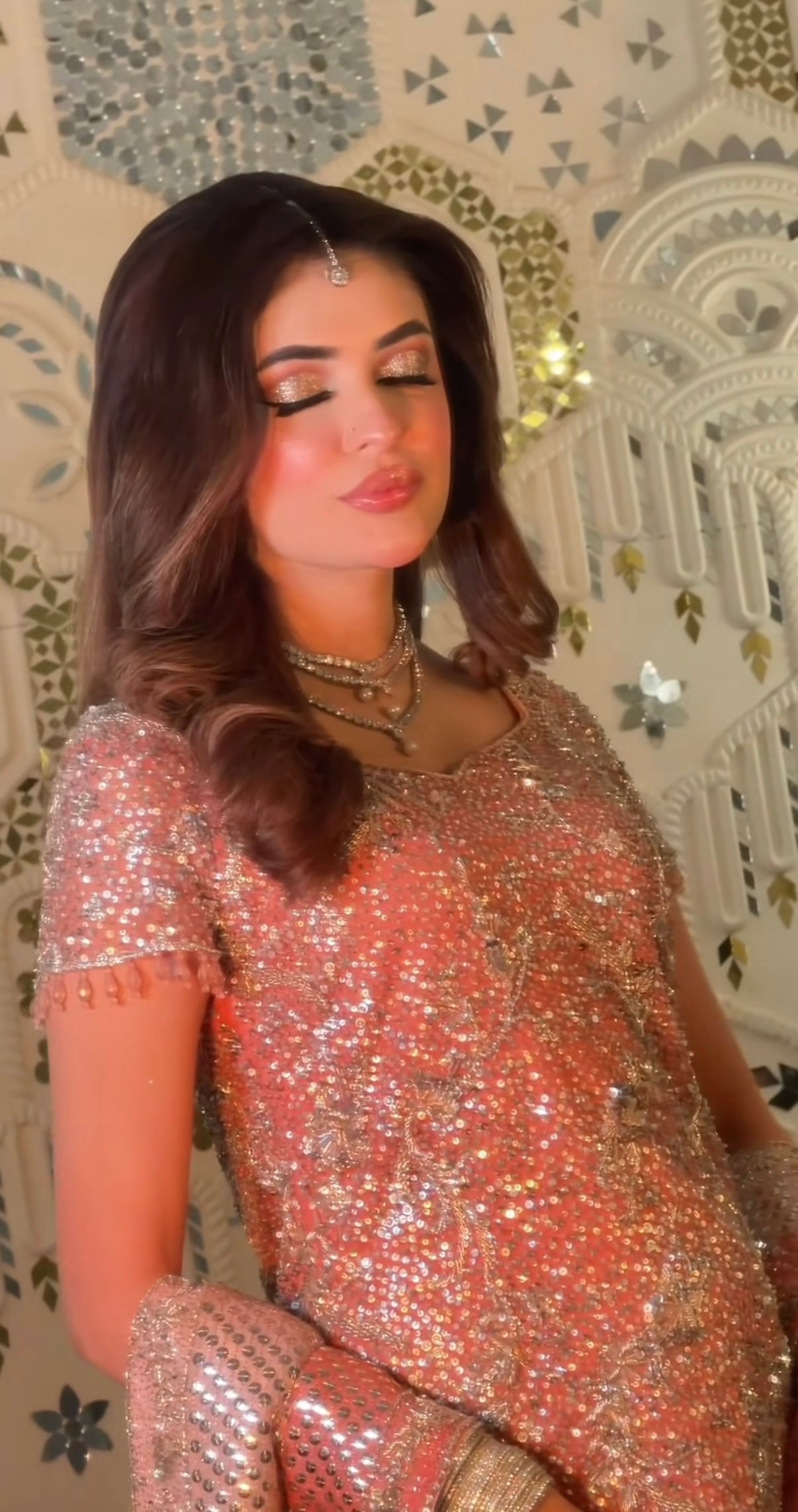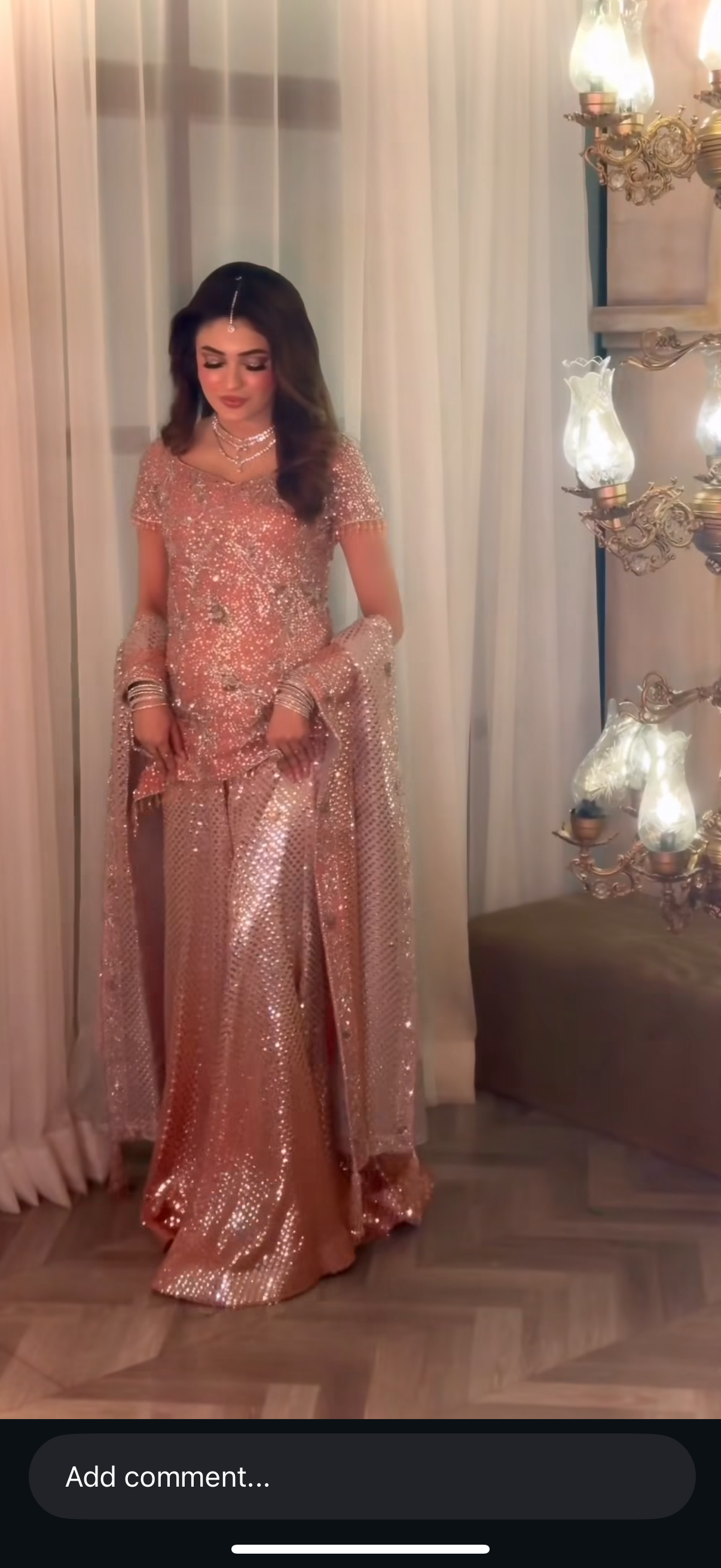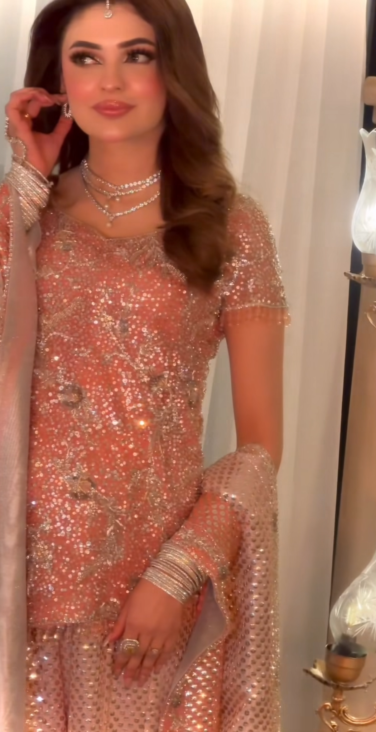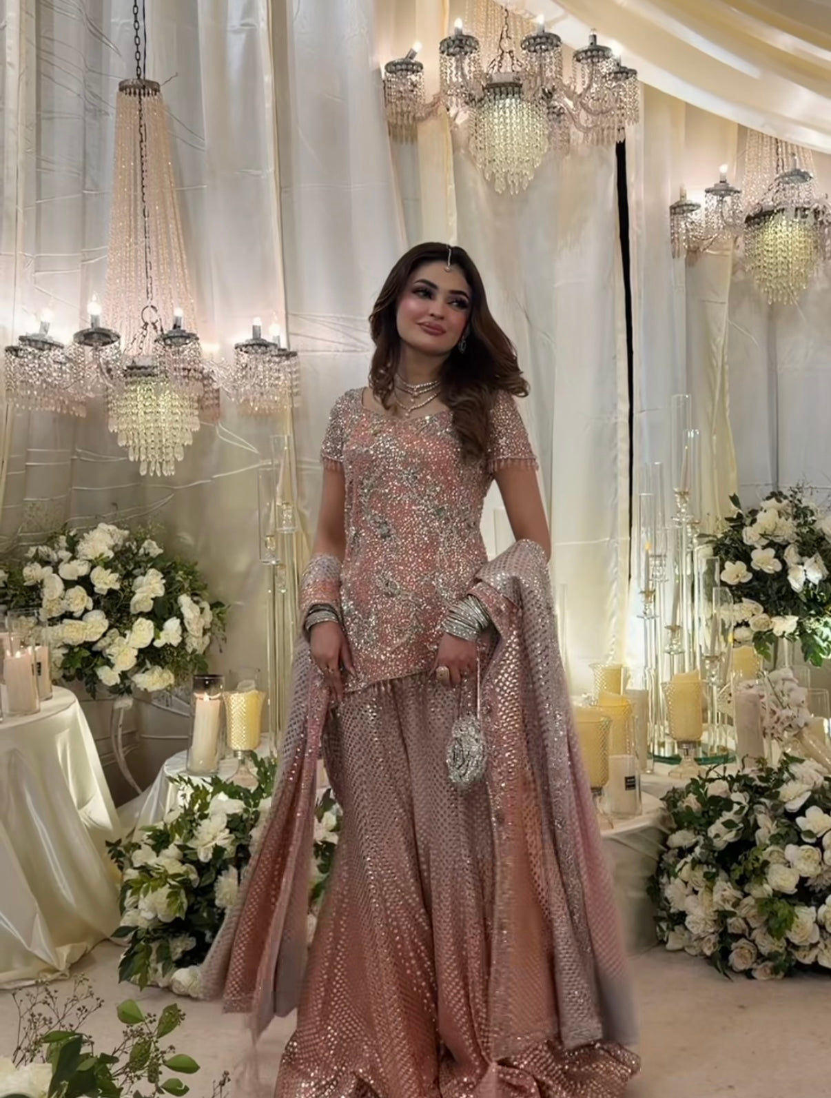 Our exquisite Bole Chudiyan–inspired engagement bridal is a true celebration of timeless grandeur and artisanal craftsmanship. The statement shirt is meticulously hand-worked from edge to edge, featuring an opulent blend of kora, dabka, naqshi, baitki, and fine traditional embellishments, executed with precision to create depth, texture, and old-world charm.