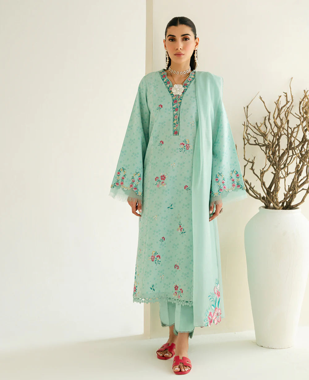 A long-length aqua shirt, designed with elegant panels that add structure and fluidity. The shirt is beautifully enhanced with parsi gara-inspired embroidery, featuring intricate, heritage motifs across the front. The neckline and sleeves are detailed with signature gara elements, with the sleeves finished with delicate loops for added texture and charm. The look is paired with a gara motif dupatta, adorned with finely embroidered patterns and a floral cutwork border. The entire ensemble is brought to life with a refreshing palette of pinks, yellows, whites, and aquas, creating a sophisticated yet vibrant feel.