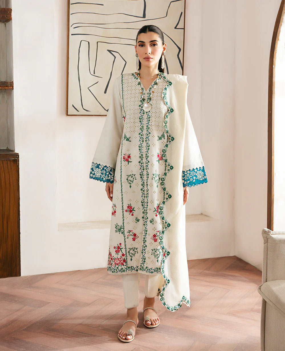 An exquisitely tailored 4-panelled shirt crafted in a serene white base, featuring white-on-white jaal embroidery for a timeless, textured elegance. The front-open patti stands out in a blue base, delicately adorned with parsi gara-inspired embroidery, showcasing hints of red, coral, and peach for a subtle yet striking contrast. The sleeves are finished with a color-blocked border in deep navy, grounding the look with a bold accent. Paired seamlessly with straight-fit pants, the outfit is elevated by a beautifully coordinated scalloped dupatta, finished on all four sides, adding finesse and feminine charm.