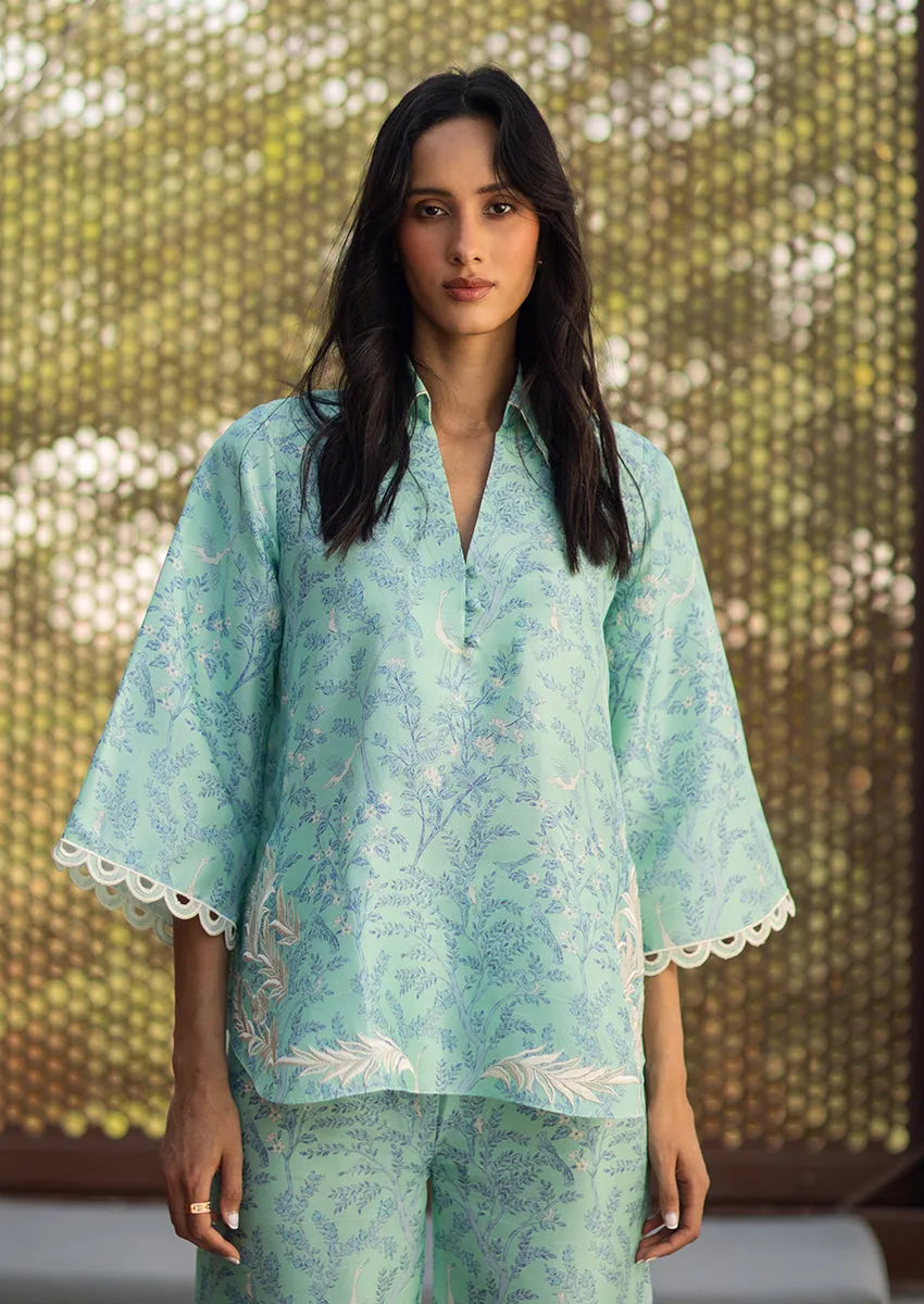 The Quinn co-ord set features a refreshing aqua English garden and avian-inspired print on pure raw silk. The tailored shirt is designed with a sharp pointed collar and deep V-neckline, accented by delicate button-loop closures. Cropped sleeves are finished with signature scalloped eyelet detailing and ivory botanical embroidery that mirrors the patterns along the curved hemline.