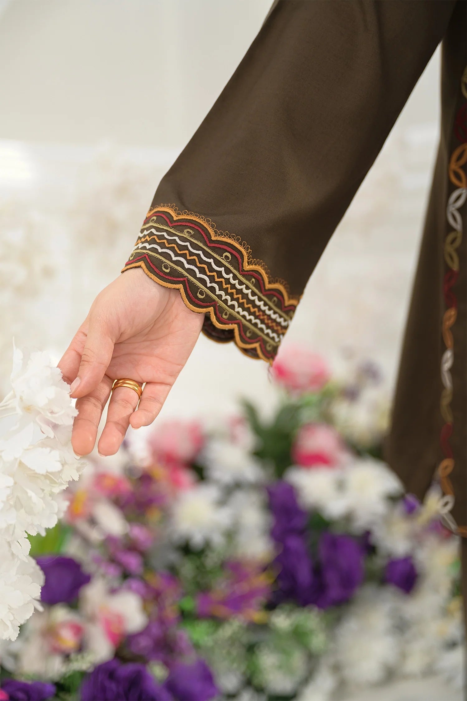Brown coloured embroidered set that comes with short shirt and skinny shalwar. Fabric used is a premium blended viscose suitable for all seasons. Dupatta is brought separately and is curated from chiffon.