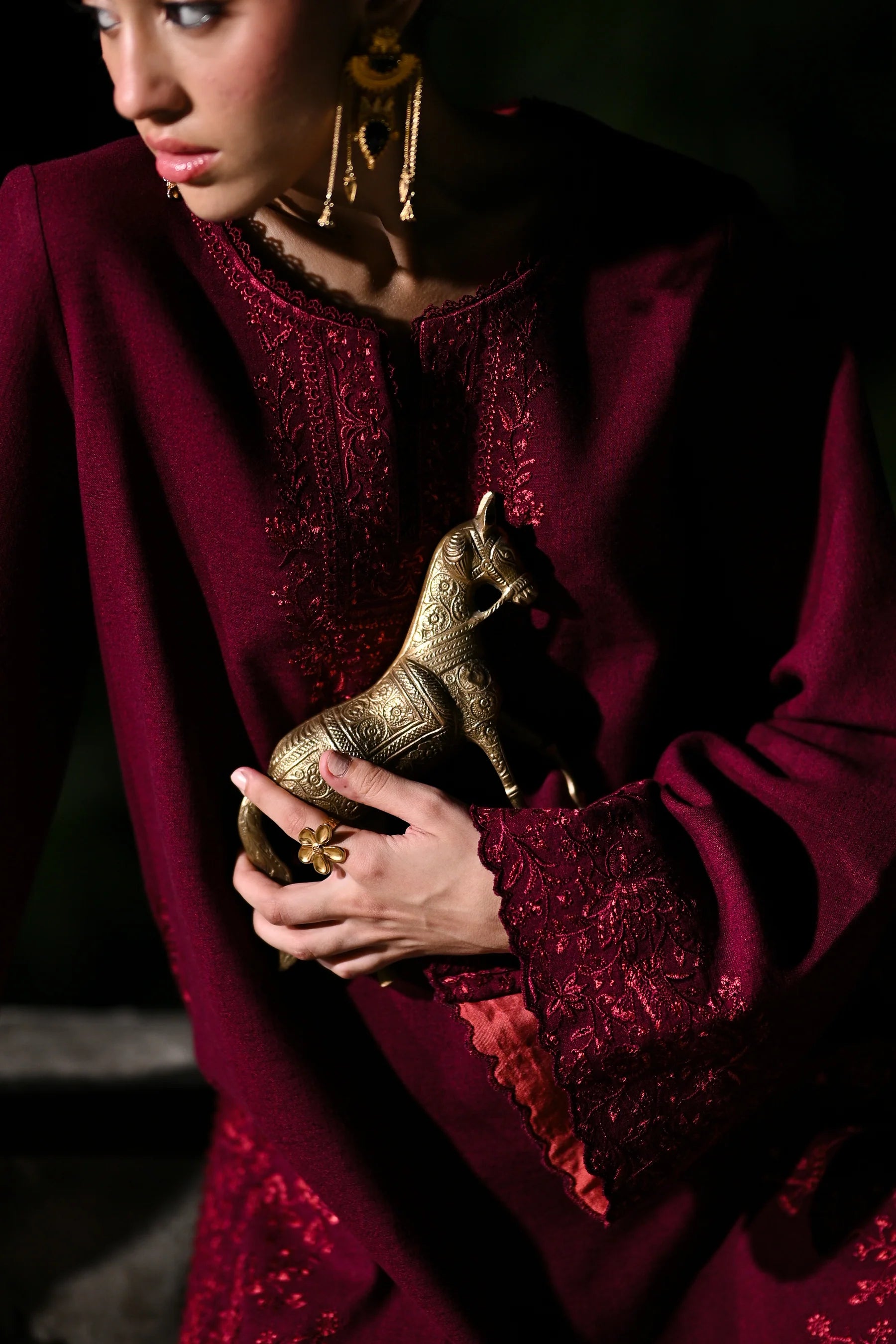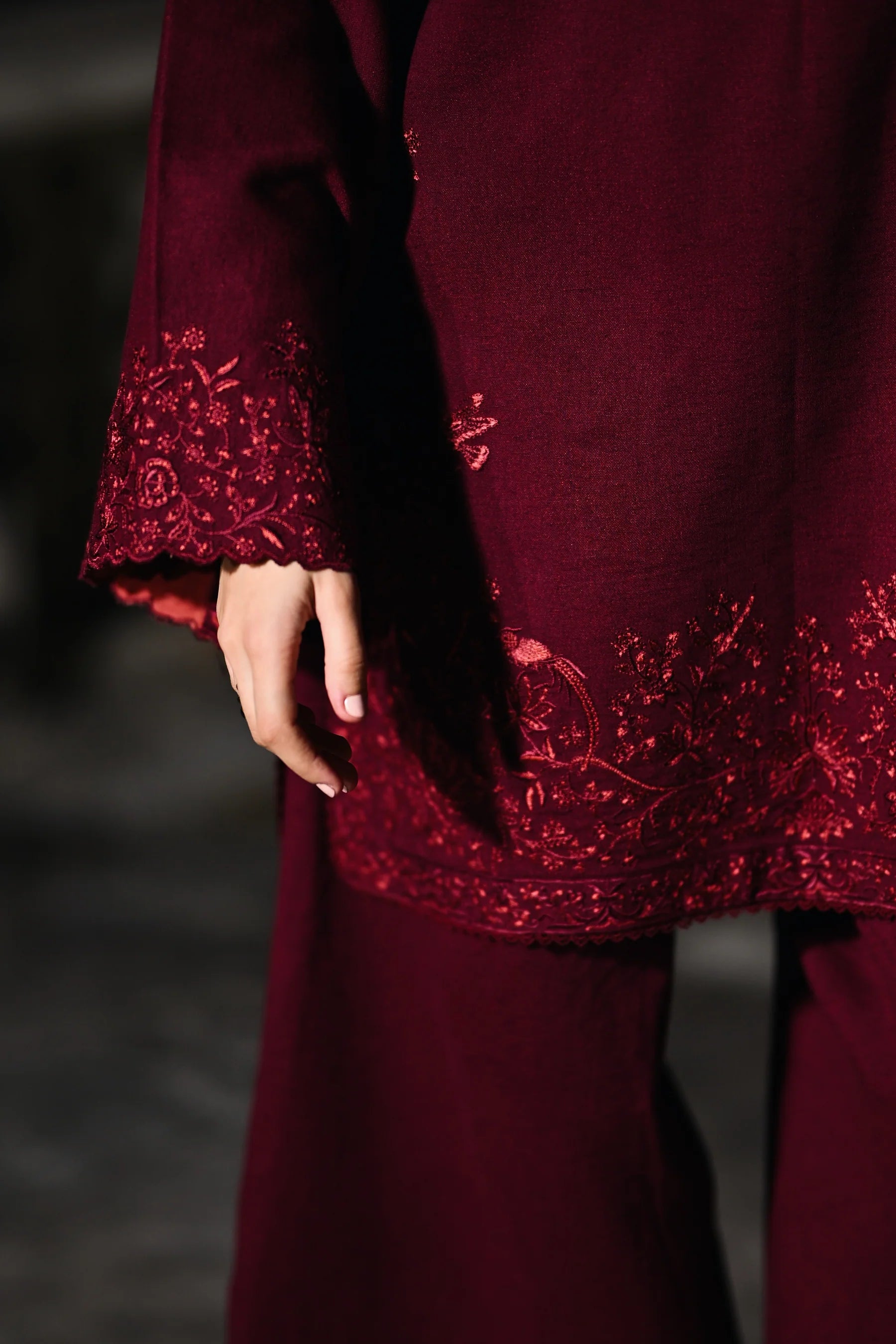 This elegant burgundy rice karandi 2-piece set features beautifully detailed tonal embroidery that enhances its rich winter look. The shirt is adorned with intricate threadwork on the neckline, sleeves, and hem, giving it a refined and traditional charm. Paired with embroidered culottes finished with matching embroidered borders, the outfit offers a graceful silhouette with perfect comfort. Crafted from premium-quality rice karandi, this set is ideal for winter gatherings, blending timeless design with a luxurious, warm feel. Perfect for casual to semi-formal wear, it adds effortless sophistication to your wardrobe.