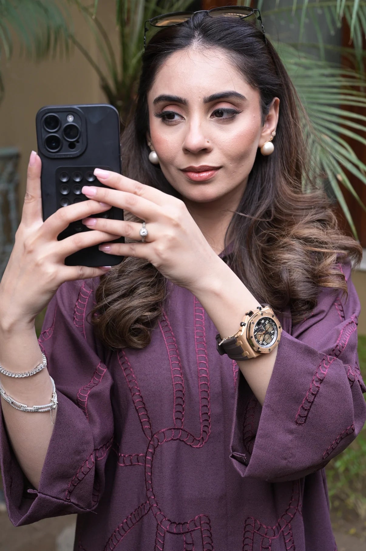 A Burgundy loose-fit kurta with minimal stitching patterned embroidery over all across the front, paired with a Farshi Shalwar. The kurta has a collared neckline giving it a modern yet graceful touch.