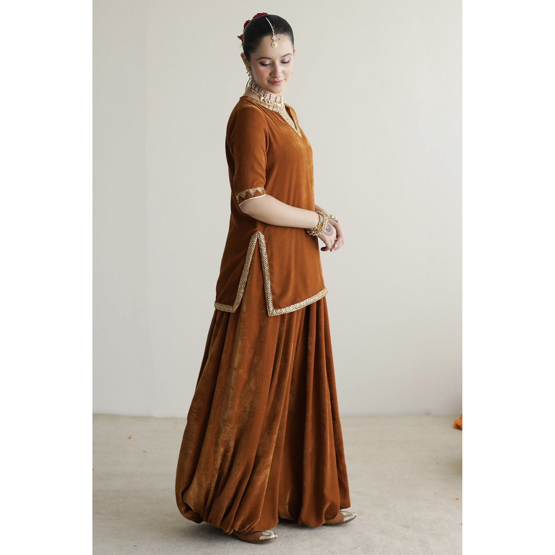 Burnt Sienna velvet short shirt paired with a ballon shalwar with tilla, badla and sequin embroidery paired with an organza spray dupatta.