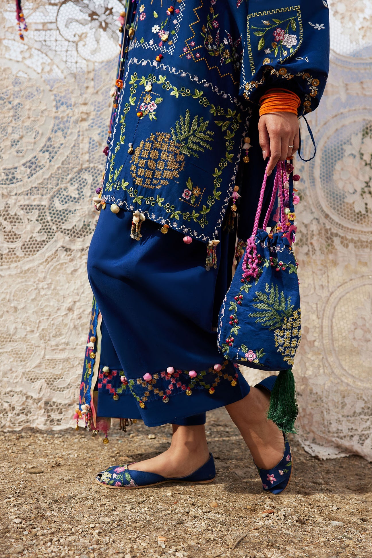 The relaxed silhouette and flowing trousers maintain an airy lightness, while intricately detailed borders add subtle structure without overpowering the design.