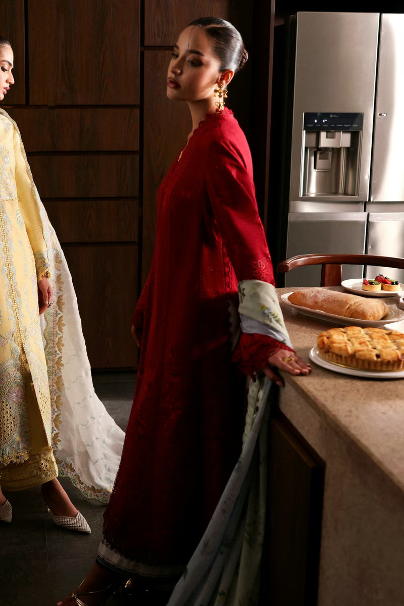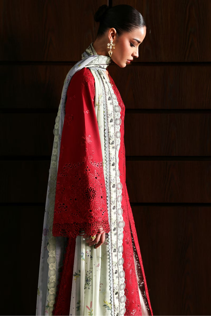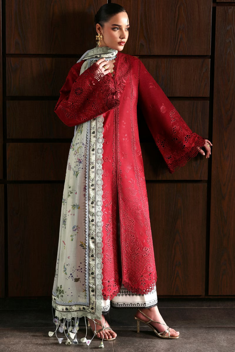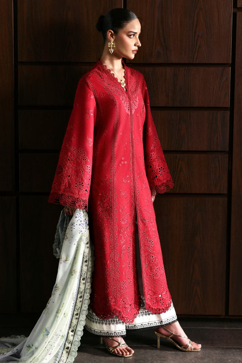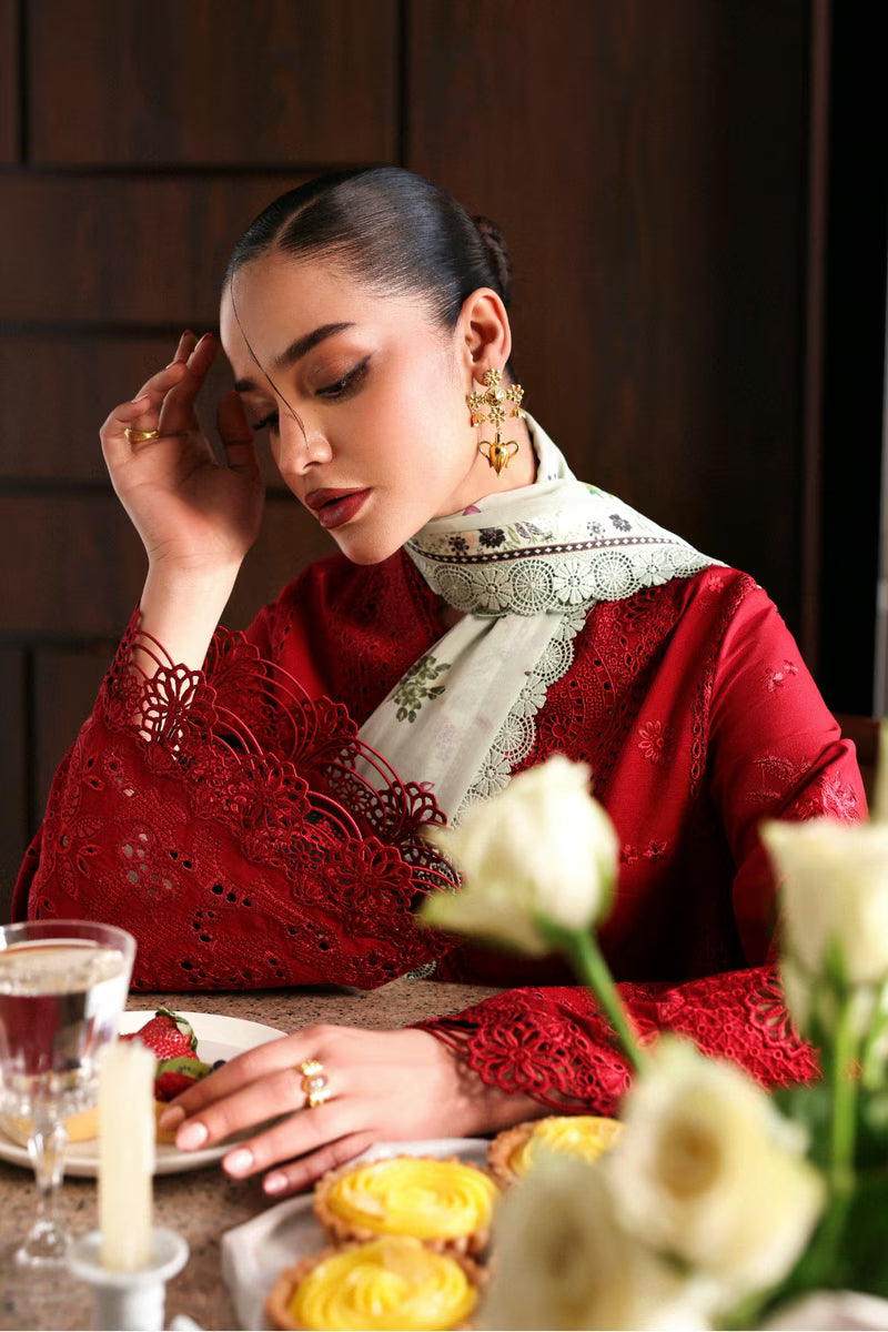 Introducing a rich, deep red look designed for effortless statement dressing. This jacket-style outfit features a scalloped rounded hem with intricate cutwork and borings, finished with flared sleeves that add softness and movement to the silhouette.
