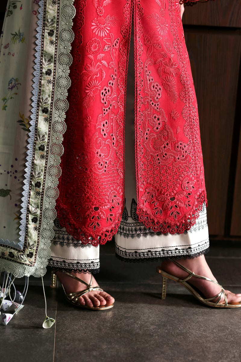 Paired with contrasting white and black pants and a two-colored printed chiffon dupatta (batta) finished with cute tassels on the pallu, this look brings together detail, comfort, and a modern summer feel.