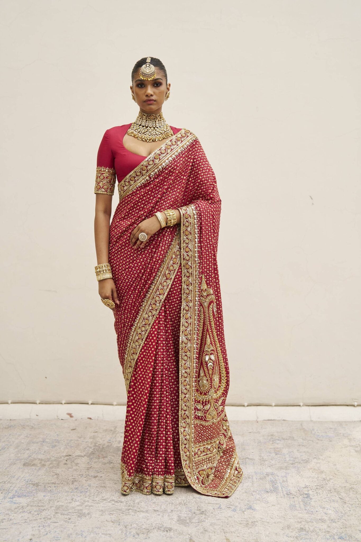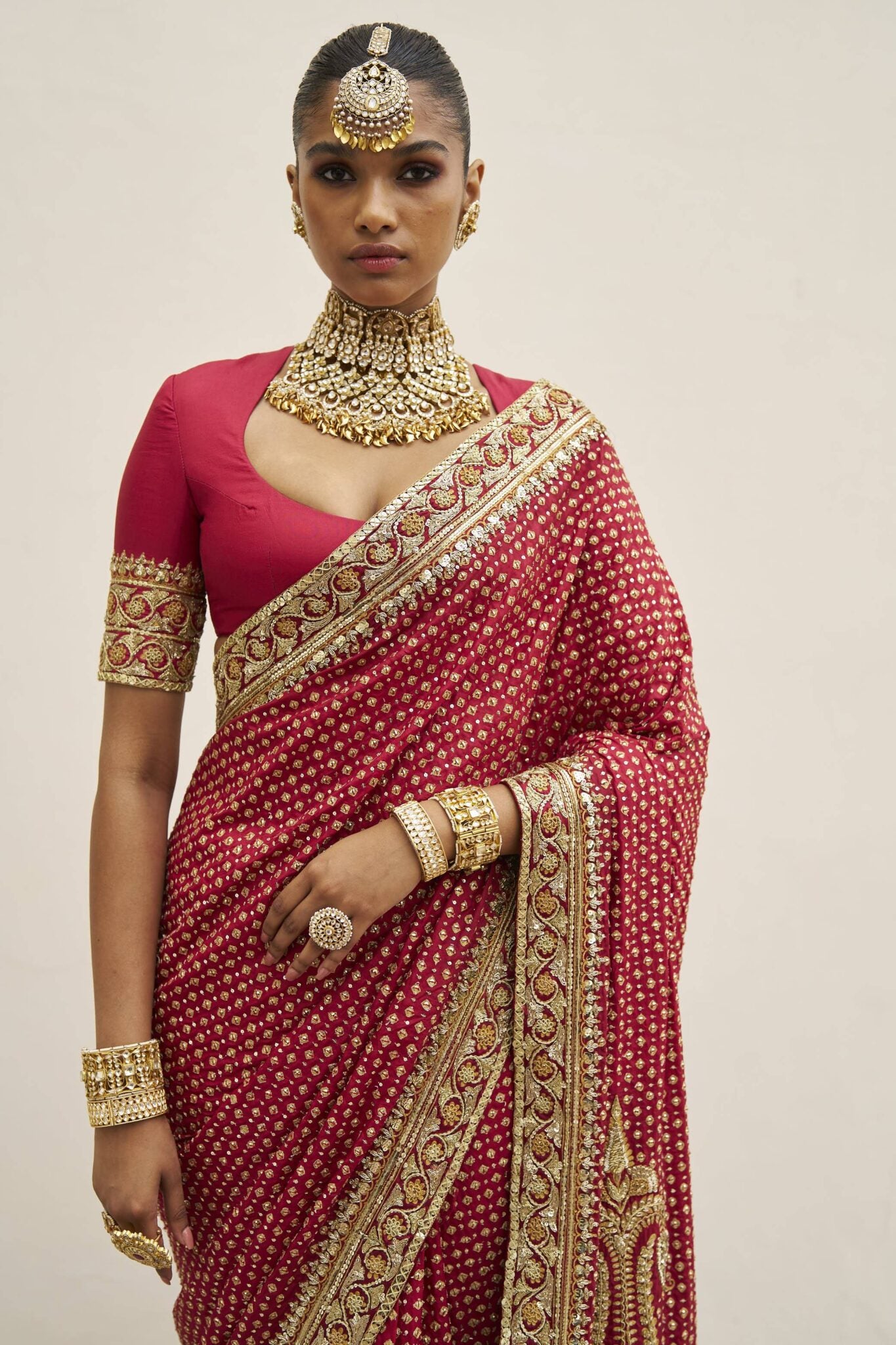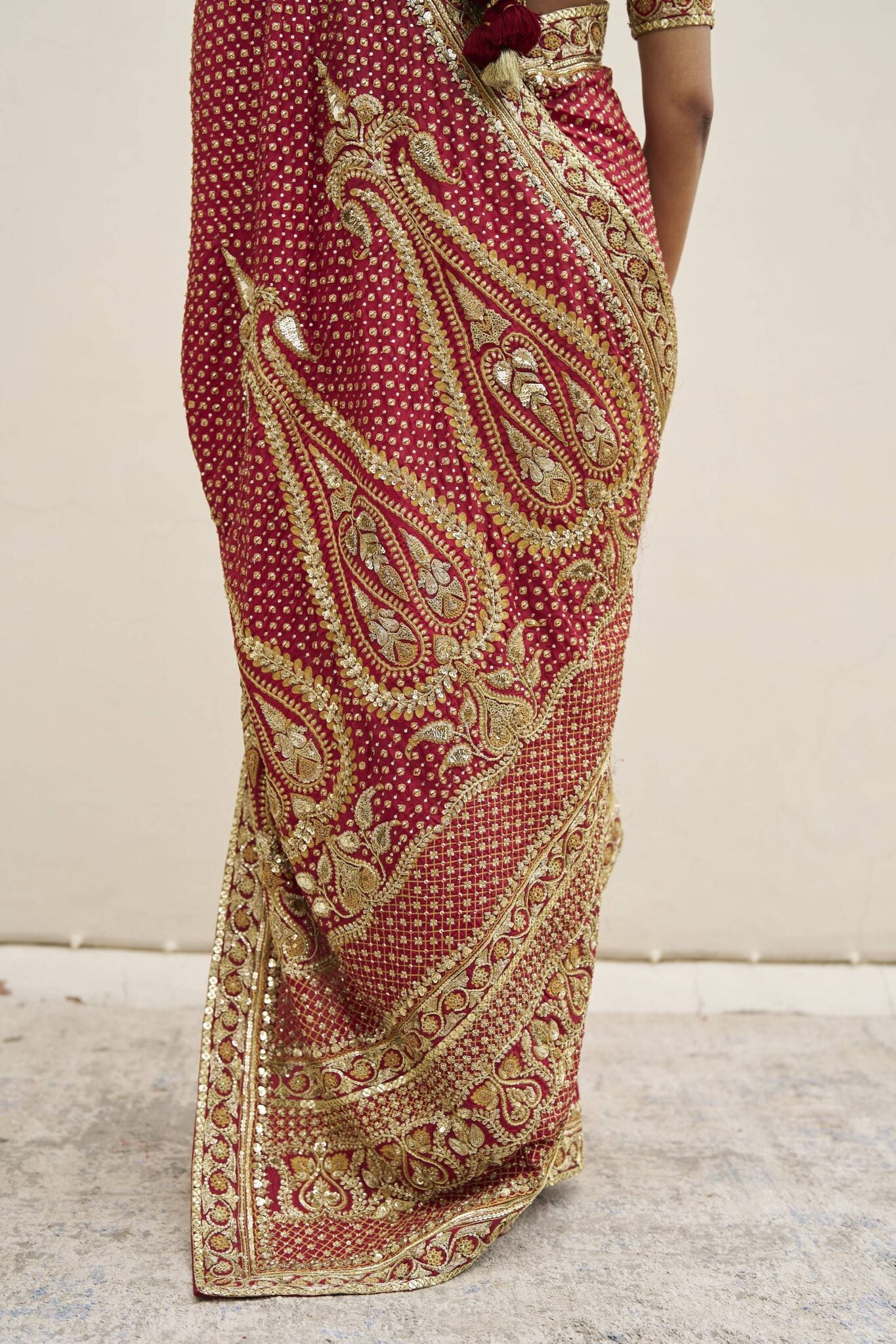 Saree: Fully embroidered red saree with small diamond shaped sequins work. The saree consists of heavily embroidered tilla and zardozi work borders on three sides with dense work on the palloos, including signature paisely style traditional motif using zardozi, aari, dabka, nakshi, tilla, sequins work and marori detailings. The fabric of the saree is pure katan silk.