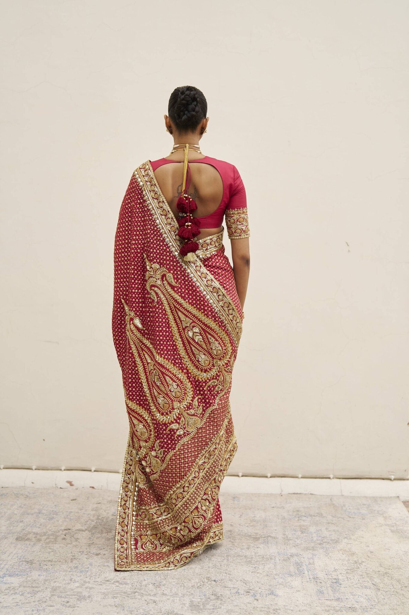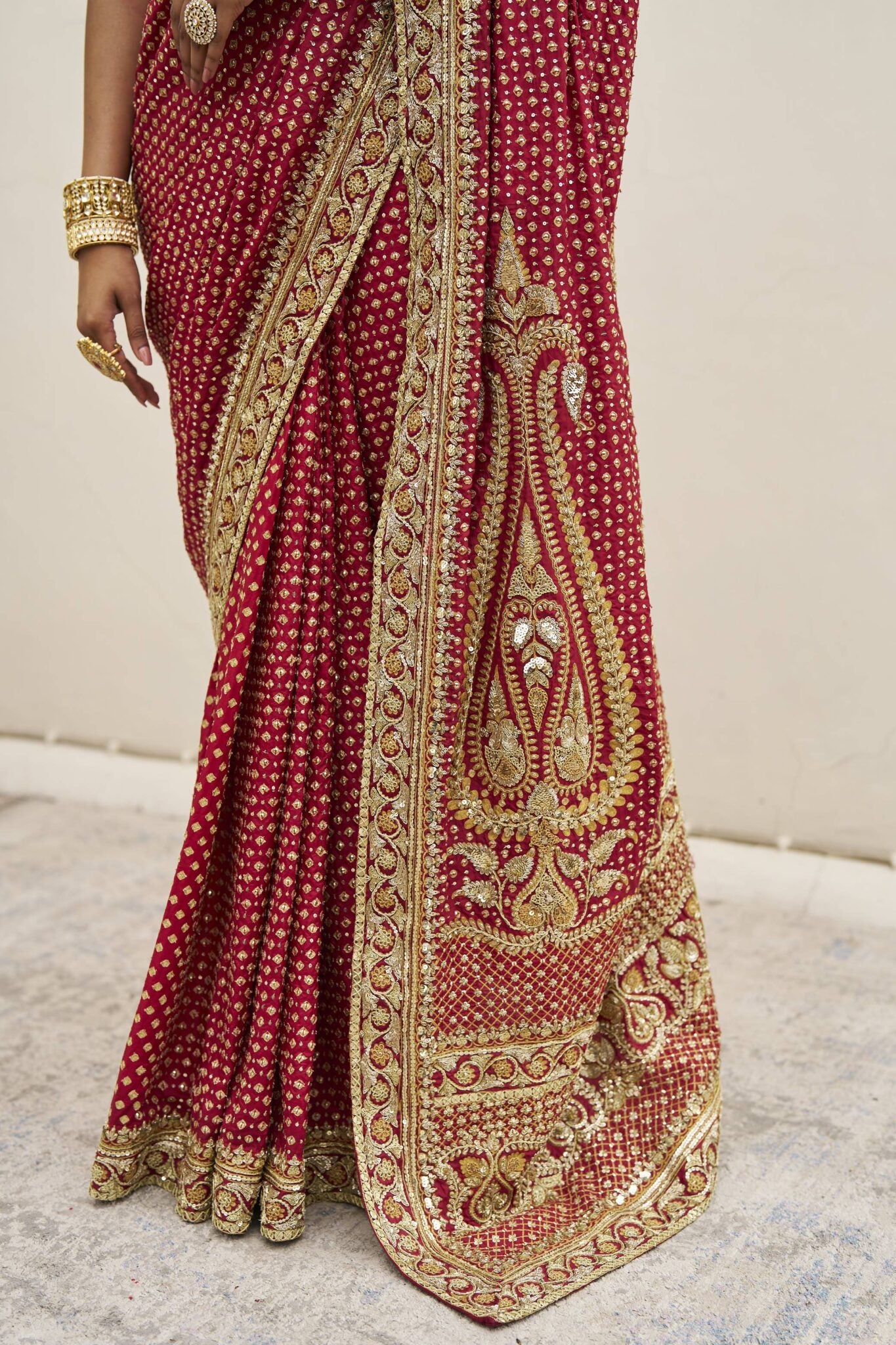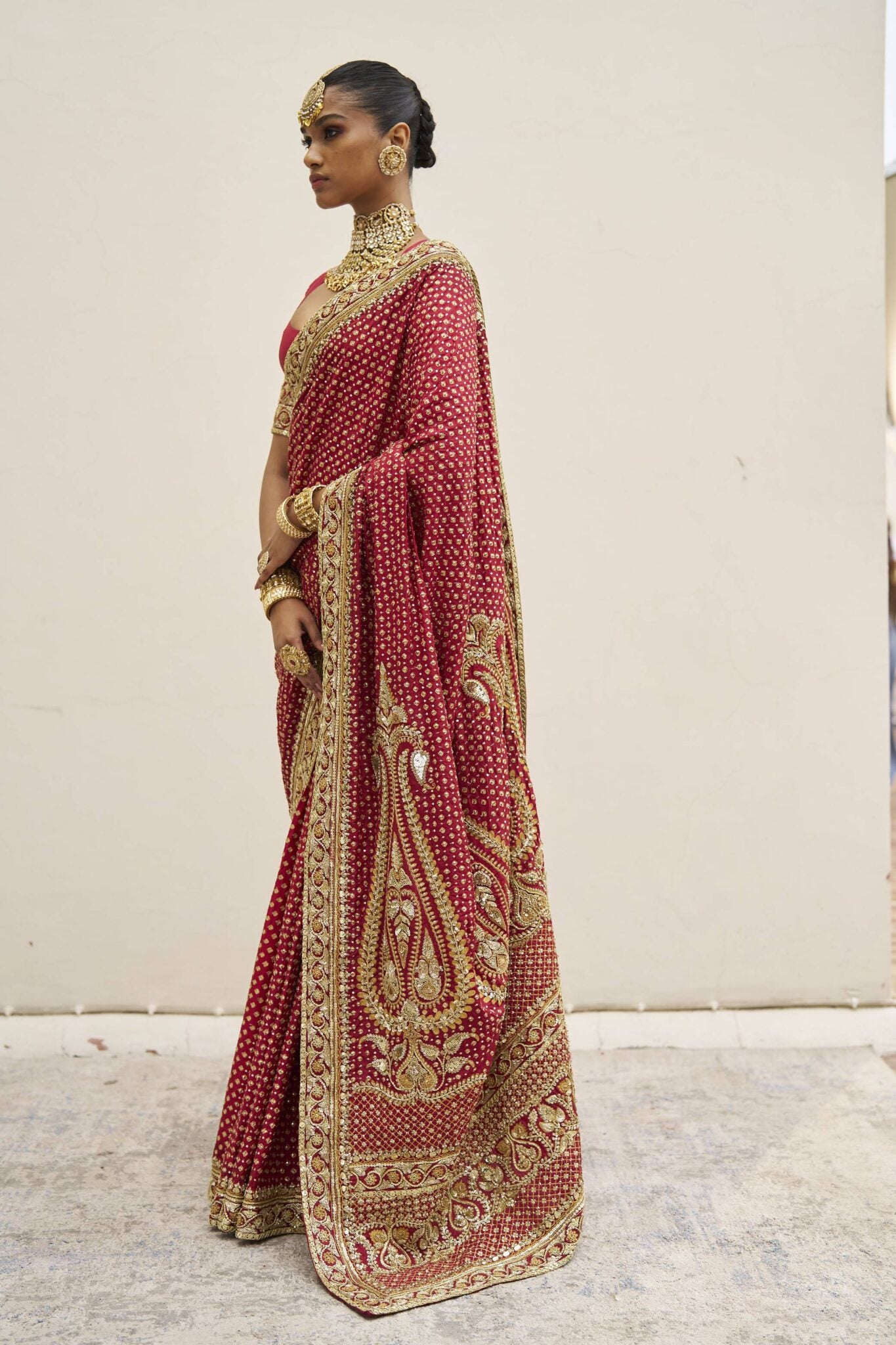 Saree: Fully embroidered red saree with small diamond shaped sequins work. The saree consists of heavily embroidered tilla and zardozi work borders on three sides with dense work on the palloos, including signature paisely style traditional motif using zardozi, aari, dabka, nakshi, tilla, sequins work and marori detailings. The fabric of the saree is pure katan silk.