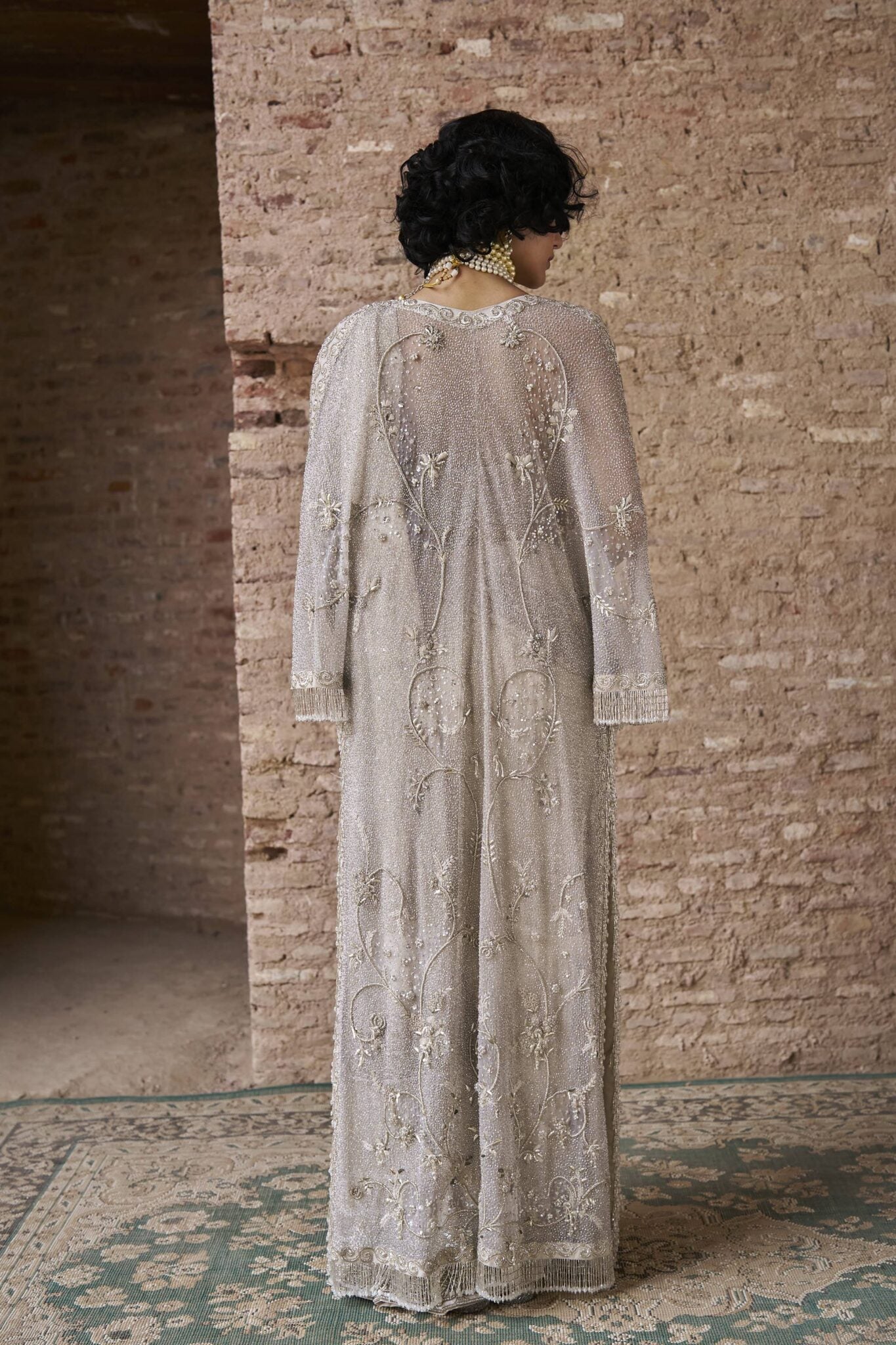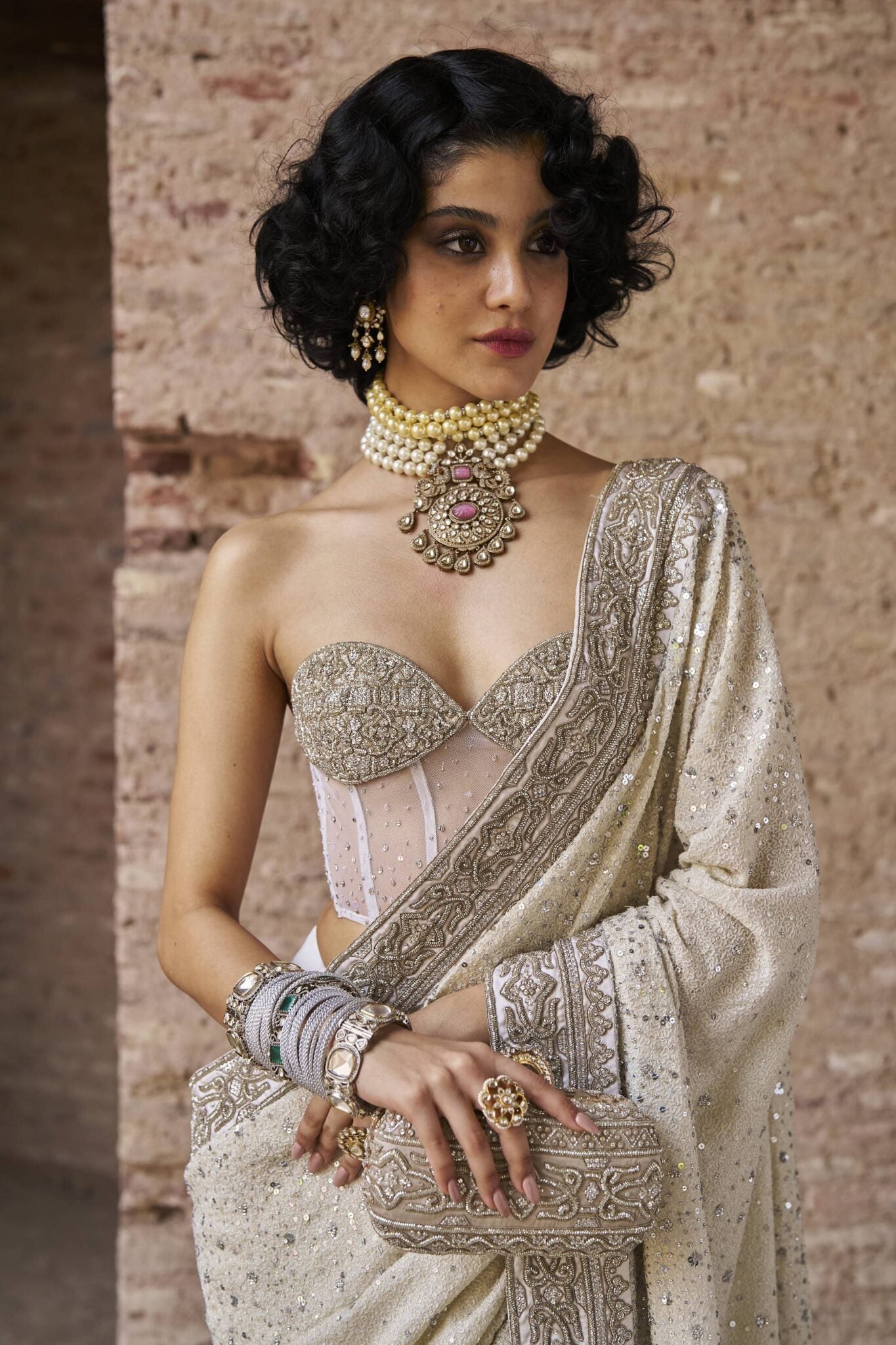 Blouse: Ivory embroidered corset (blouse) with stone, cut beads and kora work