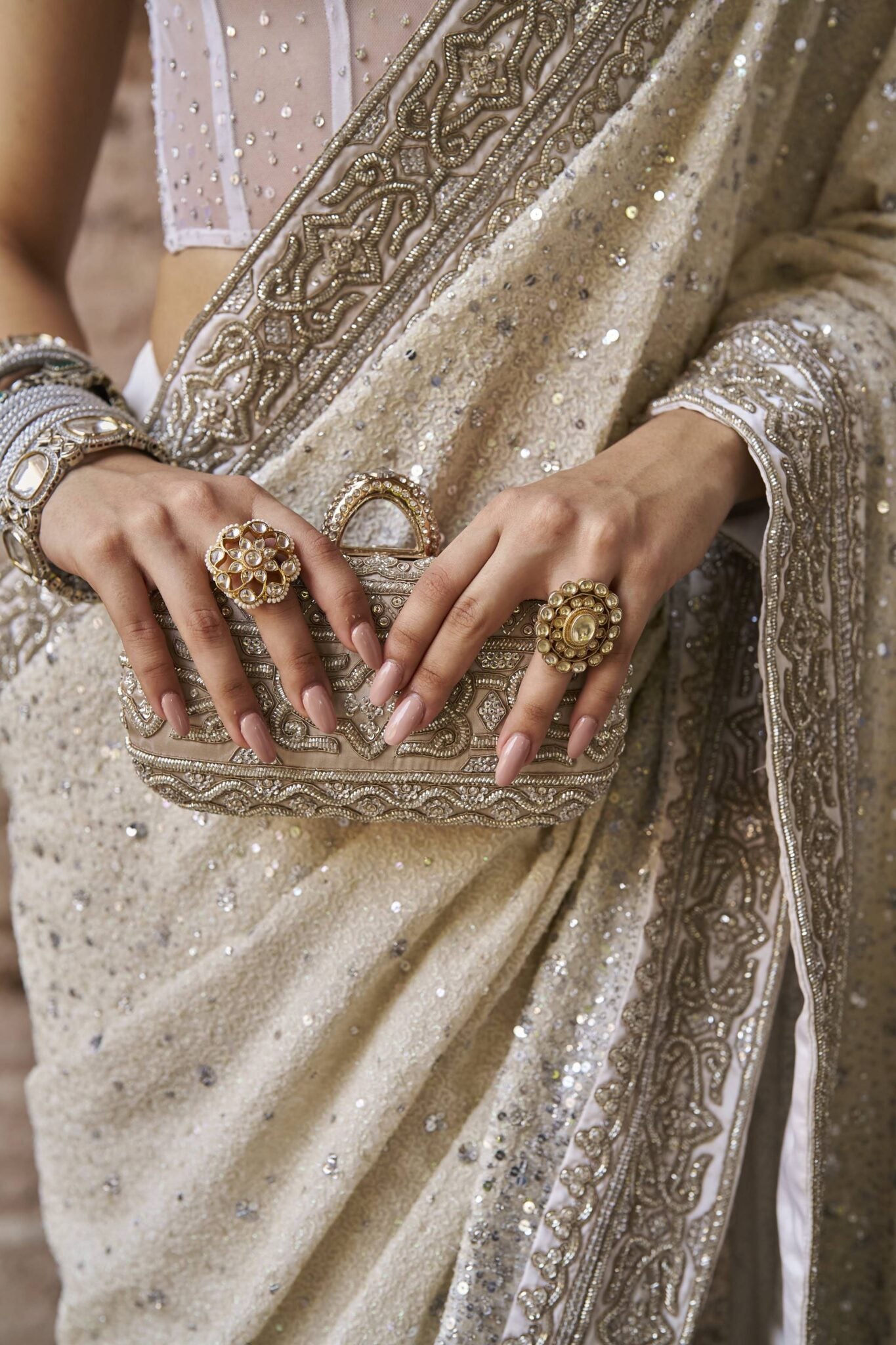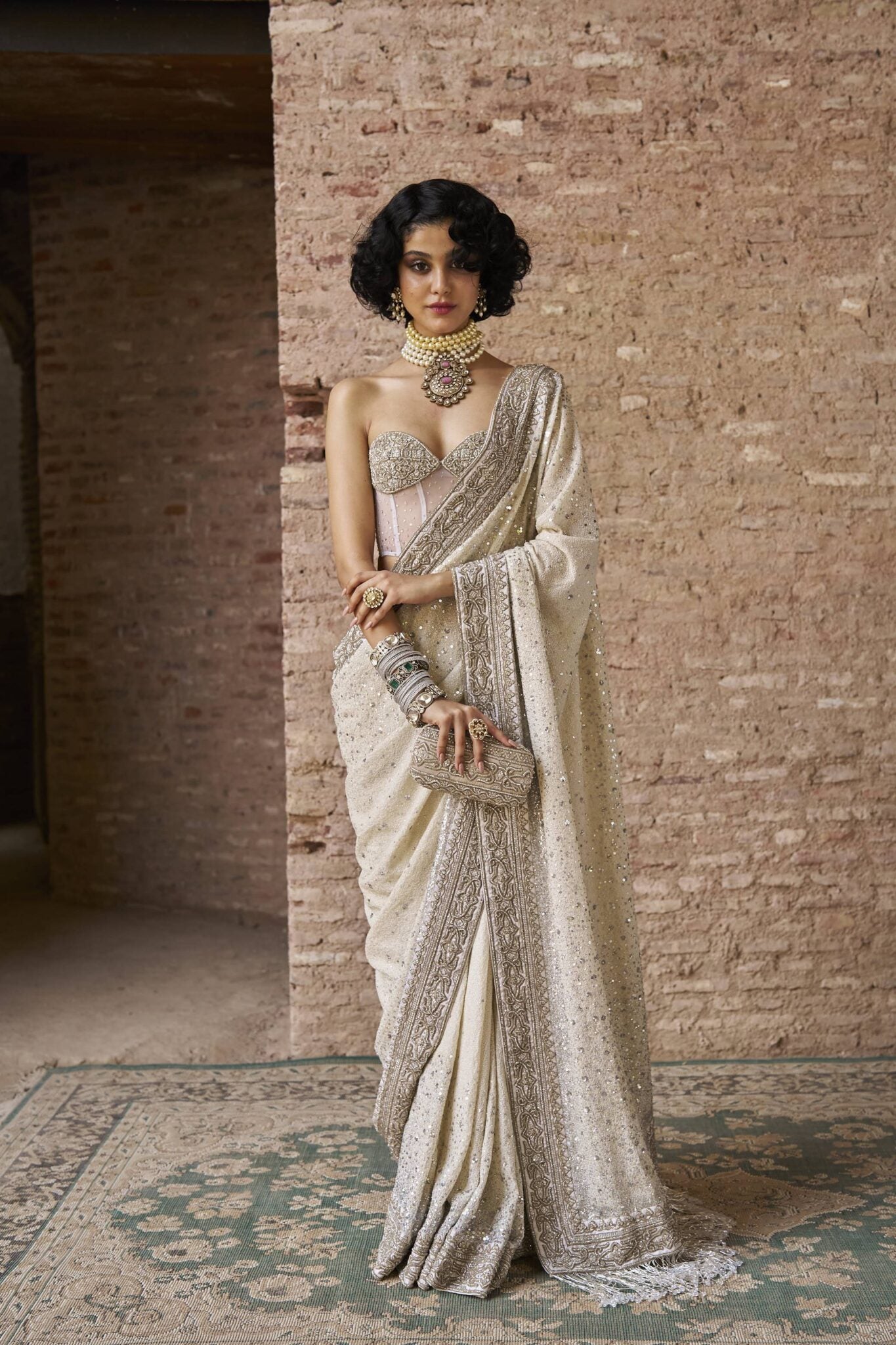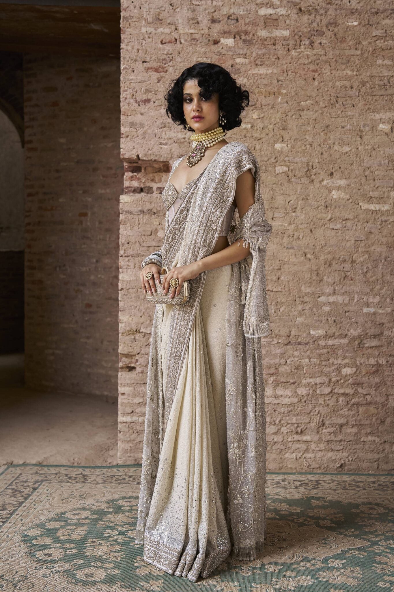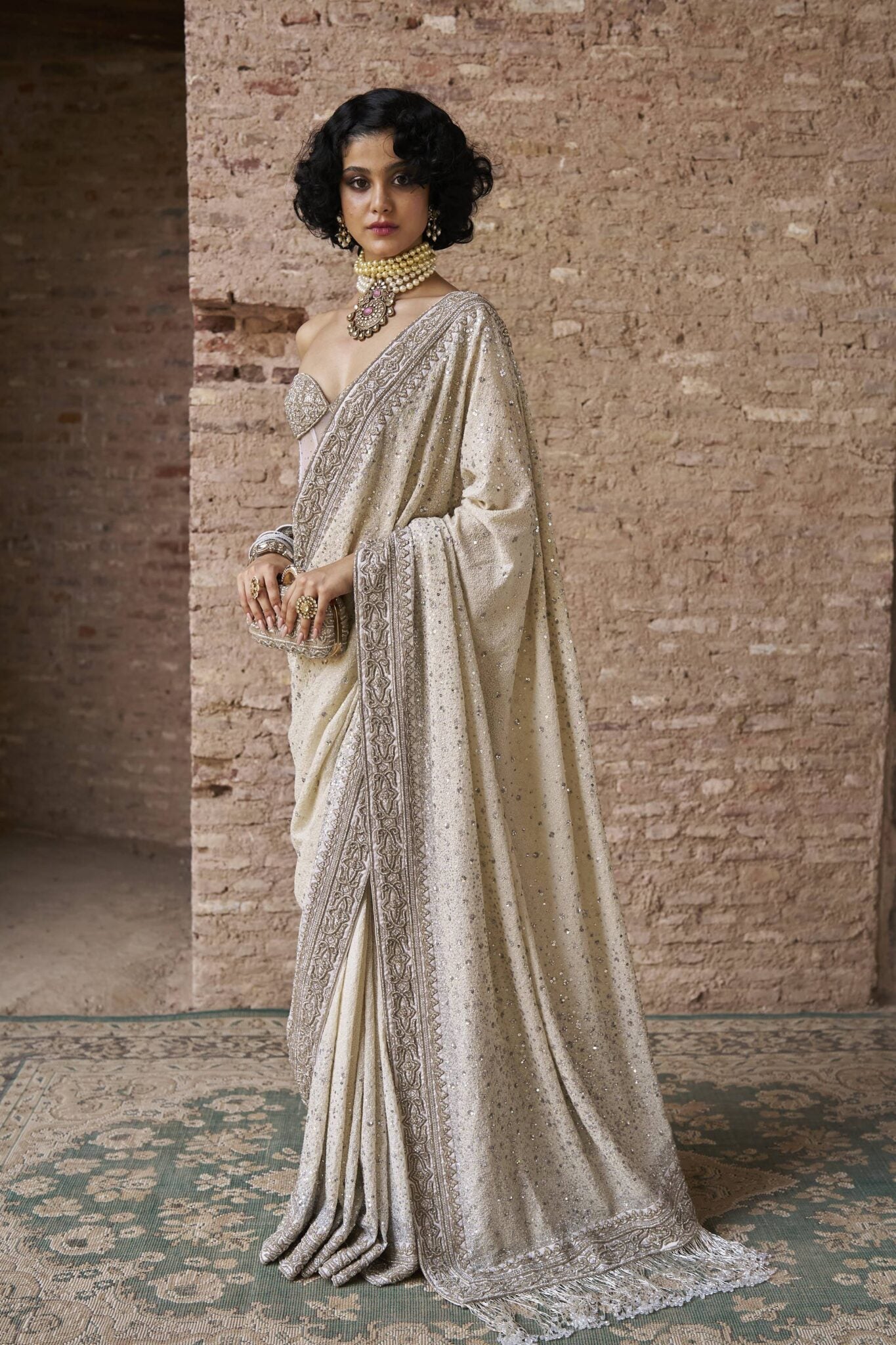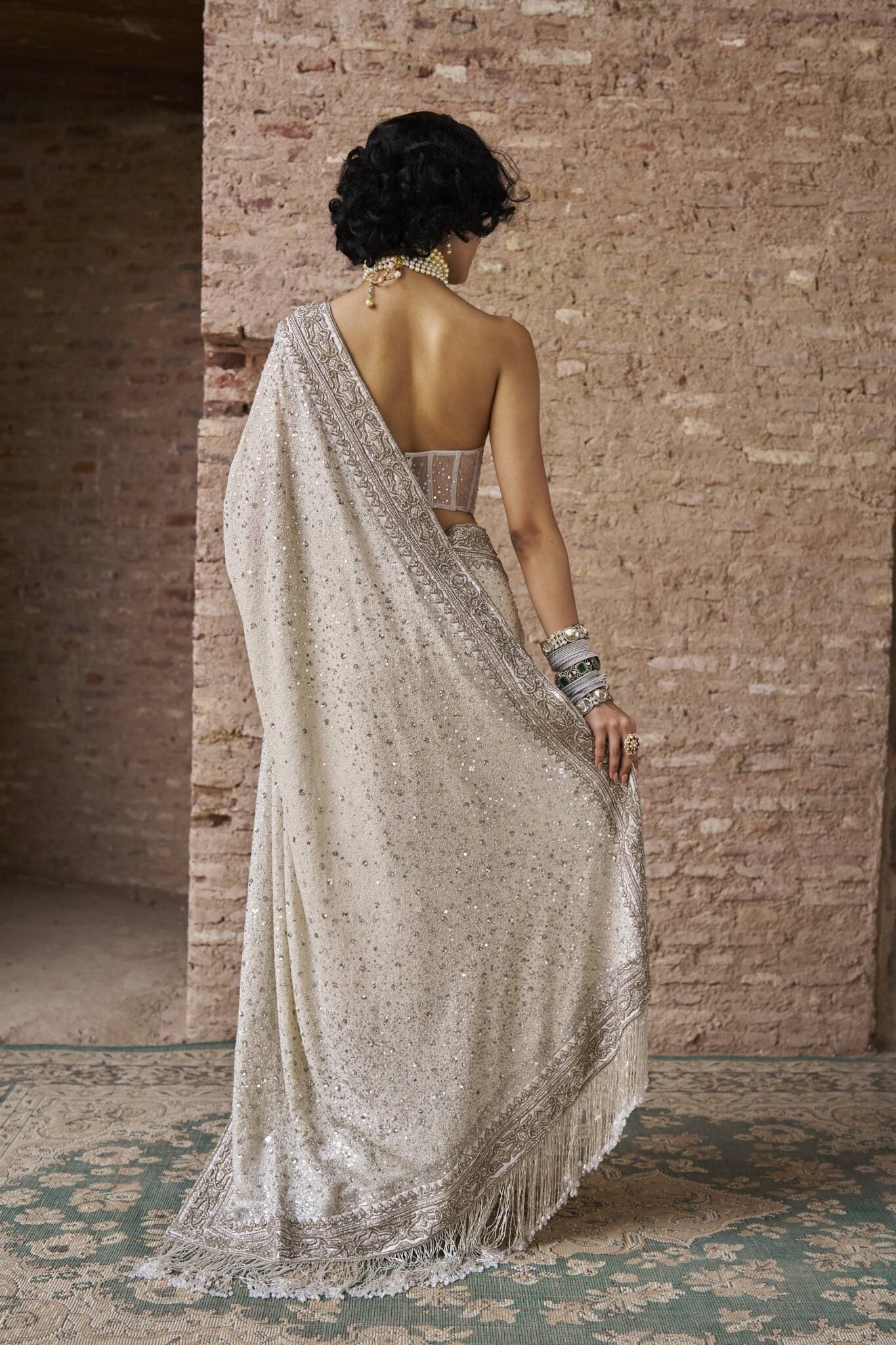 Saree: Ivory 60gm georgette saree with silk thread and lurex aari embroidery in the background with four side heavy hand embroidered border consisting of kora, cut beads and stone work along with dense spray of sequins on the palloos and lighter spray of sequins throughout the saree.