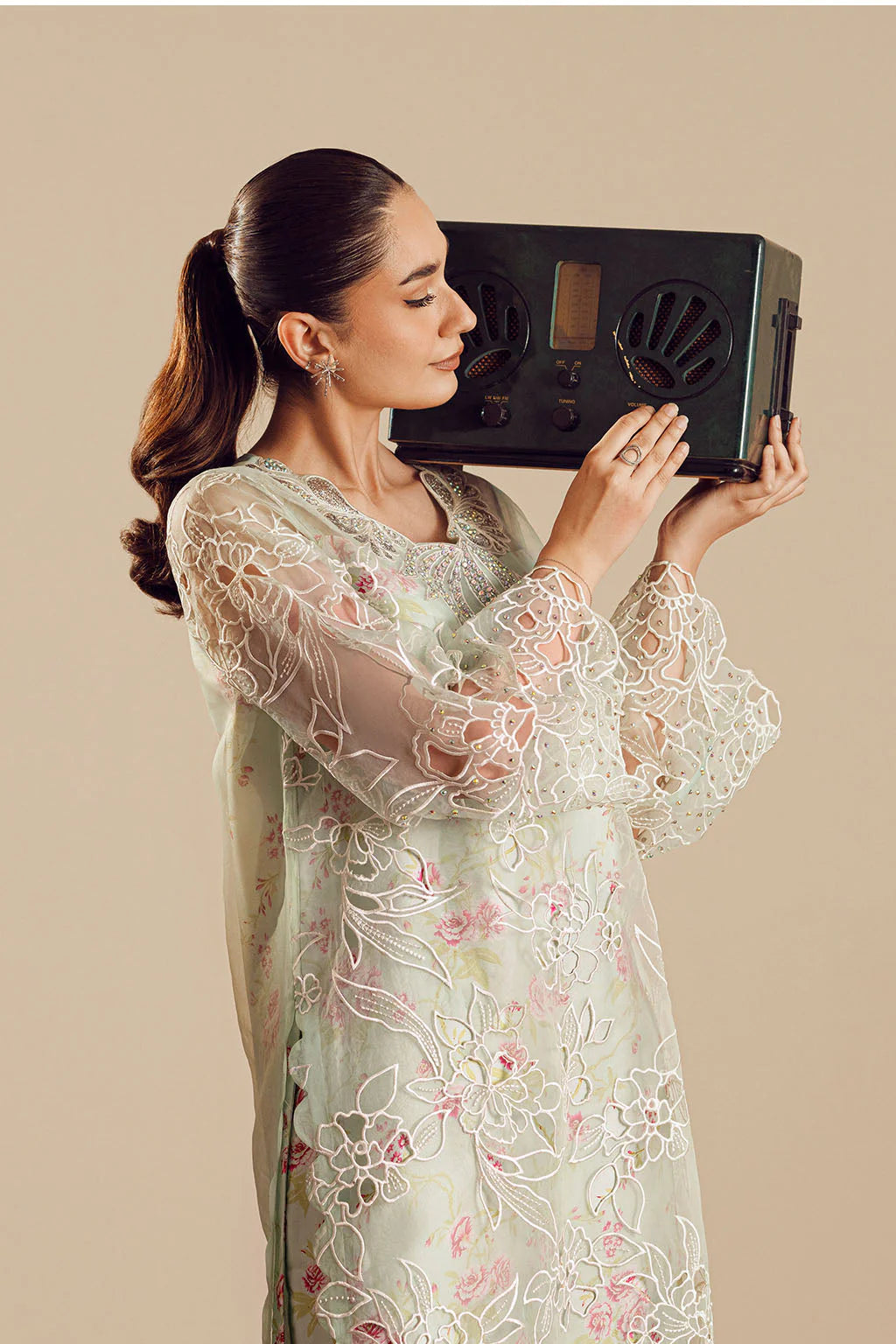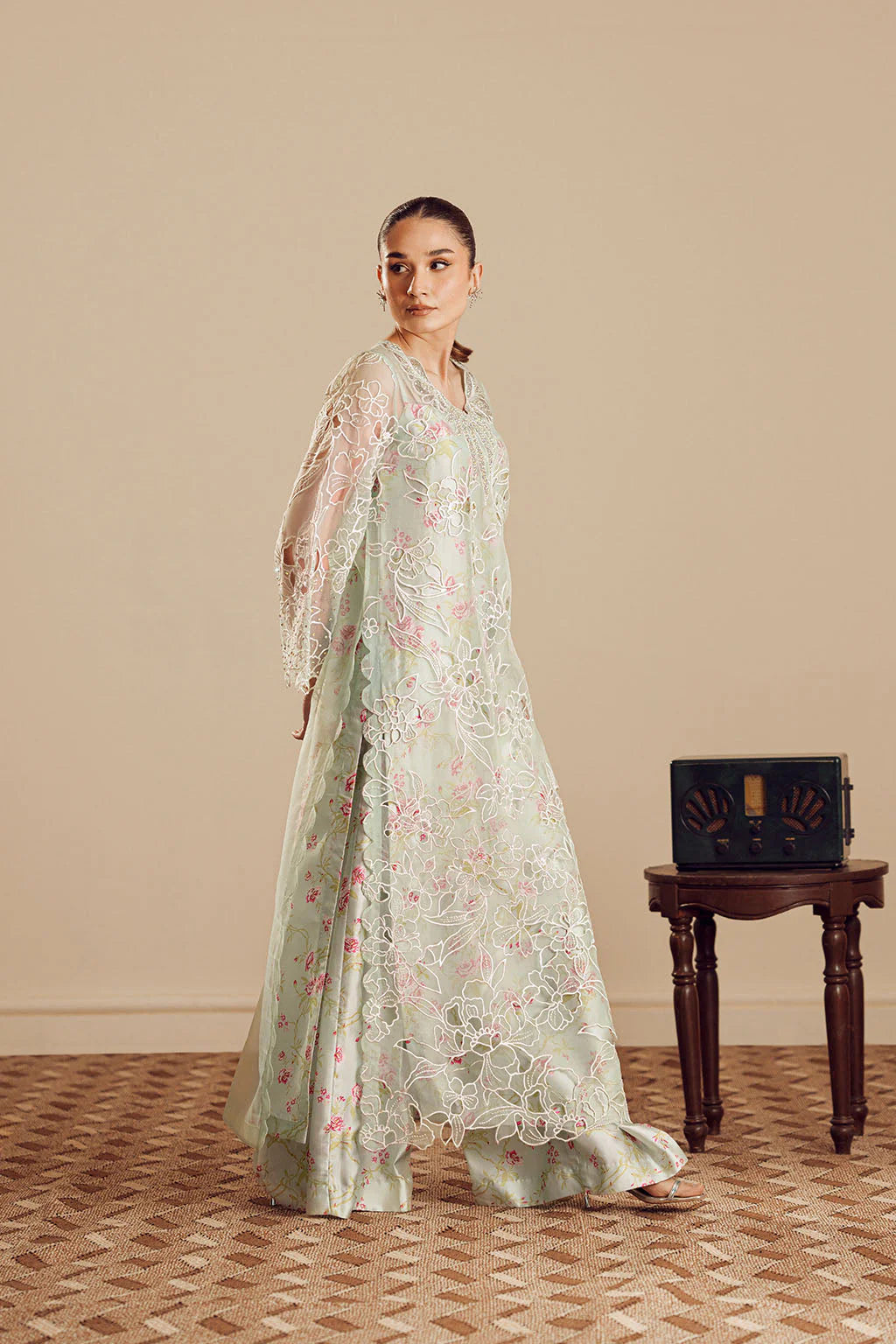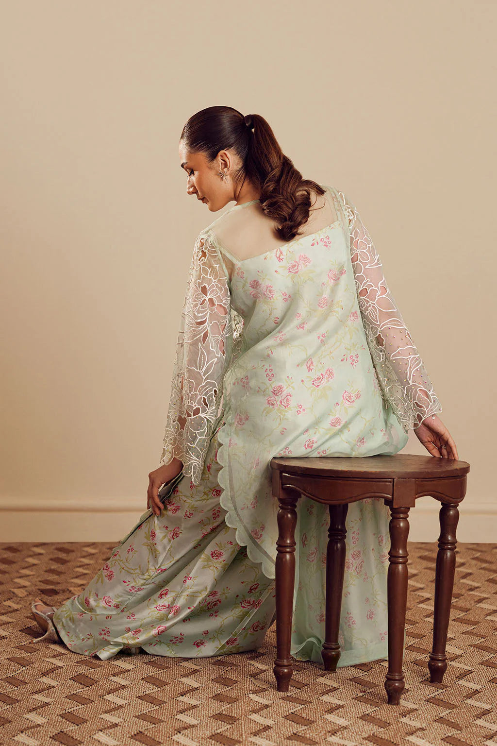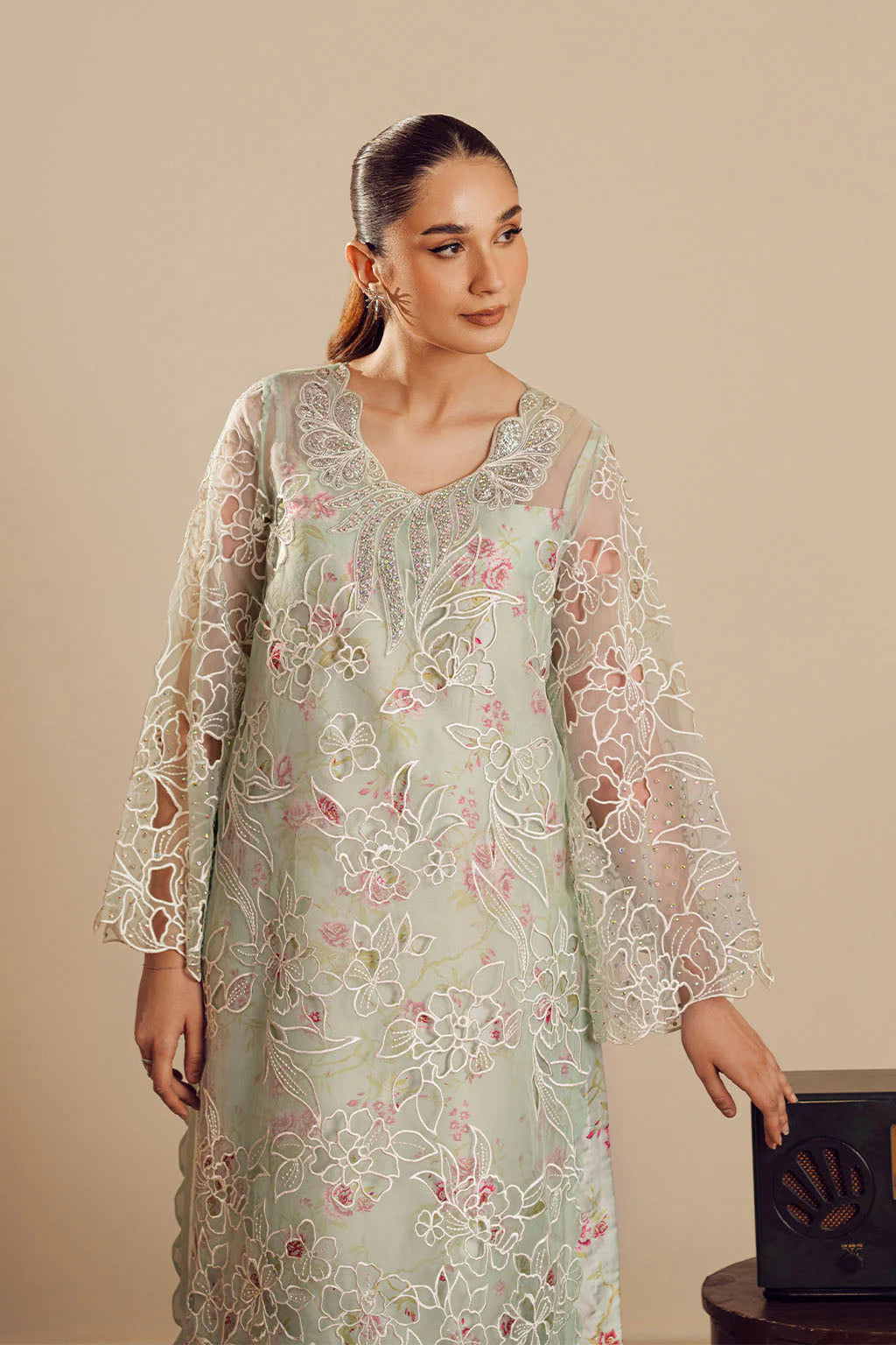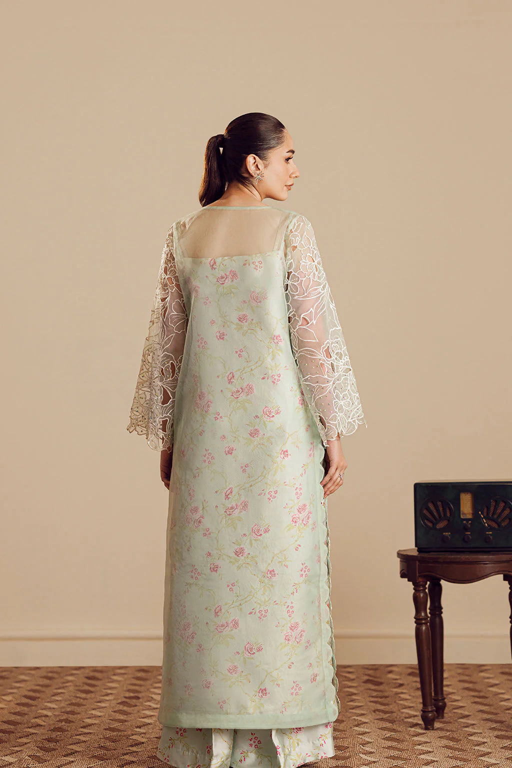 PRINTED CHARMEUSE SILK INNER WITH CUTWORK ORGANZA SHIRT, ELEGANT EMBELLISHMENT ON NECK PAIRED WITH PRINTED FLARED PANTS