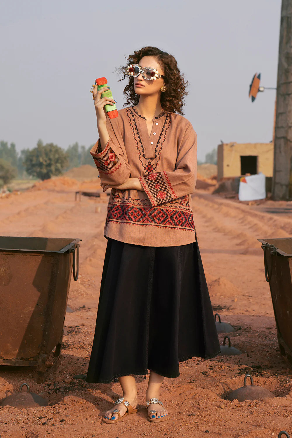 Embrace the warmth of artisanal design with this captivating chocolate brown embroidered woven top. Crafted from a soft, textured woven fabric in a rich, earthy shade, this tunic-style shirt offers a relaxed and comfortable silhouette that drapes beautifully. The piece is meticulously adorned with intricate geometric and tribal-inspired embroidery in deep red, black, and cream threads. This detailed work frames the V-neckline and button accents, and features a prominent, eye-catching embroidered band across the waist and wide, full-length cuffs. With its flowing sleeves and classic details, this top is a perfect blend of traditional craftsmanship and modern bohemian style, making it an ideal choice for a stylish, laid-back look.