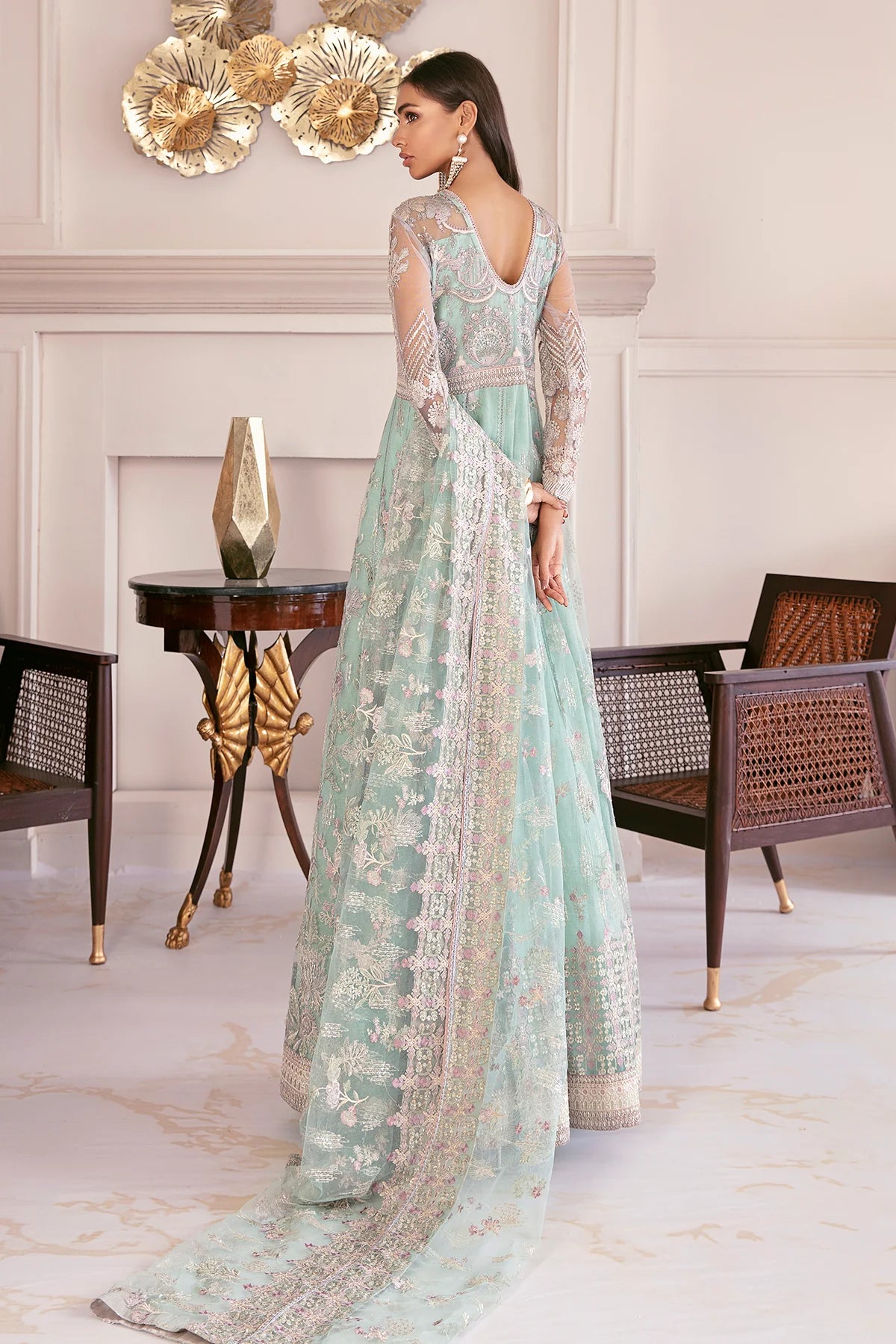 A classical 3-piece light sea-green net ensemble to curate an elegantly ravishing style statement. The blouse has intricate embroidery on the front along with a plain back. The touch of silk is introduced to elevate the luxurious vista. The proficiently crafted embroidery embellishes the dupatta, while the intermingling shades exude the subtle aura of sophistication. A dyed silk trouser completes the outfit. If you decide to curate your own style statement, go with the unstitched option. Otherwise let us stitch a perfection for you. Just let us know whether you want a saree or a frock.