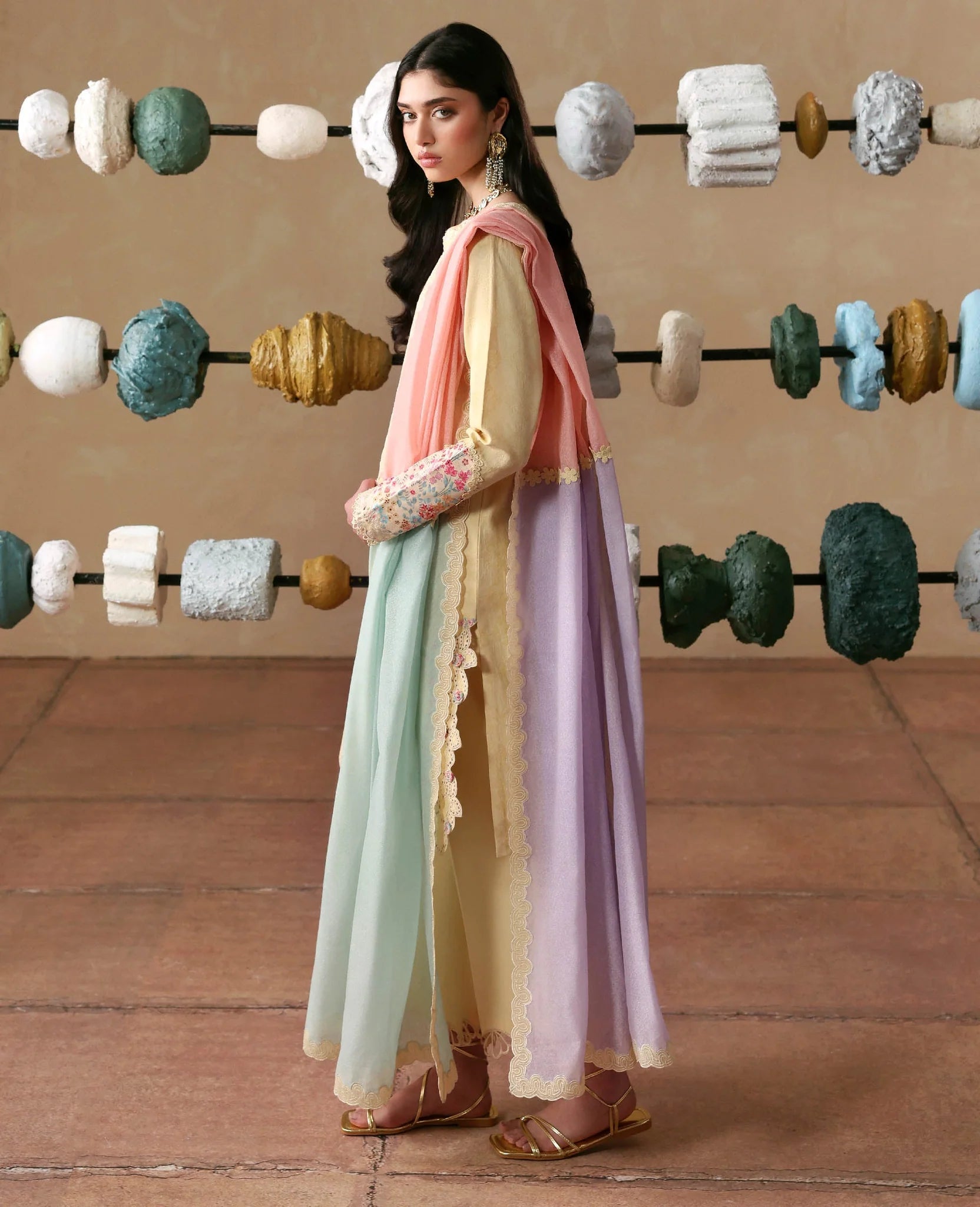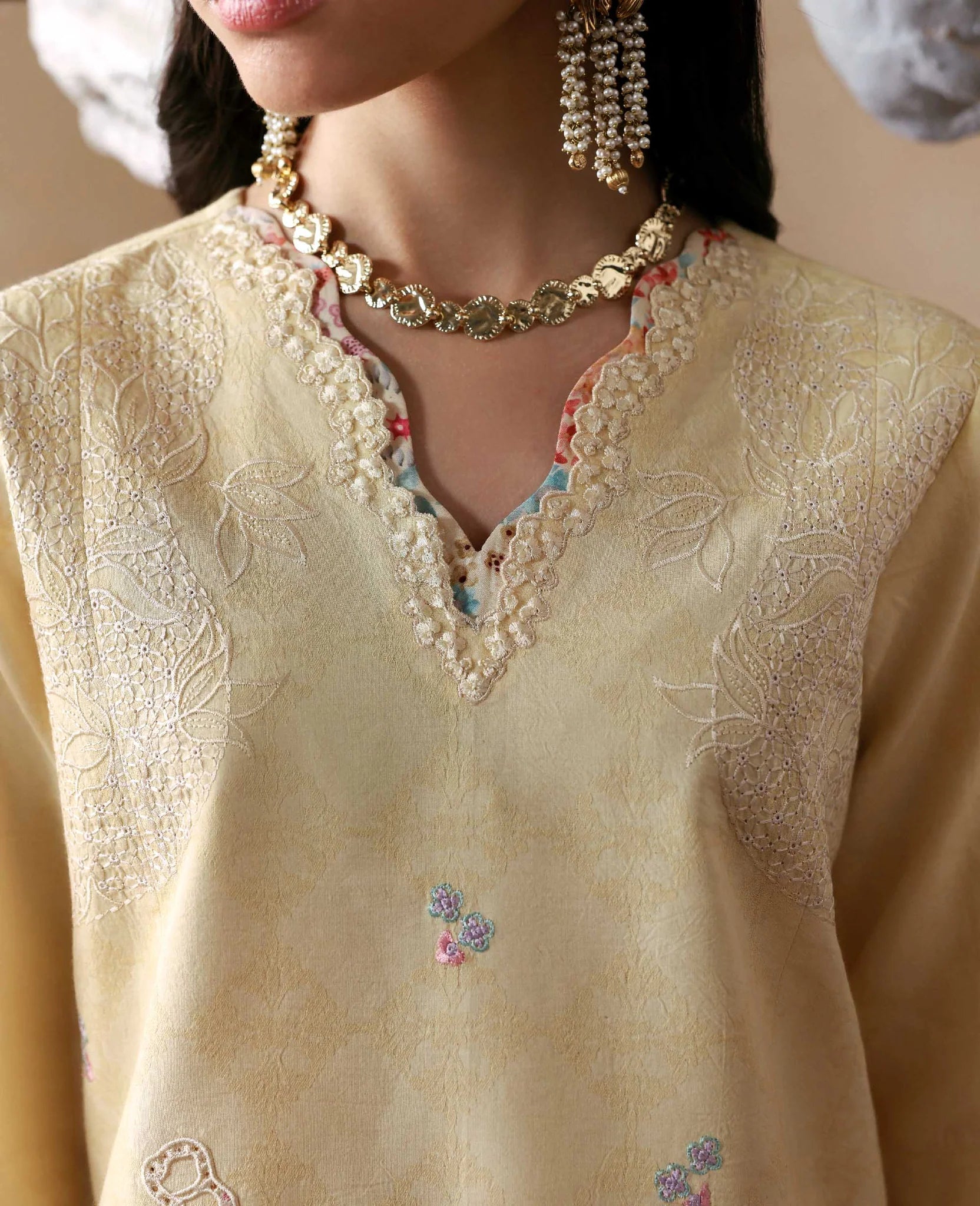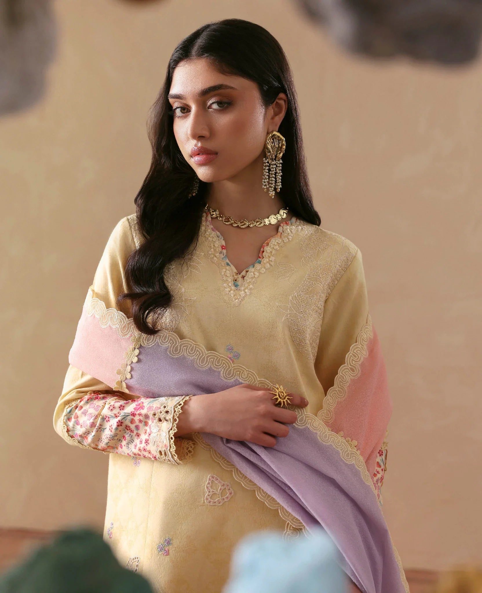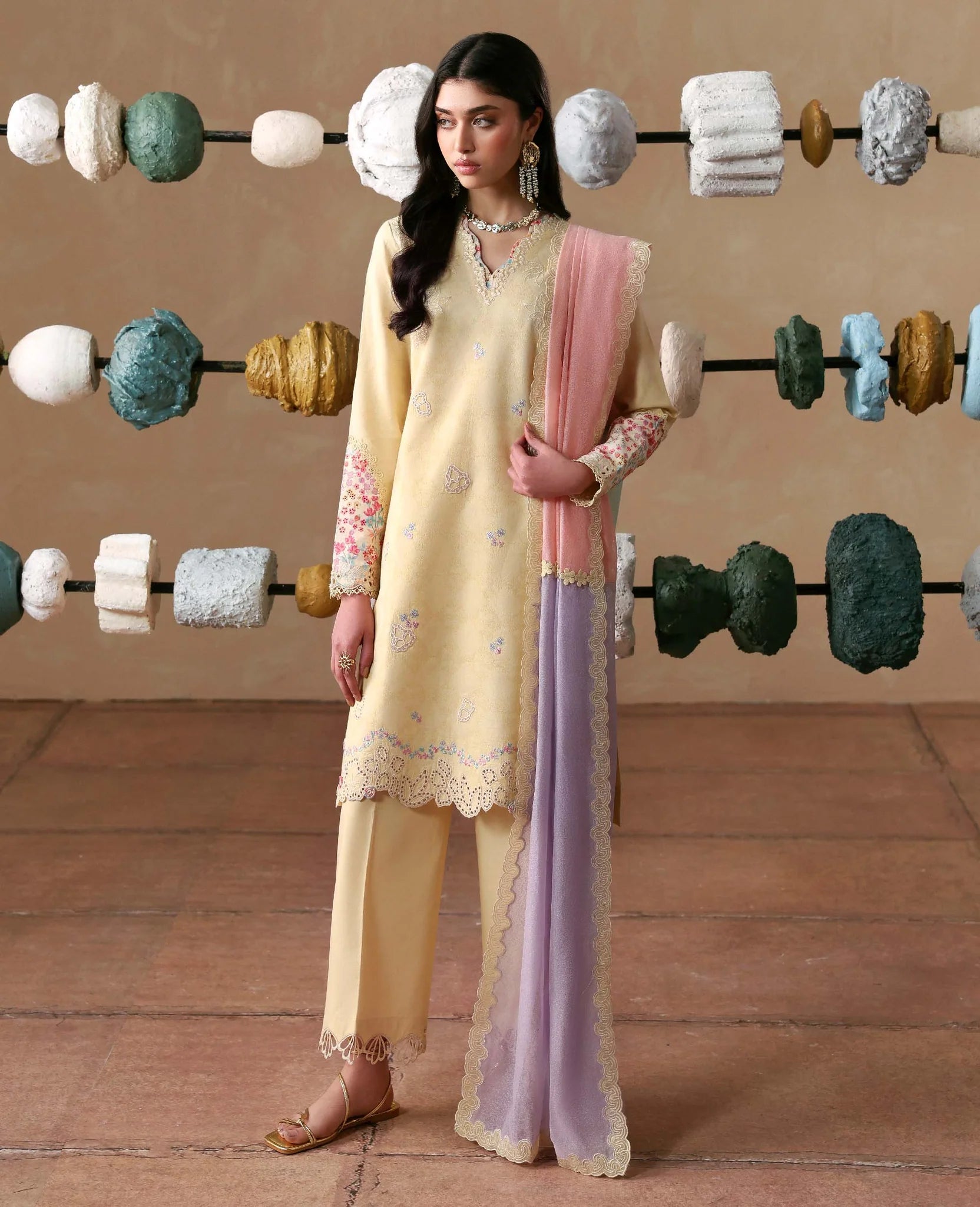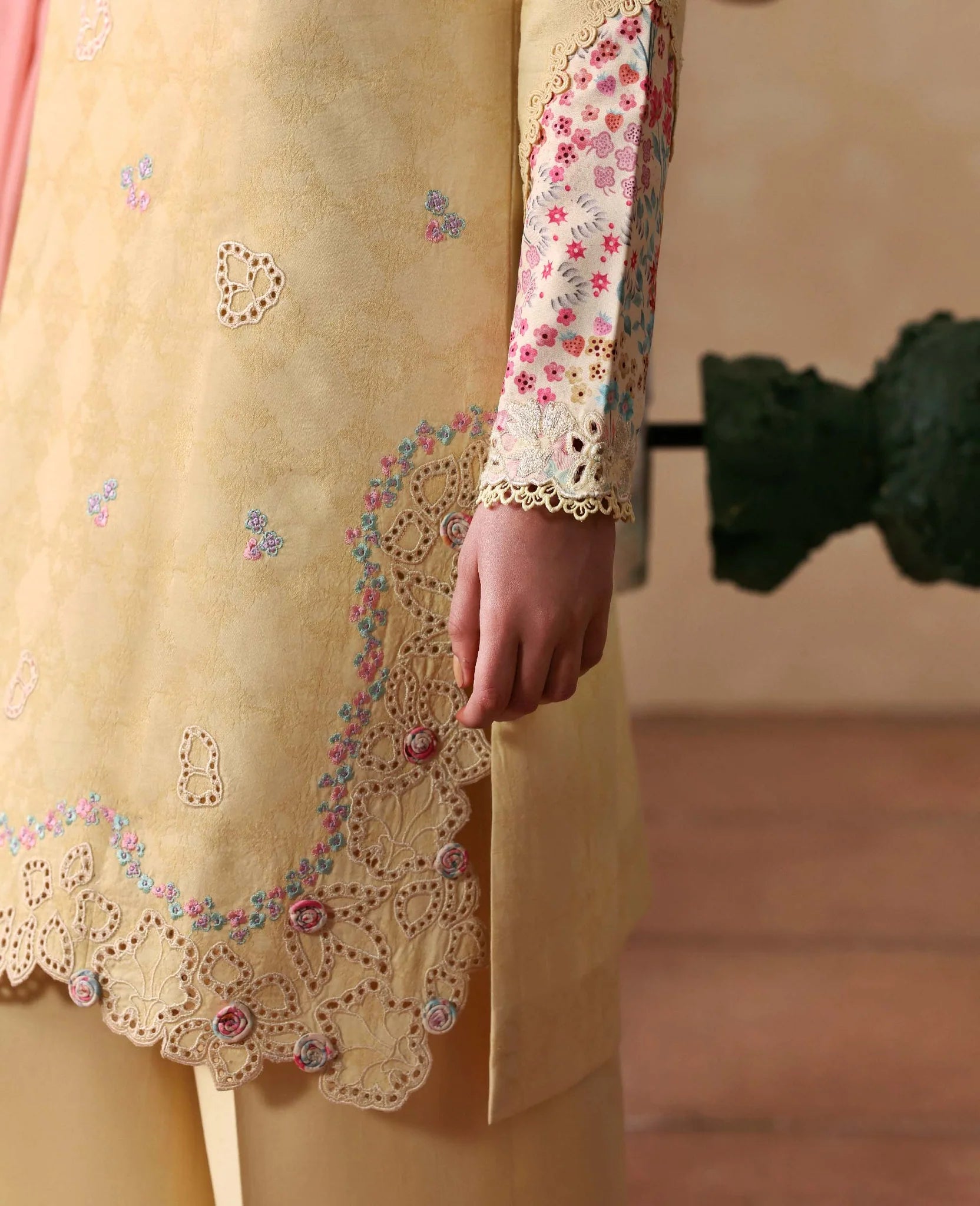Ciel in a fresh Corn Yellow hue. Elegantly tailored short jacquard shirt with delicate boring finishings, pastel embroidery and intricate cutwork details. Subtle printed elements add depth without overpowering the look. Paired with wide-leg cambric culottes finished with refined embroidery along the hem, and a soft 3-tonal slub monar dupatta in gentle pastels for the perfect breezy summer feel.