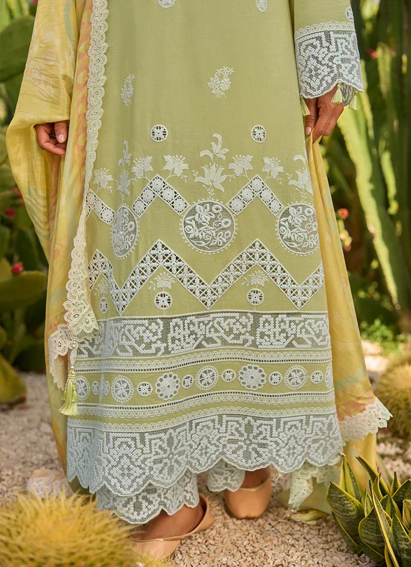 Fresh and luminous in a soft lime yellow hue, this unstitched pure cotton lawn shirt is detailed with delicately embroidered white motifs scattered across the fabric for a light, graceful feel. The design is elevated with intricate borders featuring geometric and floral patterns that add depth and refinement to the overall look. Paired with a pure cotton cambric trouser and a fluid pure silk dupatta, the ensemble feels airy, breathable, and effortlessly elegant. Perfect for refined summer dressing with a fresh, sunlit charm.
