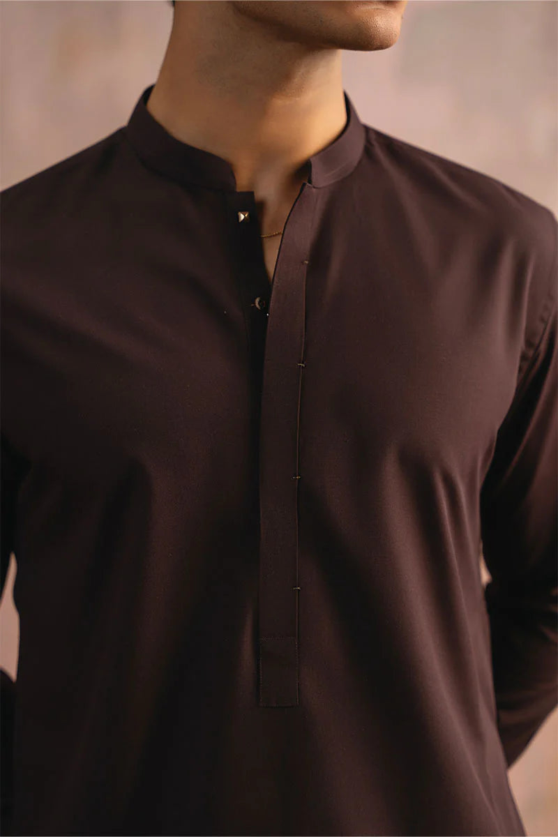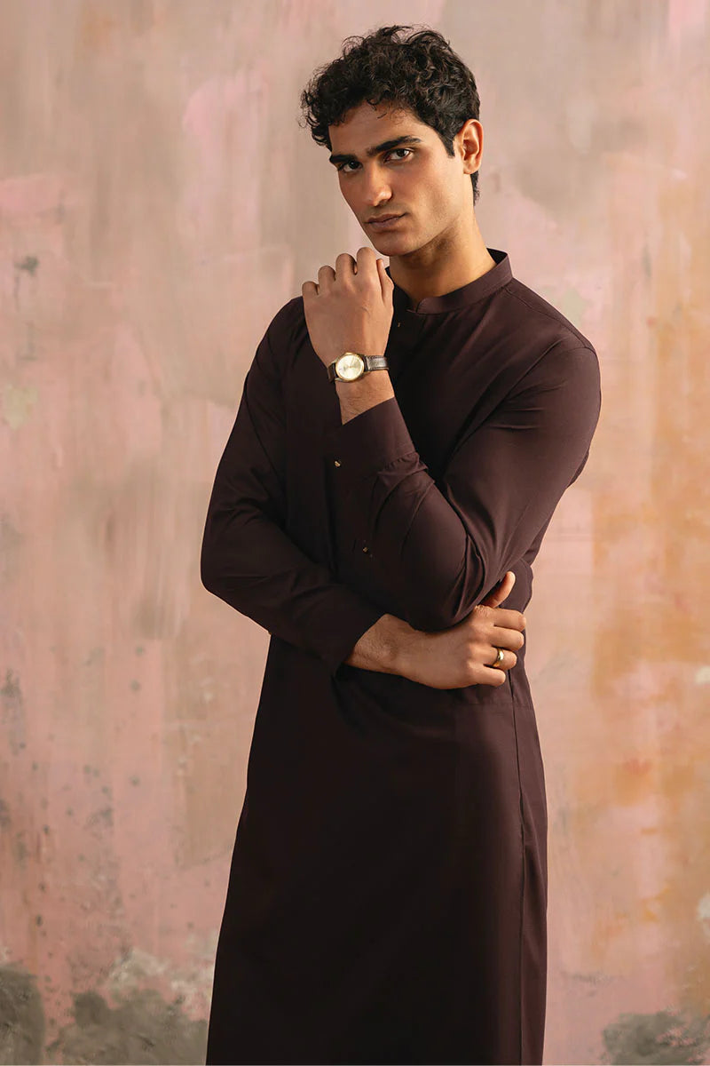 Classic burgundy shalwar kameez with wooden button closures, round band collar and square cut cuff detailing.