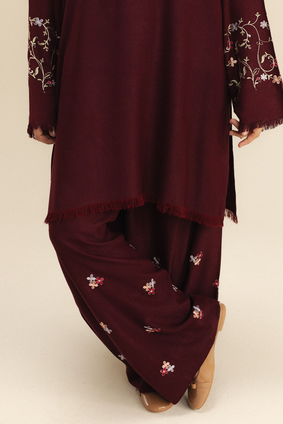 A rich burgundy wool peach short shirt detailed with intricate floral embroidery on the sleeves and neckline, paired with a farshi shalwar featuring matching floral motifs.