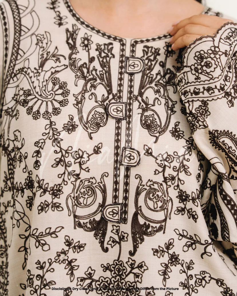 A pashmina cream embroidered kurta paired with matching skinny shalwar, featuring intricate brown aari work. It’s styled with an brown shawl edged in detailed cream embroidery, adding a rich and elegant contrast.