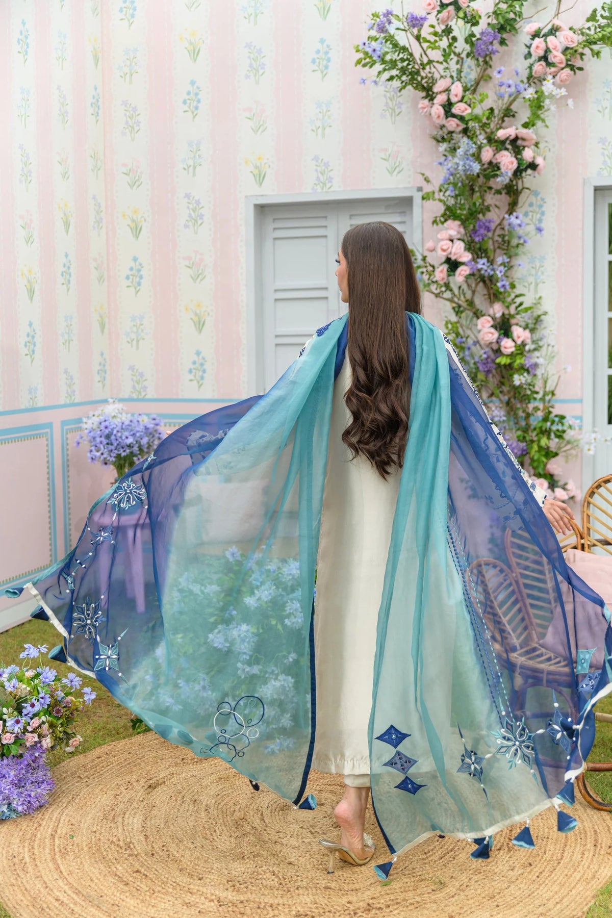 A breath of fresh elegance from our Zarayna Festive Formal Collection, Coconut Frappe is a graceful summer ensemble in a soft, off-white pearl hue. The long silhouette is exquisitely embellished with intricate appliqué detailing and delicate mirror work, brought to life in serene shades of blue and green. Paired with straight pants for a timeless look, the ensemble is elevated by a two-toned pure kittan organza dupatta, adorned with fine machine embroidery that adds a light, ethereal charm — making it the perfect choice for the season’s refined celebrations.