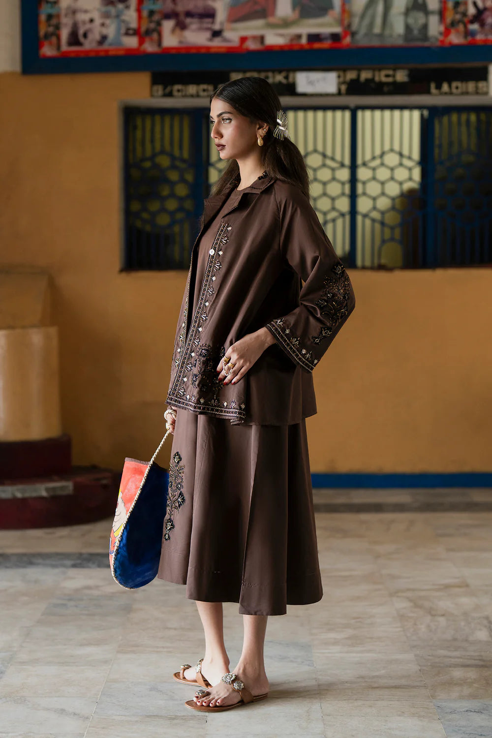 Make a timeless, sophisticated statement with this gorgeous ensemble. This two-piece set includes a flowing, midi-length dress and a complementary jacket. Both pieces are crafted in a rich, solid coffee brown fabric. The dress is simple and elegant with a gentle flare, allowing the jacket to take the spotlight. The unfastened jacket is beautifully adorned with intricate embroidery and subtle embellishments in gold and black, featuring ornate floral and geometric motifs running down the front panels and around the cuffs. This coordinated outfit offers a luxurious layered look perfect for events where subtle opulence is key.