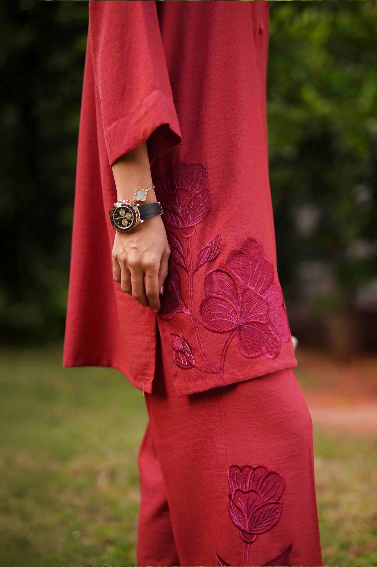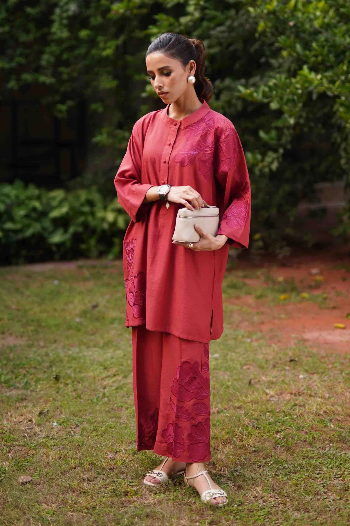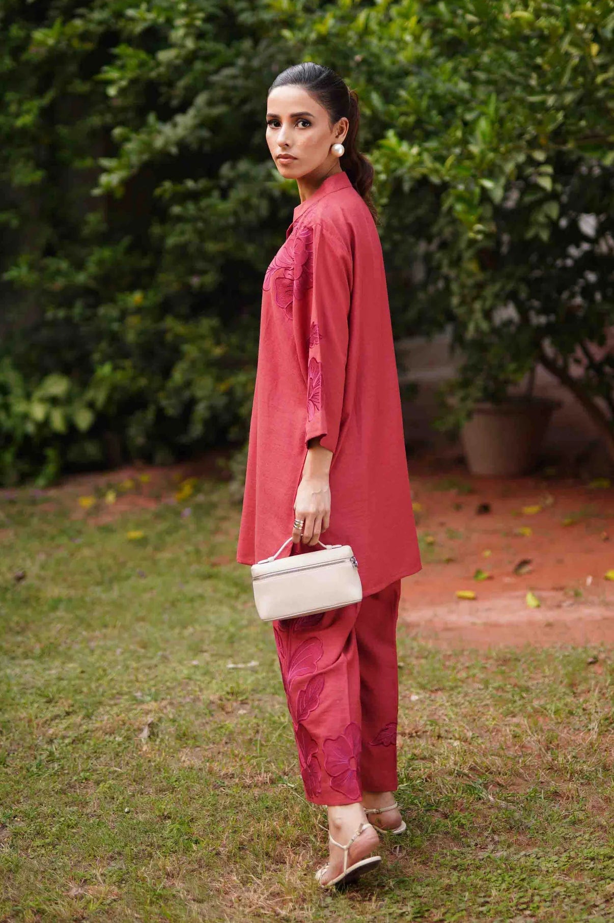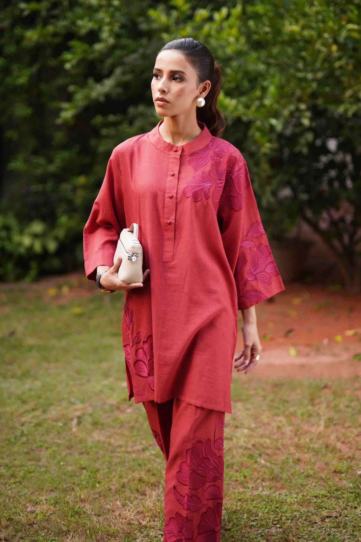 A deep rust co-ord set featuring a straight kurta with relaxed wide sleeves, adorned with tonal appliqué floral embroidery placed asymmetrically, gracing the right hem and extending from the left upper bodice to the shoulder and sleeve. The kurta is finished with a round neckline and a buttoned placket. Paired with straight trousers detailed with matching embroidered motifs throughout, this ensemble blends refined craftsmanship with effortless sophistication.