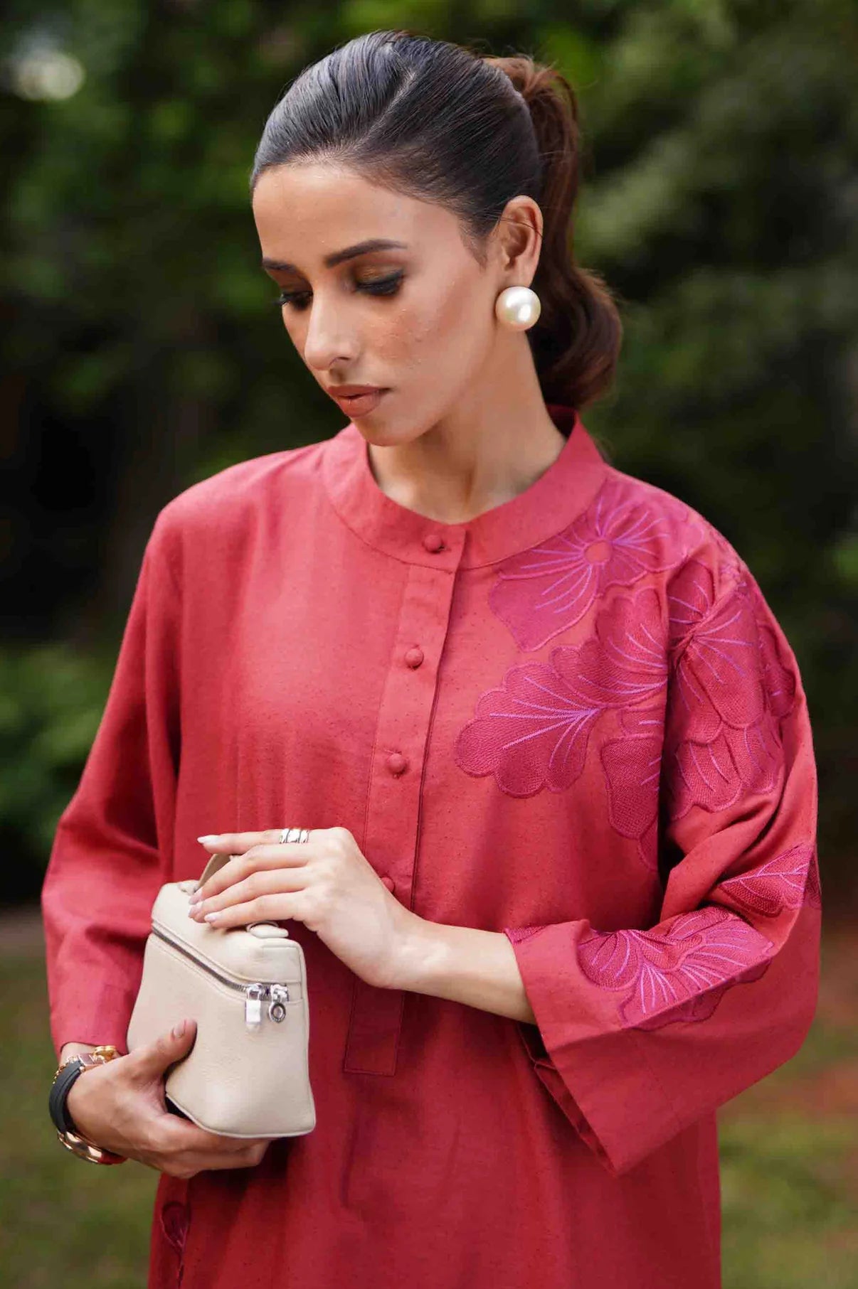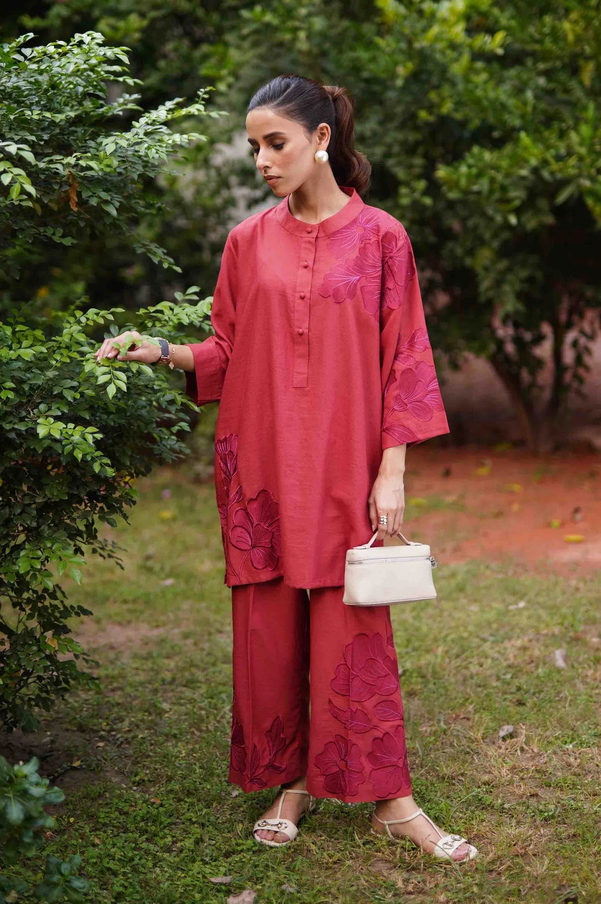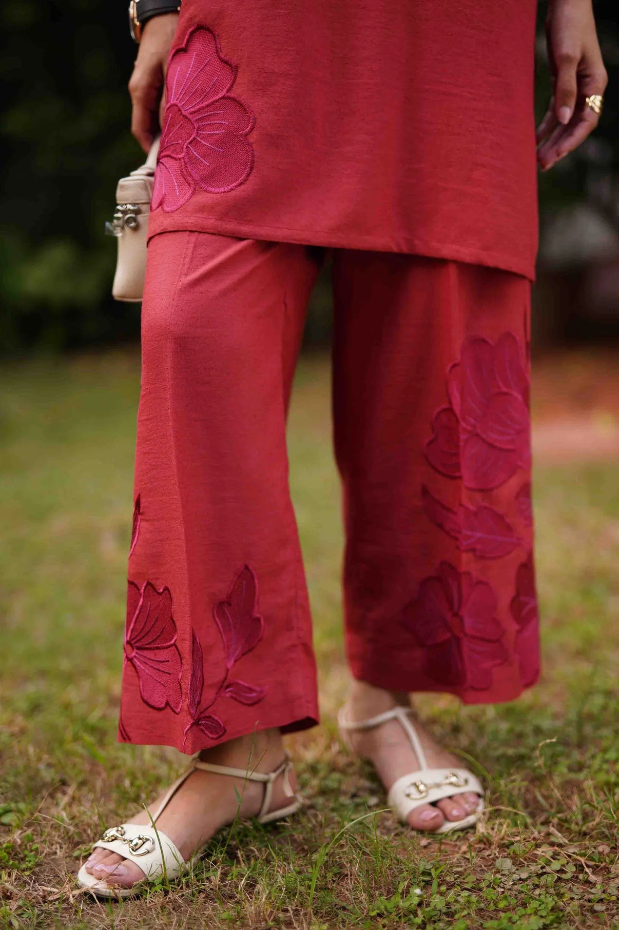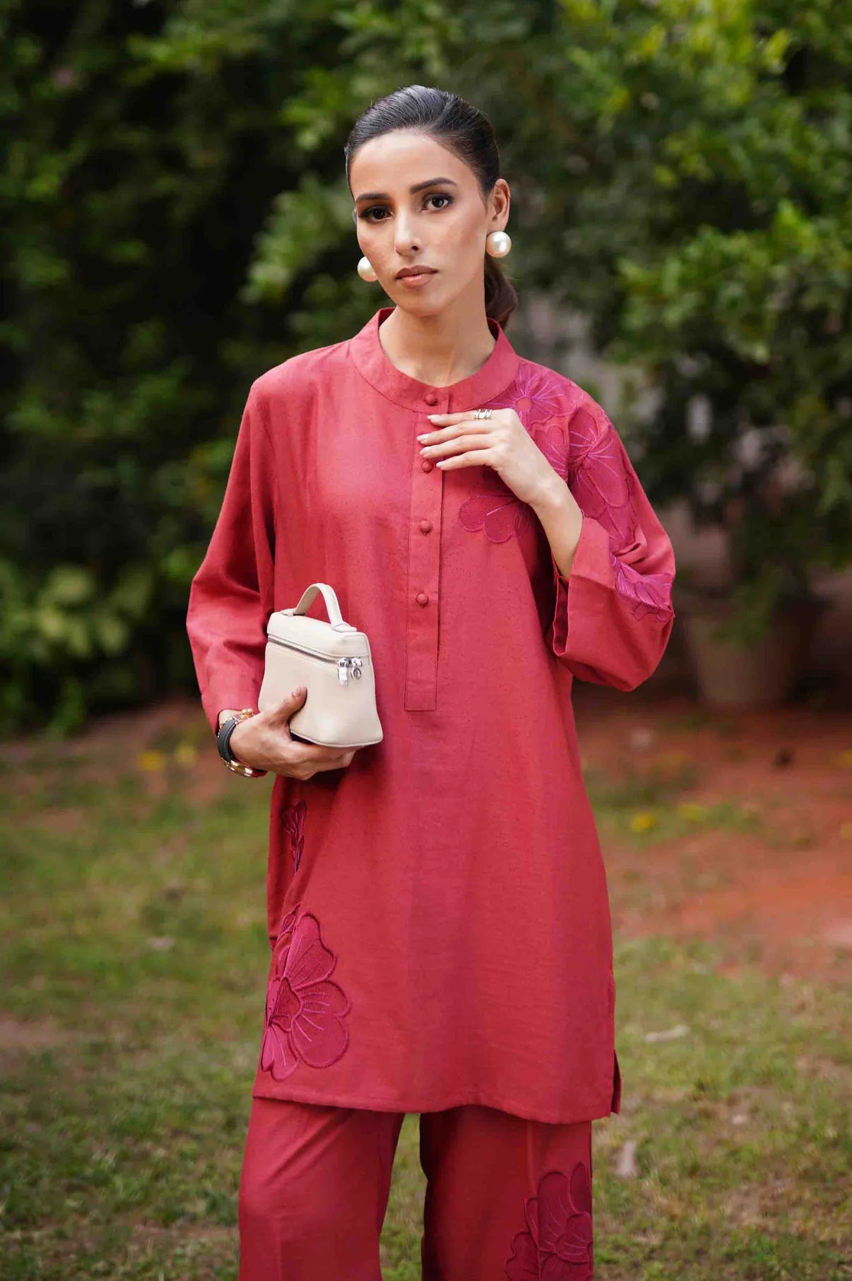 A deep rust co-ord set featuring a straight kurta with relaxed wide sleeves, adorned with tonal appliqué floral embroidery placed asymmetrically, gracing the right hem and extending from the left upper bodice to the shoulder and sleeve. The kurta is finished with a round neckline and a buttoned placket. Paired with straight trousers detailed with matching embroidered motifs throughout, this ensemble blends refined craftsmanship with effortless sophistication.