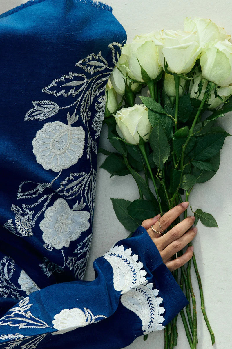 The long kameez comes in a rich cobalt blue, adorned with intricate all-over embroidery and further enhanced with appliqué detailing along the front and hem. It is paired with cropped wide-hem pants featuring embroidery that adds a modern edge to the traditional silhouette. The look is finished with a dupatta designed with appliqué accents, completing the outfit with refined charm.