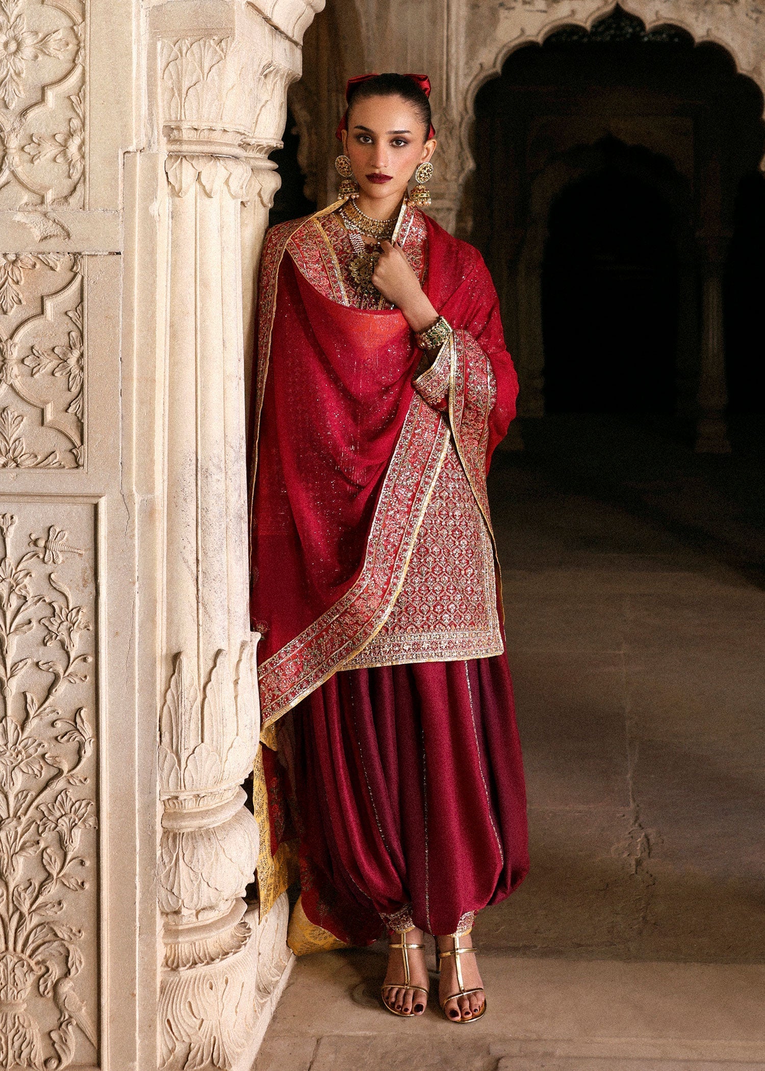 Cherry red raw silk shirt with heavily embroidered front and back, and embellished sleeves and tassels. Paired with panelled harem pants in light and dark tones with embroidered inserts. Completed with a matching chiffon embroidered dupatta finished with organza borders and mustard yellow Chindheri silk trims on all four sides.