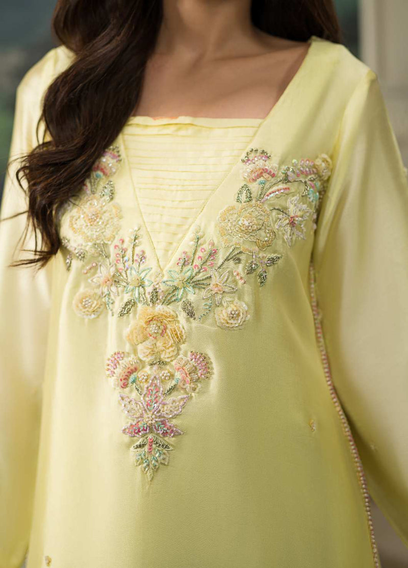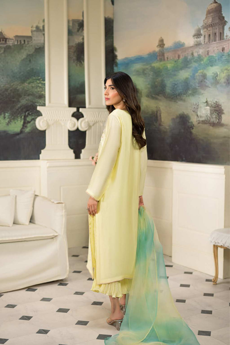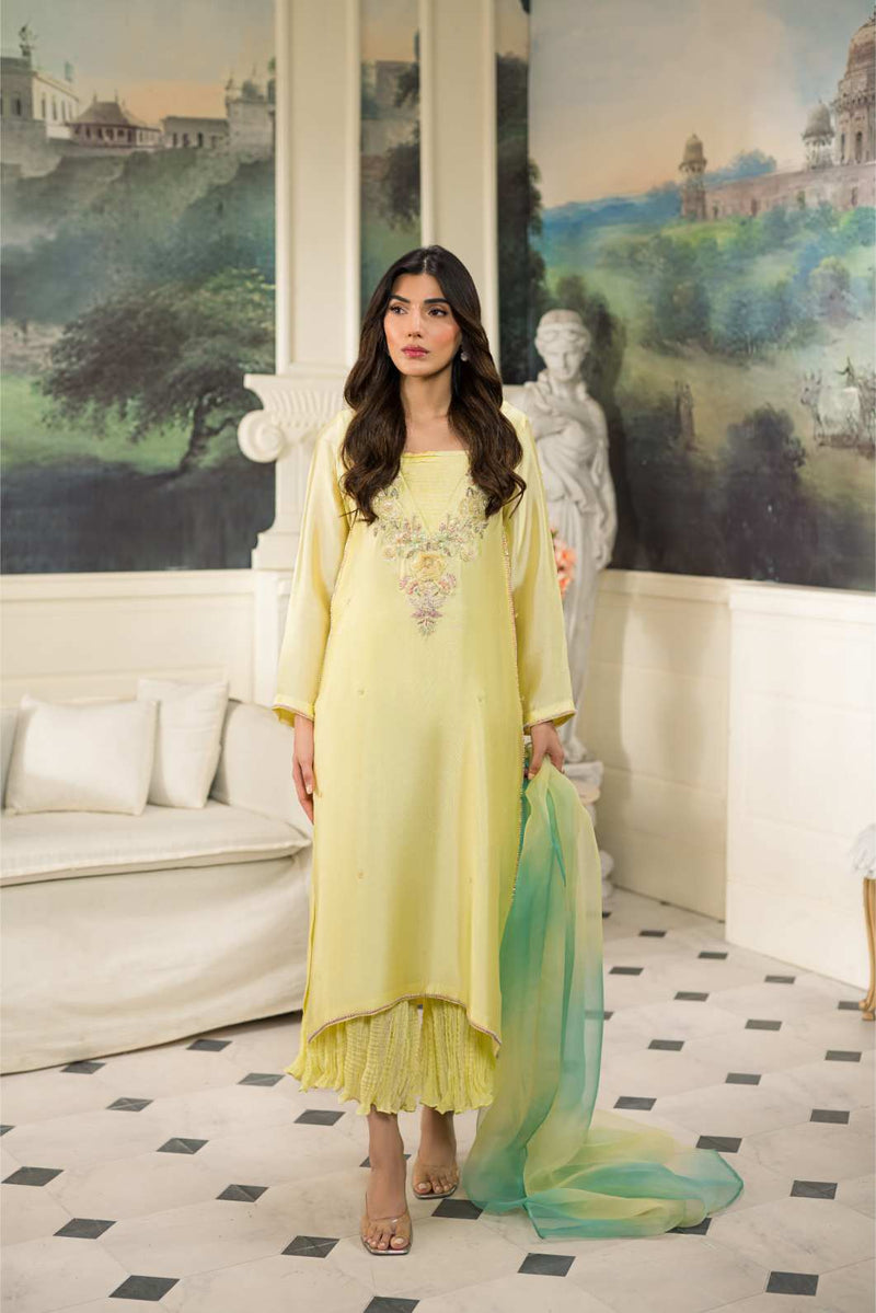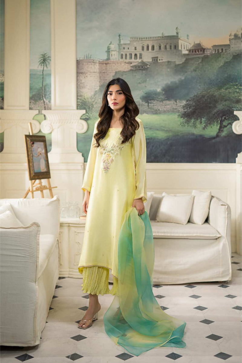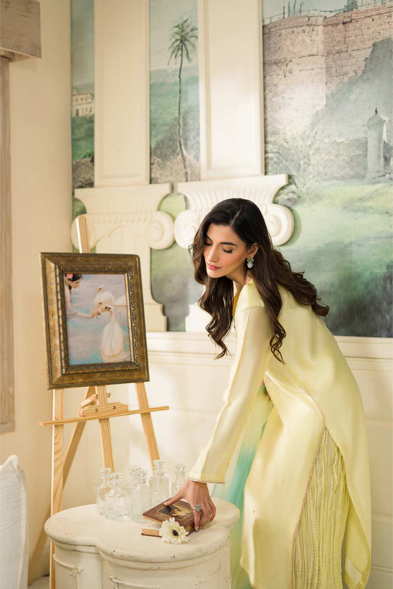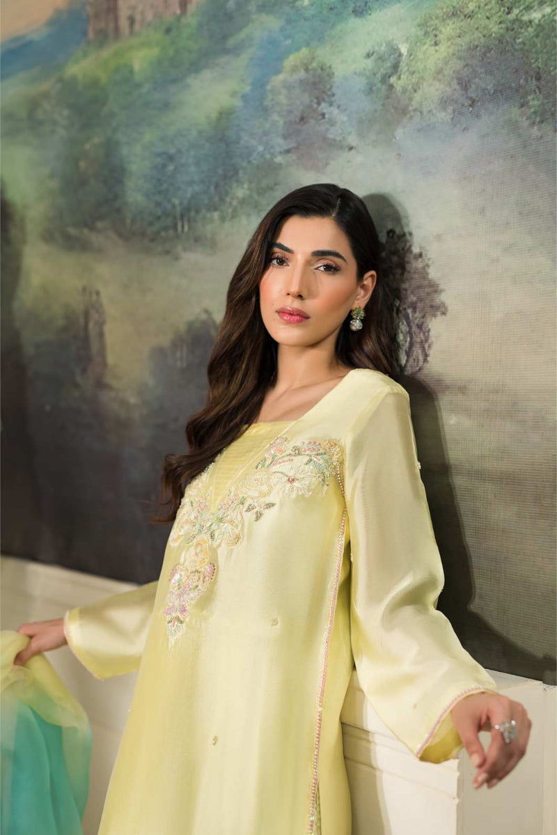 Sequins, crystals, pearls , kora and dabka in pastel tones. This look is completed by adding crushed cropped pants paired with pure organza two tone duppata.