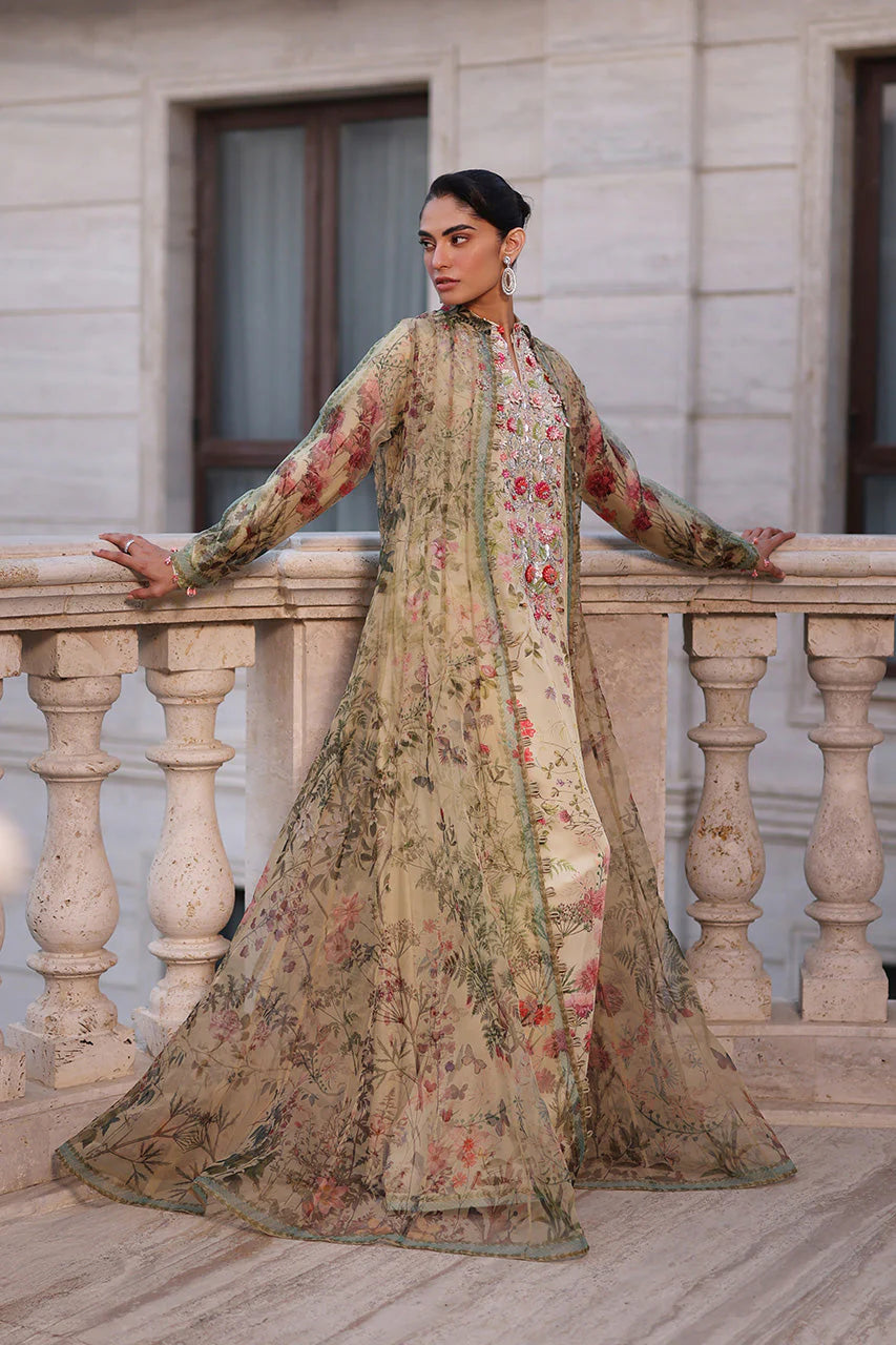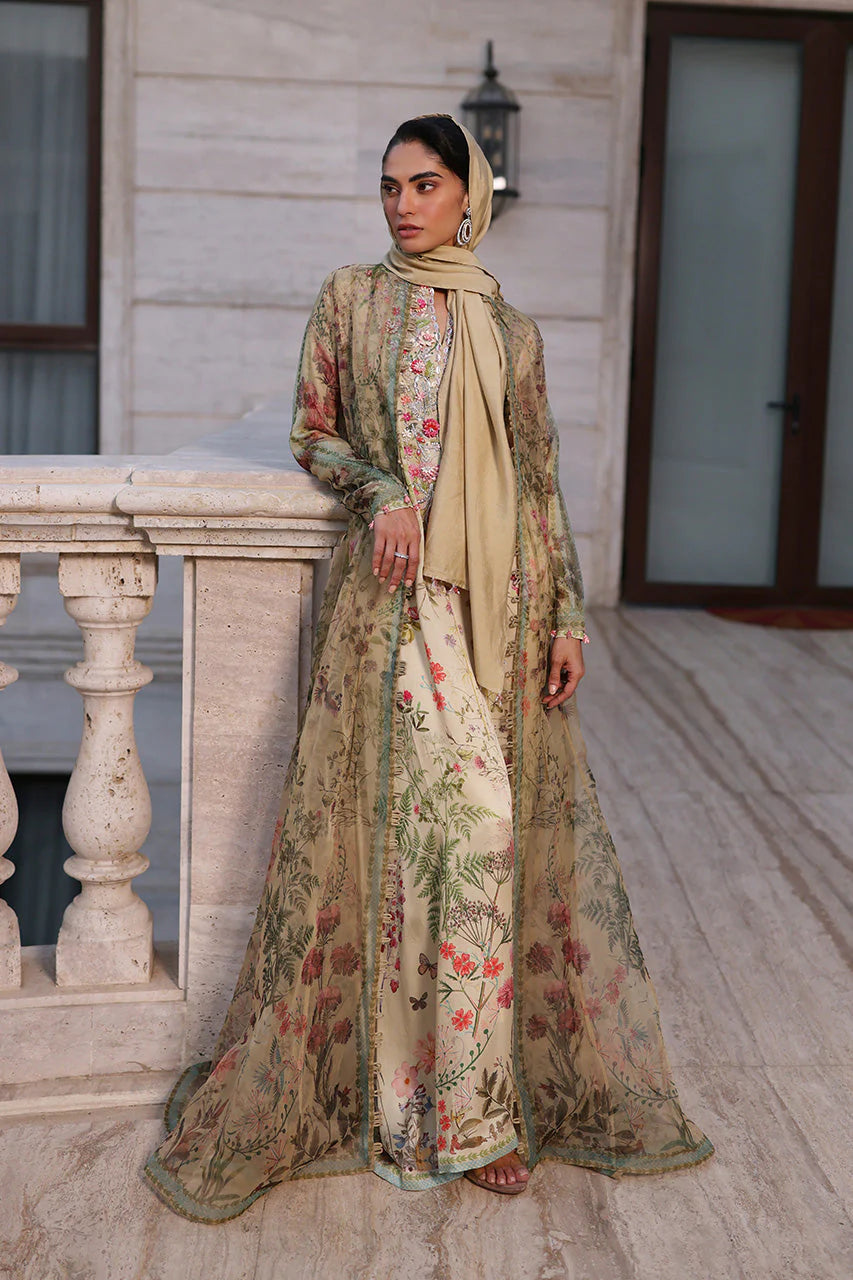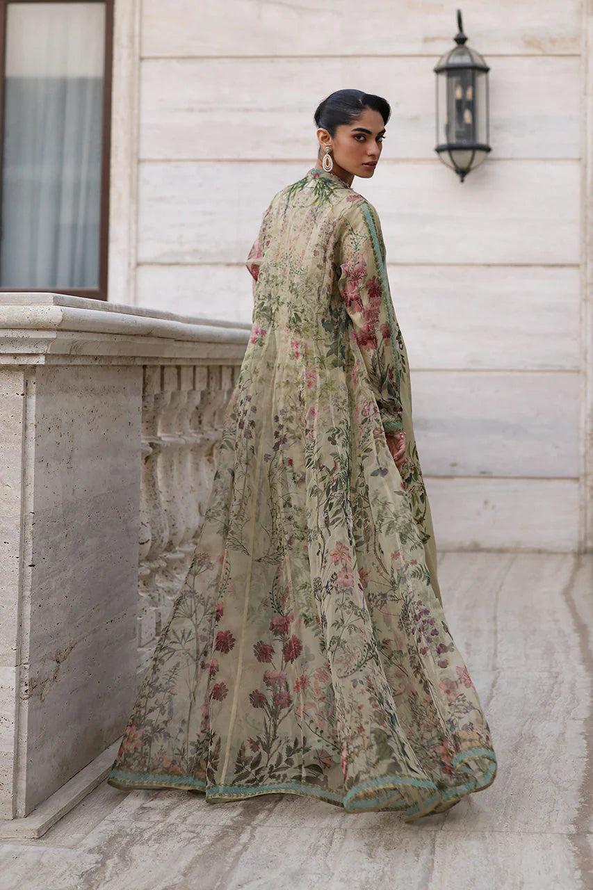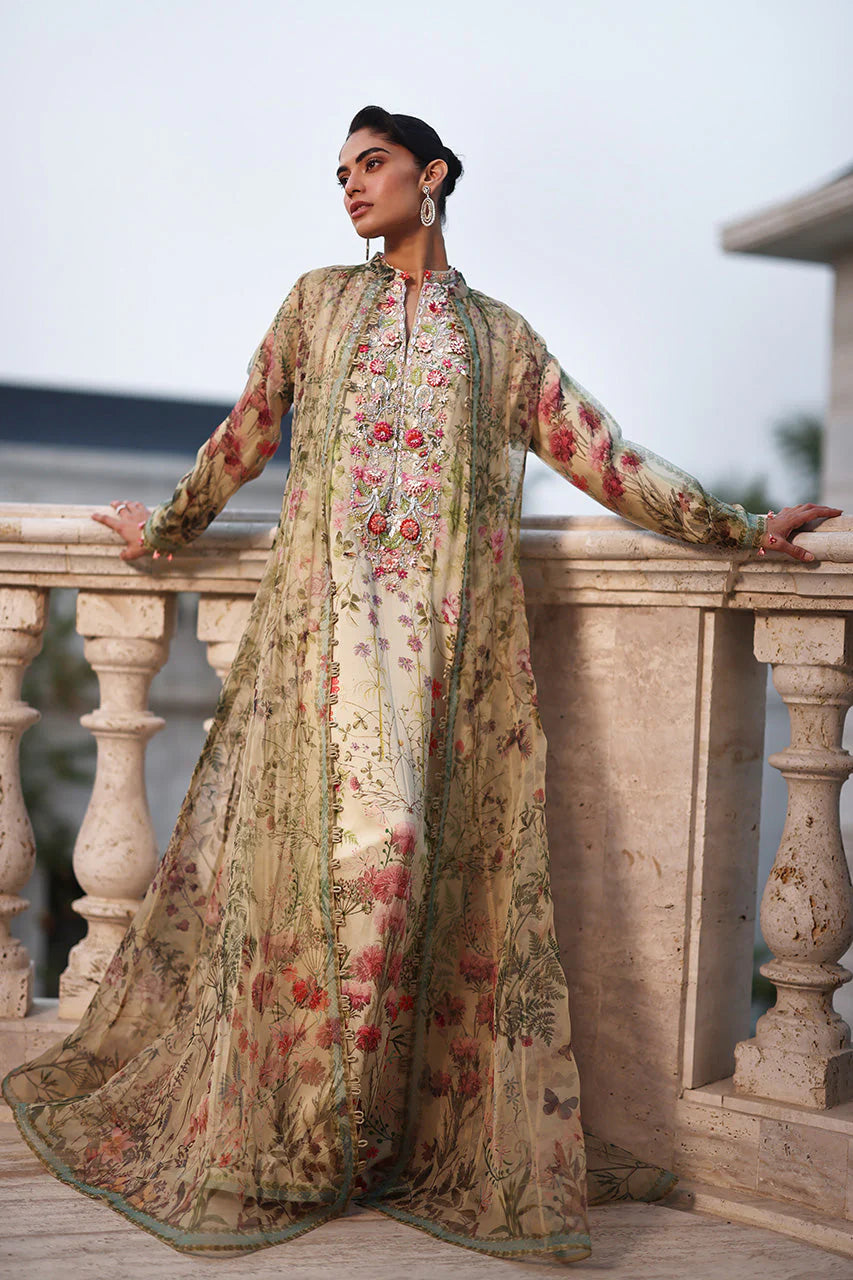 Print and handwork move in quiet harmony across this sage green ensemble. The printed organza kalidar jacket floats with painterly botanics drifting over its sheer surface, framed by darker green trims and fabric loops that trace the front seam. Floral tassels at the sleeves add a soft, tactile finish. Beneath, a printed silk kaftan sparkles, its neckline delicately adorned with floral embroidery in silver and blush tones, enriched with sequins, zardozi, beads, and crystals. A matching khaddi silk shella, finished with floral tassels along the pallus, completes the ensemble with ease.