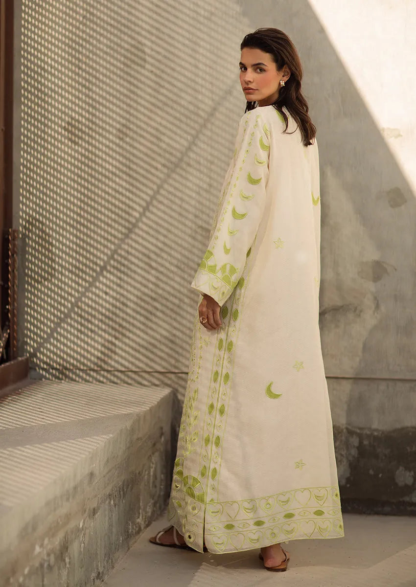 A kaftan that captures celestial charm with a modern gaze, Dahlia is crafted in sheer ivory khaddi corduroy and hand-embroidered with crescents, palms, suns, and delicate florals. Applique and eyelet accents unfold like a dream across its length, creating an ethereal narrative of artisan craftsmanship.