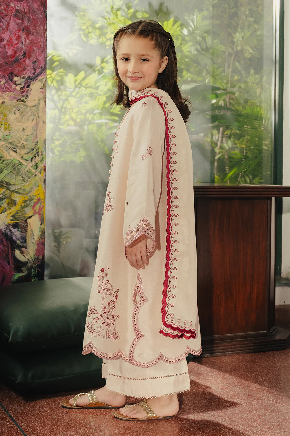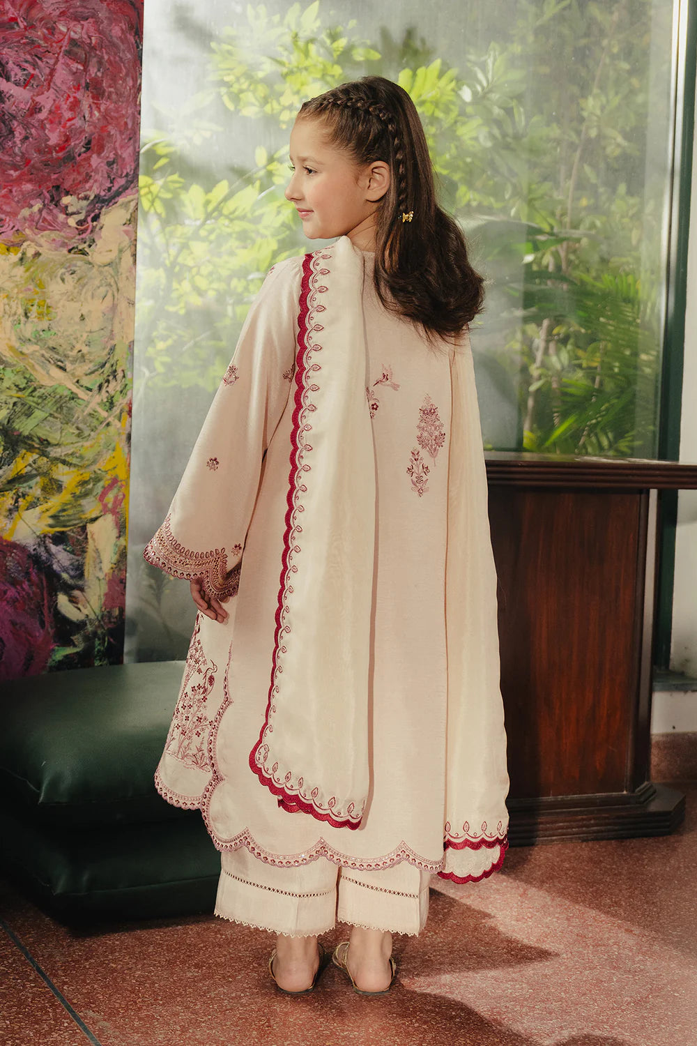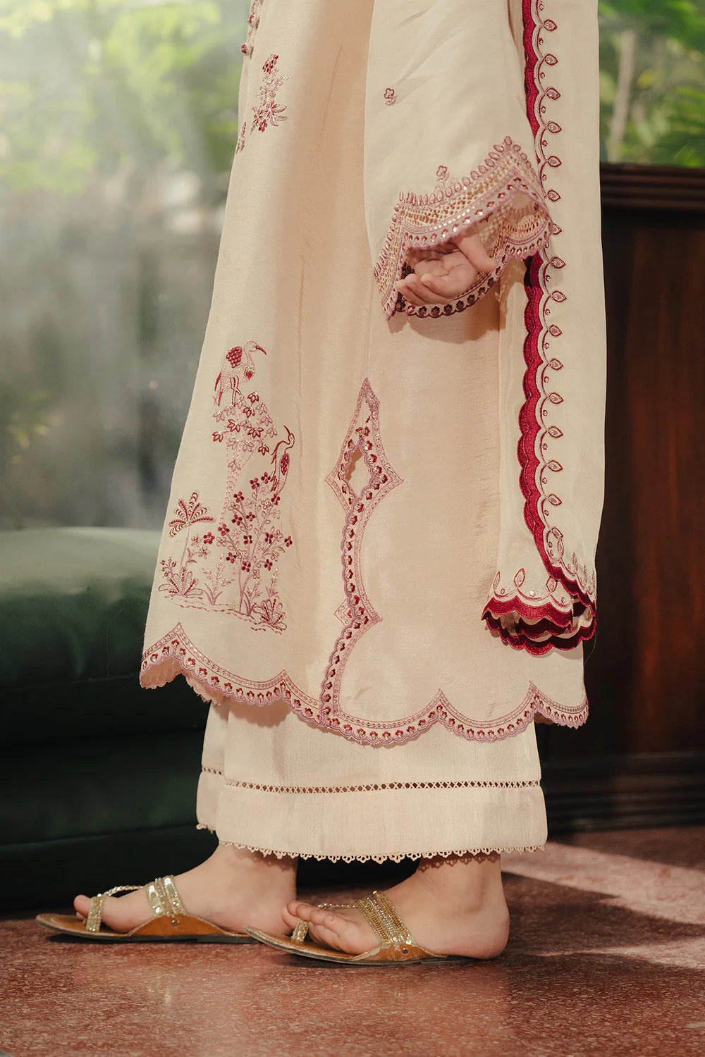 This ivory set features an embroidered shirt with delicate cutwork detailing along the hem and sleeves, paired with straight pants and an embroidered silk dupatta.