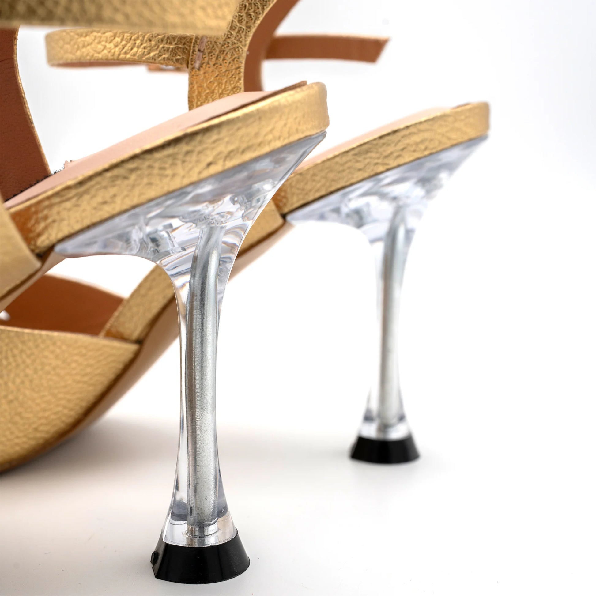 Darina pairs a rich gold finish with a sculpted heel and a bold metallic floral accent at its forefront. Its secure ankle strap and textured surface make it an enviable choice for the festive season.