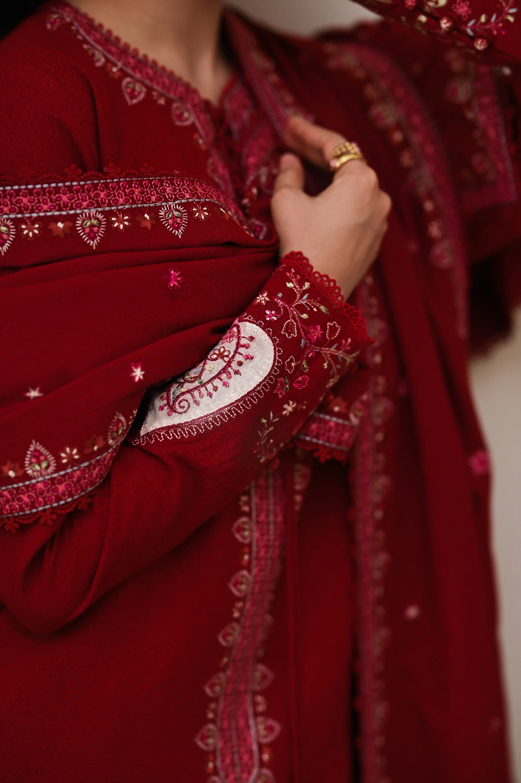 This three-piece article is a beautiful and luxurious ensemble crafted from karandi fabric in a rich, deep crimson red hue, making it ideal for cooler weather and festive occasions. The long, straight-cut shirt (kameez) is the focal point, featuring intricate traditional embroidery along the hemline (daman) and the neckline/placket, using contrasting lighter reds, pinks, and white thread to create detailed floral and geometric motifs. It is paired with simple, matching straight-cut trousers, which maintain the focus on the embellished shirt. Completing the look is a large, coordinating embroidered shawl, draped elegantly over the shoulders, which also features matching delicate embroidery, particularly along the borders, unifying the entire sophisticated and classic outfit.