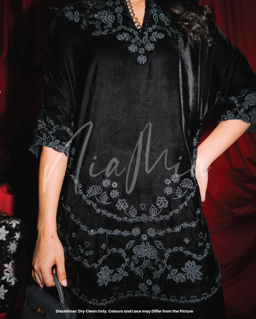 Diamond features jet-black velvet detailed with delicate tonal black embroidery along the neckline, sleeves, and hem. The subtle threadwork adds texture without overpowering, while the relaxed Nia Mia silhouette keeps it effortlessly refined.