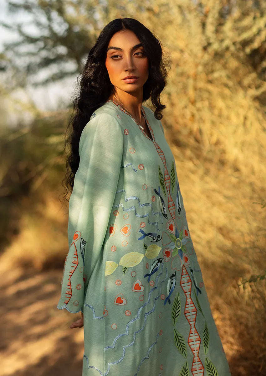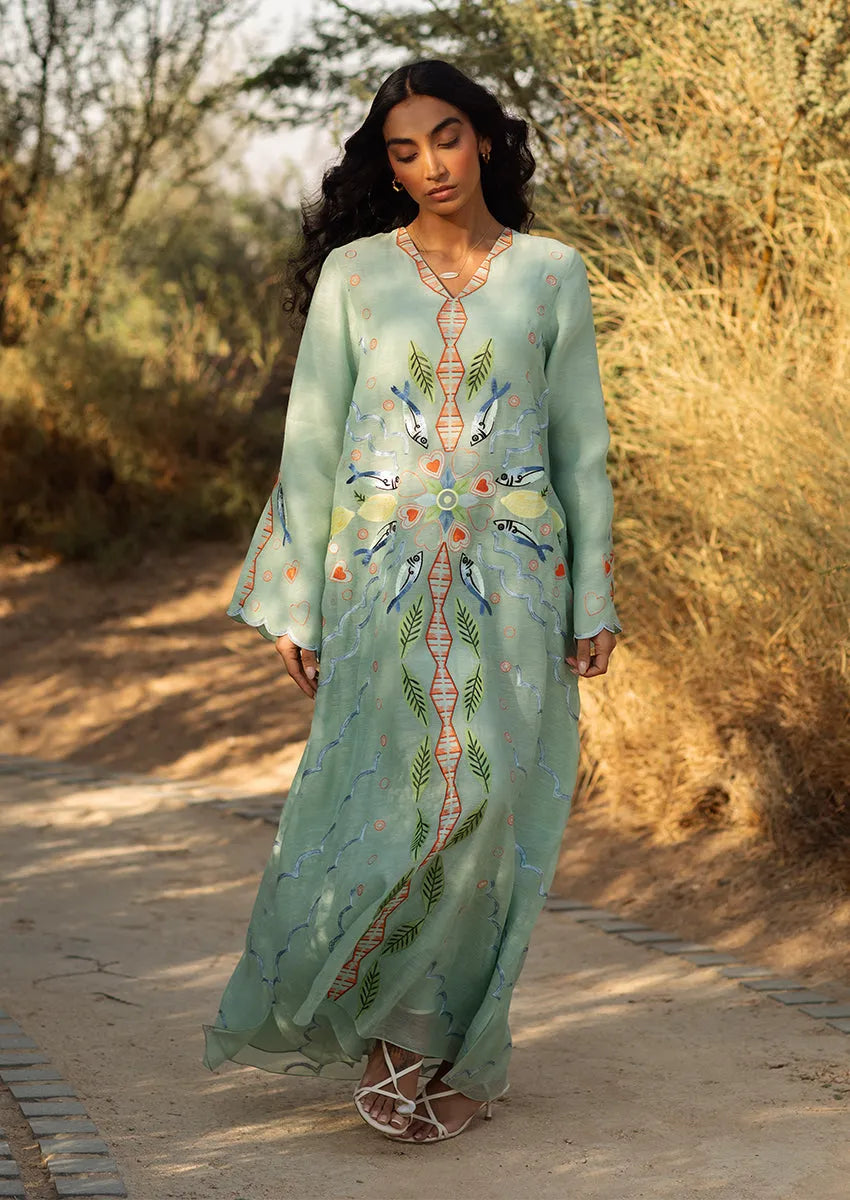 A statement kaftan that fuses artisanal detail with serene ease, this piece is crafted from sheer, weightless khaddi corduroy and adorned with embroidered fish, botanical flourishes, and undulating waves in verdant and aquatic tones.