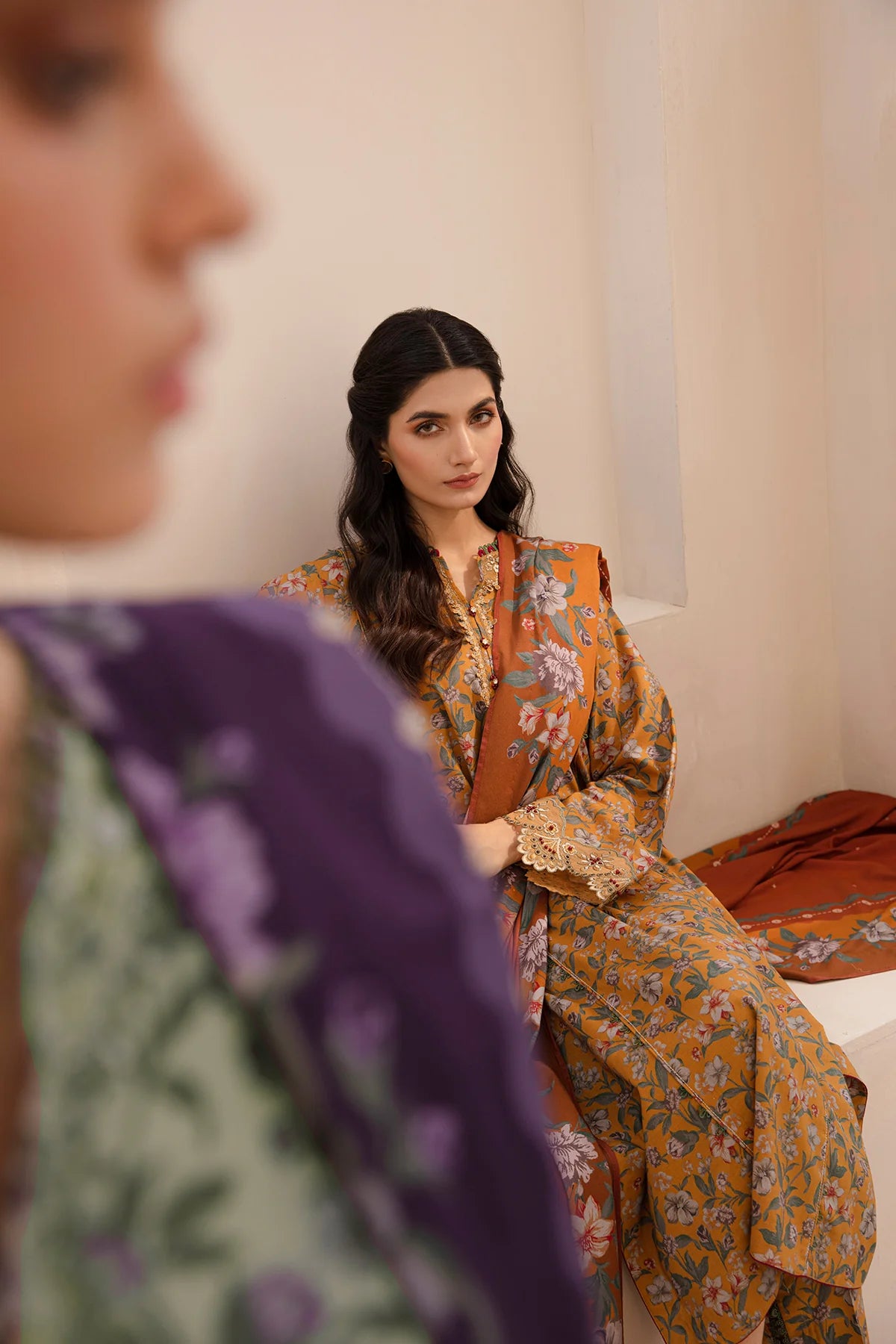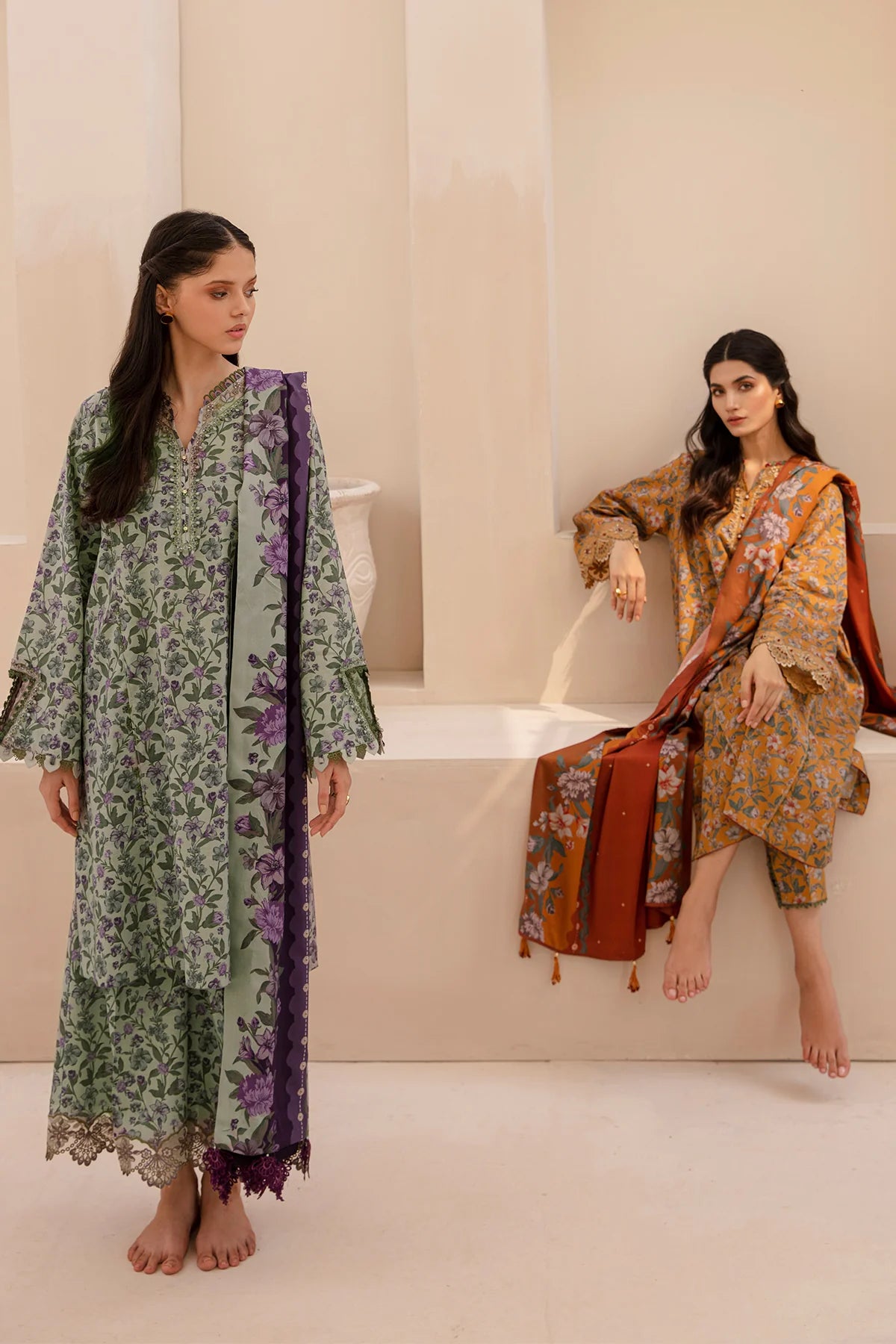 This ensemble features a high-quality printed viscose shirt and matching printed trousers adorned with a delicate blossom print in shades of lavender and olive, gracefully covering the fabric. The shirt neck is enhanced with buttons, each surrounded by embroidery. Exquisite lacework on the wide sleeves and the scalloped edges of the trousers. The look is completed with a deep purple dupatta, contrasted with embroidered motifs at the border that echoes the shirt’s prints.