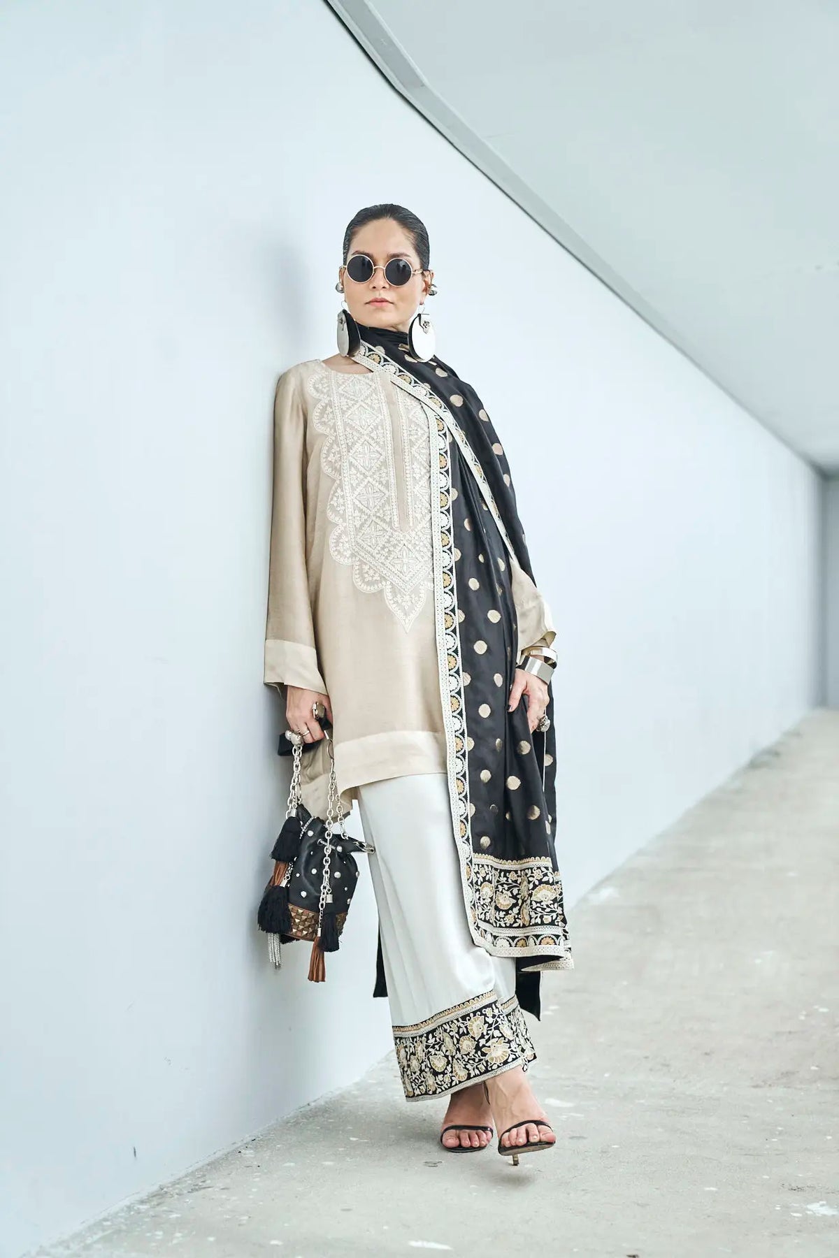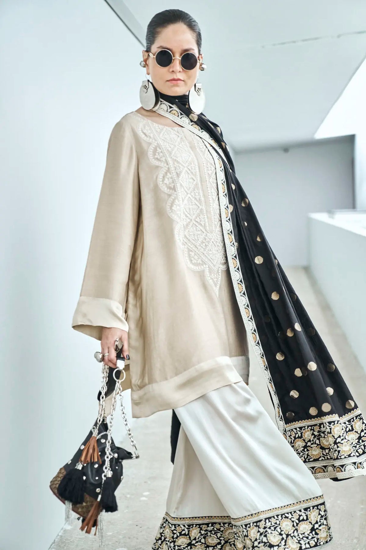Shirt: Taupe colored pure silk net short kurta with thread embroidery.