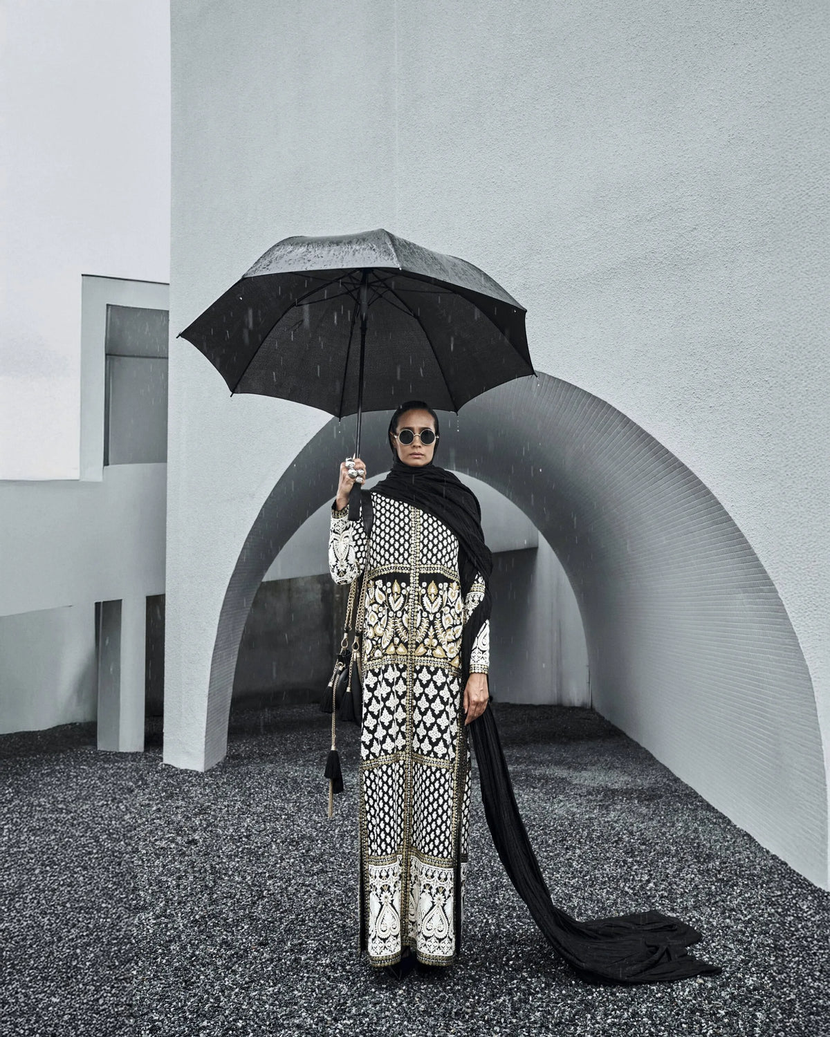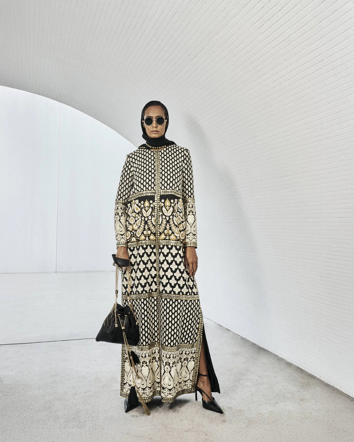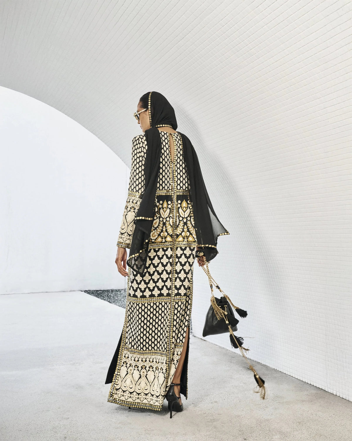 Kaftan: Pure silk ankle length kaftan with thread, zari and mukesh work in silver and gold.
