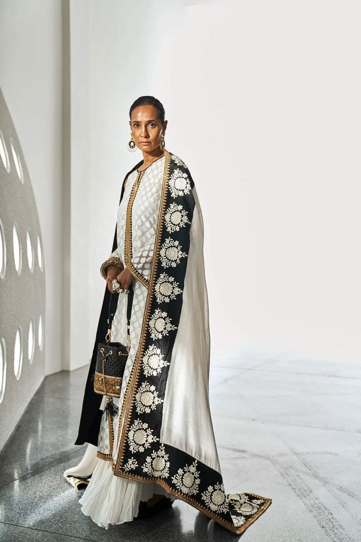 Dupatta: Dupatta is made with white pure silk net using technique of thread, marori and sequins work on black pure raw silk all over borders.