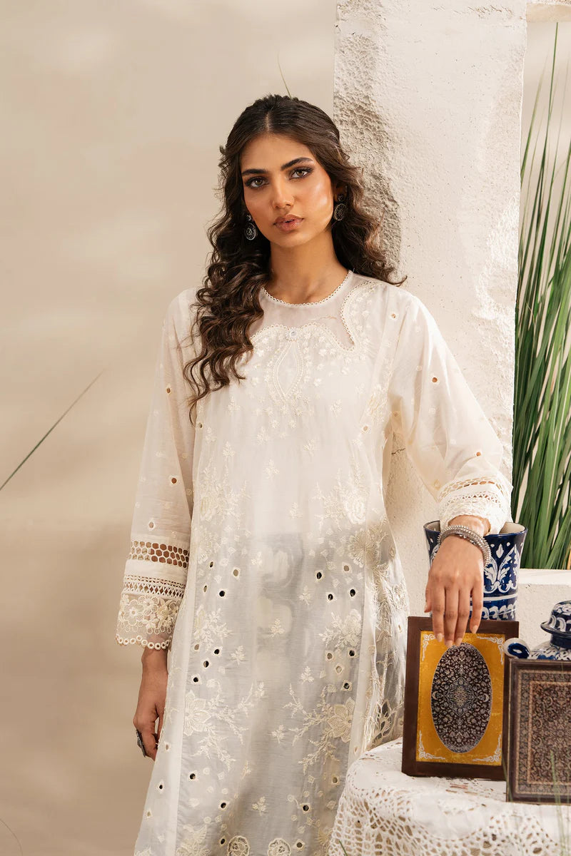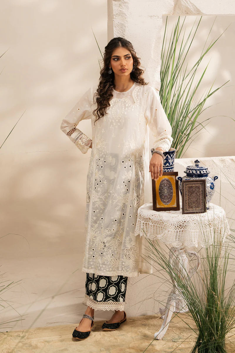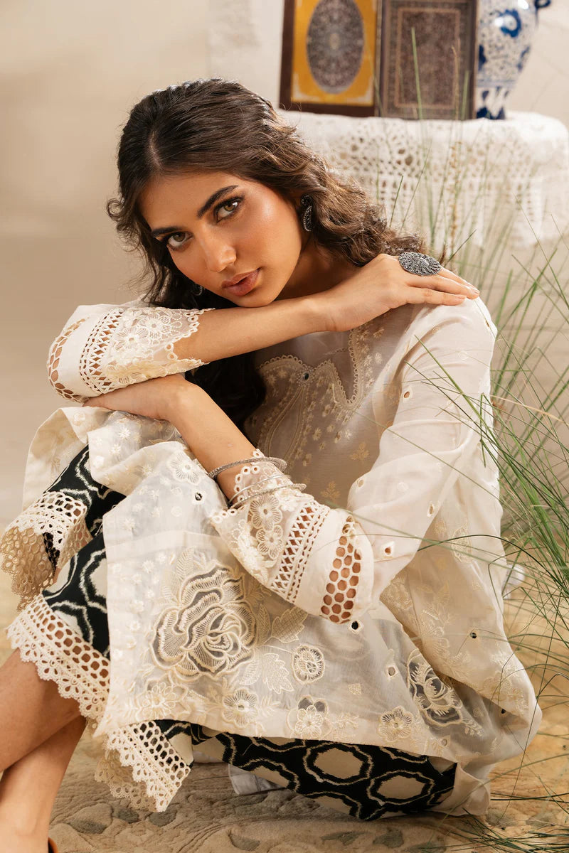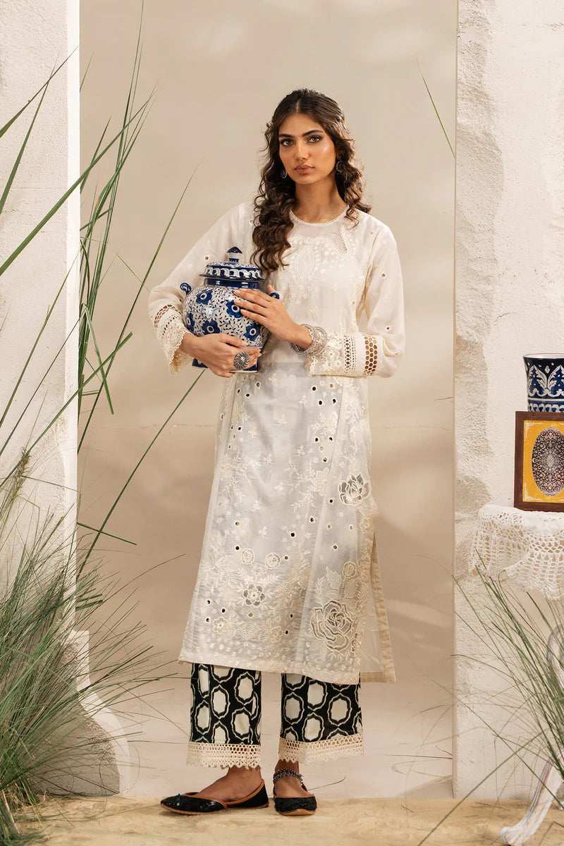 Radiate ethereal elegance in this stunning embroidered suit. The pristine white kurta is a canvas for intricate floral and geometric embroidery, complemented by delicate cutwork on the hem and sleeves that adds a touch of sophisticated artistry. This beautiful shirt is perfectly paired with a contrasting pair of black and white patterned trousers, creating a modern and striking ensemble that is a perfect blend of classic craftsmanship and contemporary flair.