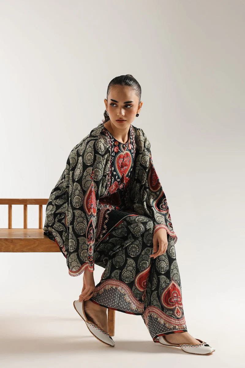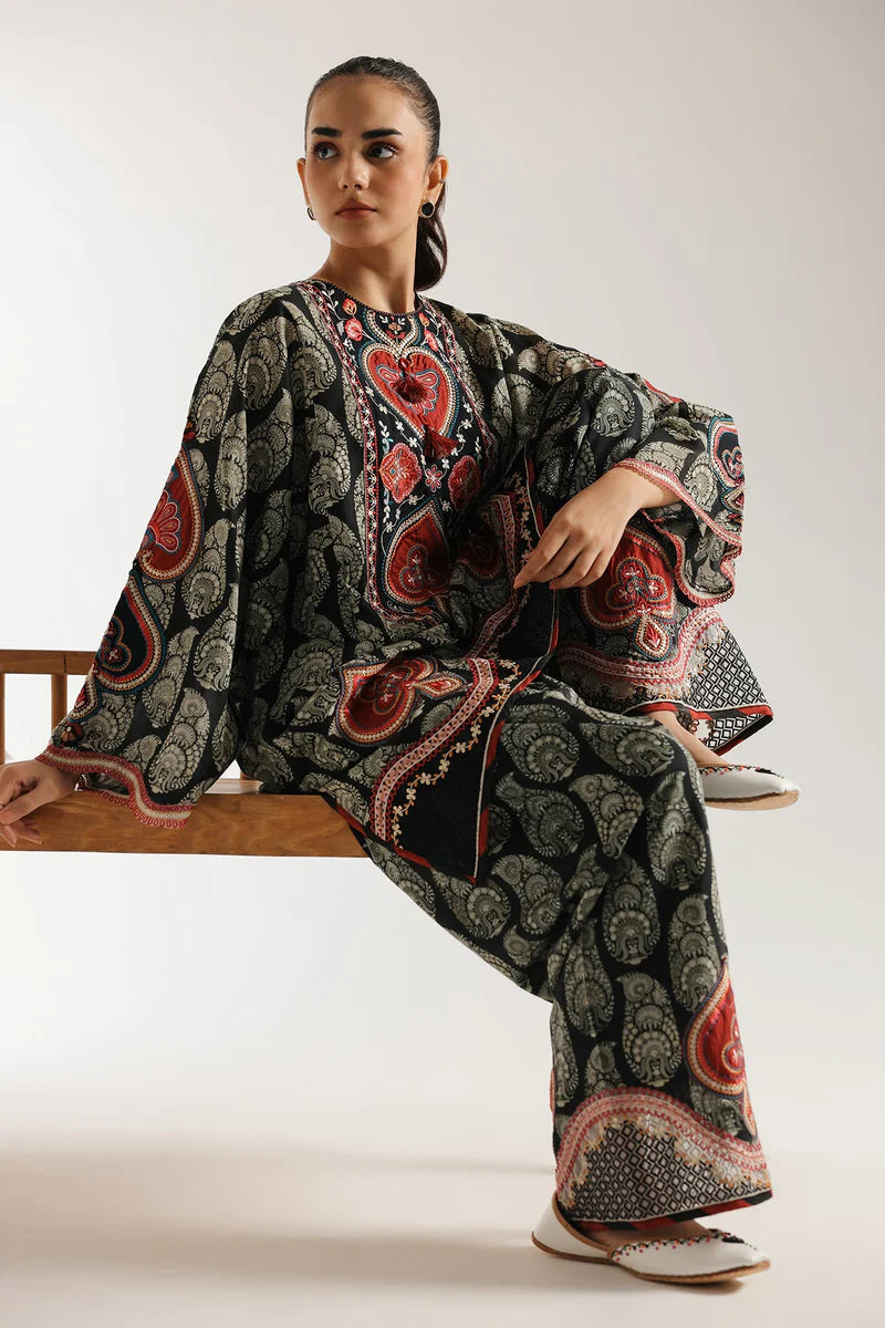 Make a bold artistic statement with this captivating black printed ensemble, a harmonious blend of traditional patterns and contemporary flair. The rich black tunic features a classic round neckline, beautifully adorned with intricate red and black embroidery that creates a striking central design. The tunic is an expressive canvas, featuring an all-over print of unique, stylized teardrop motifs in red and white against the black, lending a distinct cultural appeal. The full-length sleeves are finished with complementary patterned borders. Completing this powerful look is a perfectly matching shalwar, continuing the striking print for a cohesive and sophisticated silhouette. Perfect for festive celebrations, cultural events, or any occasion where you desire to showcase unique style and undeniable confidence.