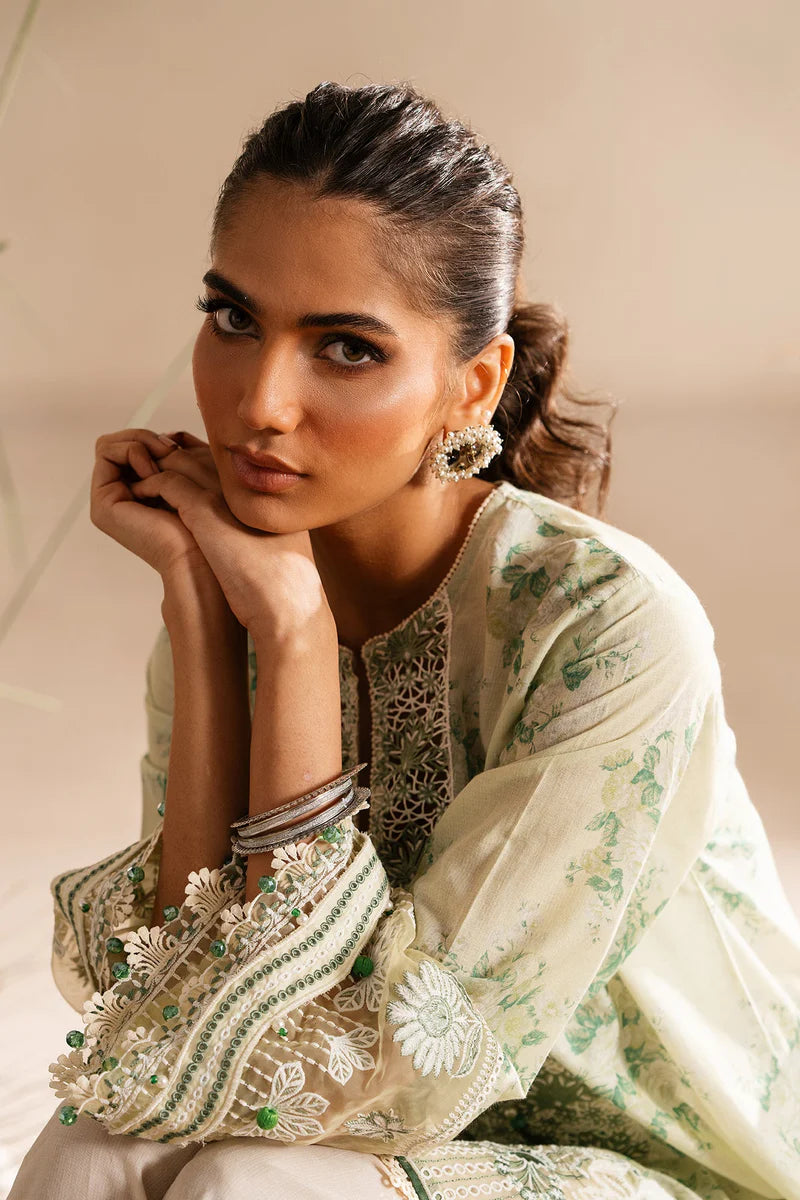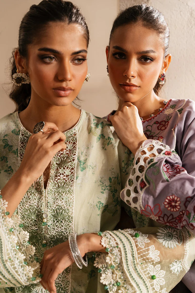 Float into a garden of serenity with this beautifully embroidered suit. The light green fabric is a delicate canvas for intricate floral and vine embroidery in subtle shades of green and off-white. Elegant lace trim and scalloped cutouts on the neckline and hem add a touch of refined artistry. This ensemble is a perfect choice for those who appreciate understated elegance and timeless style.