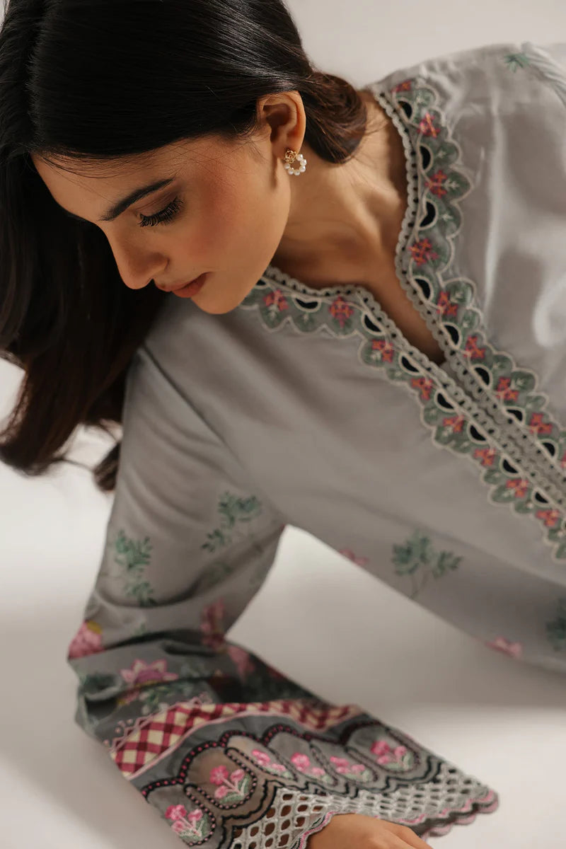 This enchanting suit is a beautiful fusion of soft colors and intricate details. The long tunic features a serene grey base, which is divided into two distinct sections. The upper part is a lighter shade, embellished with delicate floral embroidery in white and pink, and highlighted by a striking, detailed neckline. The lower half of the tunic showcases a stunning floral print with elegant stems and blossoms. The sleeves are a standout feature with their elaborate scalloped cuffs and embroidery. The suit is completed with wide-legged trousers that have a contrasting floral pattern along the hem. This graceful ensemble is perfect for a stylish day out or an elegant evening.
