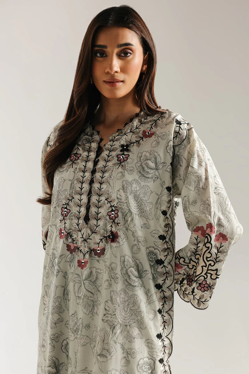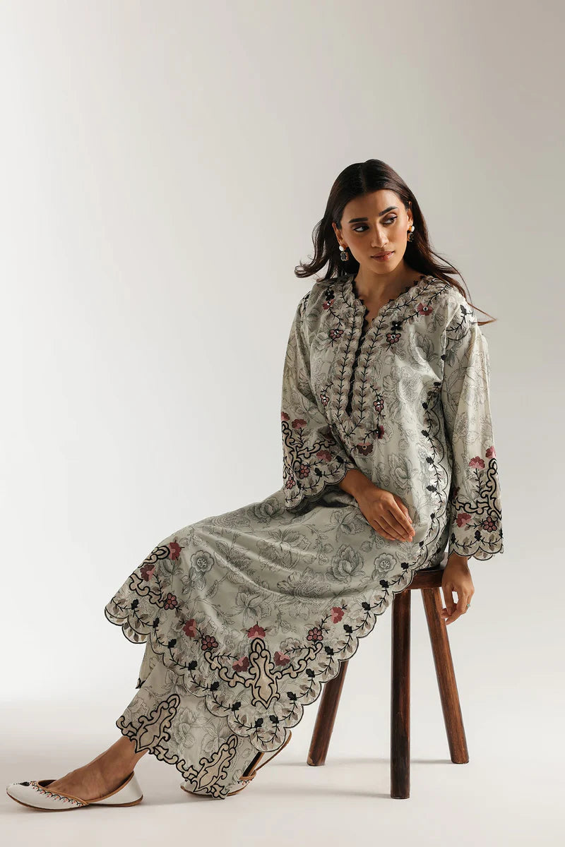This captivating suit is a masterful blend of subtle print and rich embroidery, set on a soft, light-gray fabric. The long-line shirt features a delicate all-over floral print, which serves as a beautiful backdrop for the bold embroidery in black and deep maroon that accents the neckline and sleeves. The most striking feature is the elaborate scalloped hemline on both the shirt and the wide-leg trousers, which are intricately embroidered to create a truly elegant and cohesive ensemble.