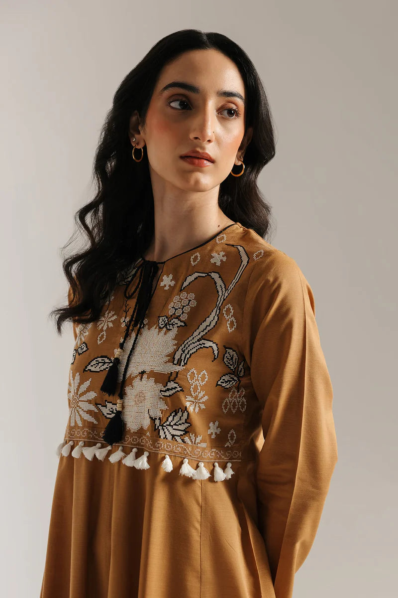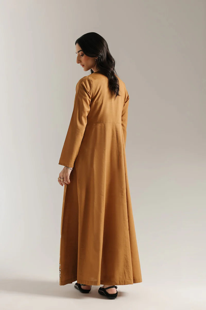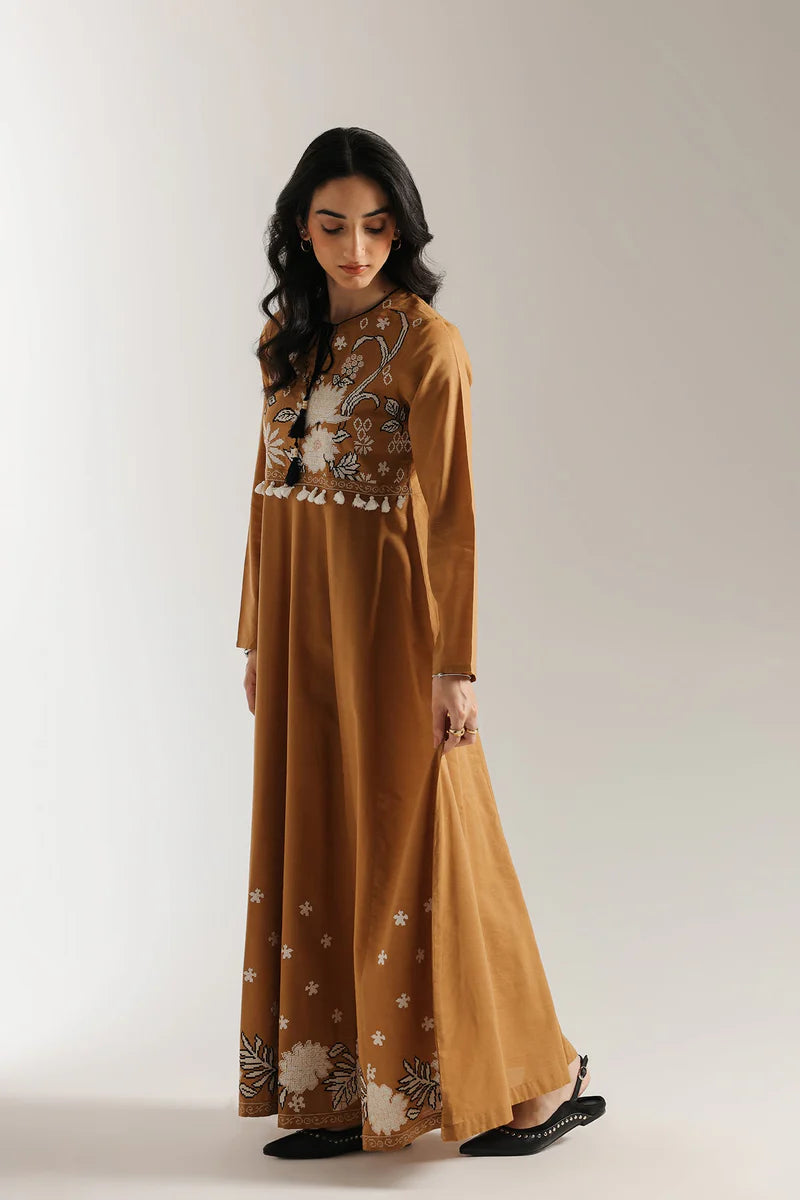 This brown pishwas features a long, flared silhouette that enhances its elegant drape. Designed with full sleeves, it showcases intricate floral embroidery that adds refined texture and visual appeal. Perfect for formal occasions, this embroidered suit combines traditional craftsmanship with timeless style for a sophisticated look.