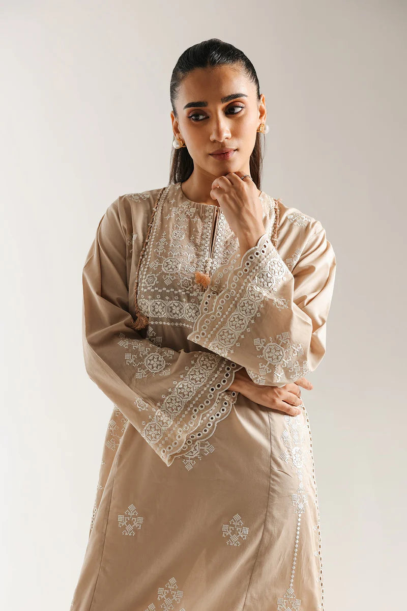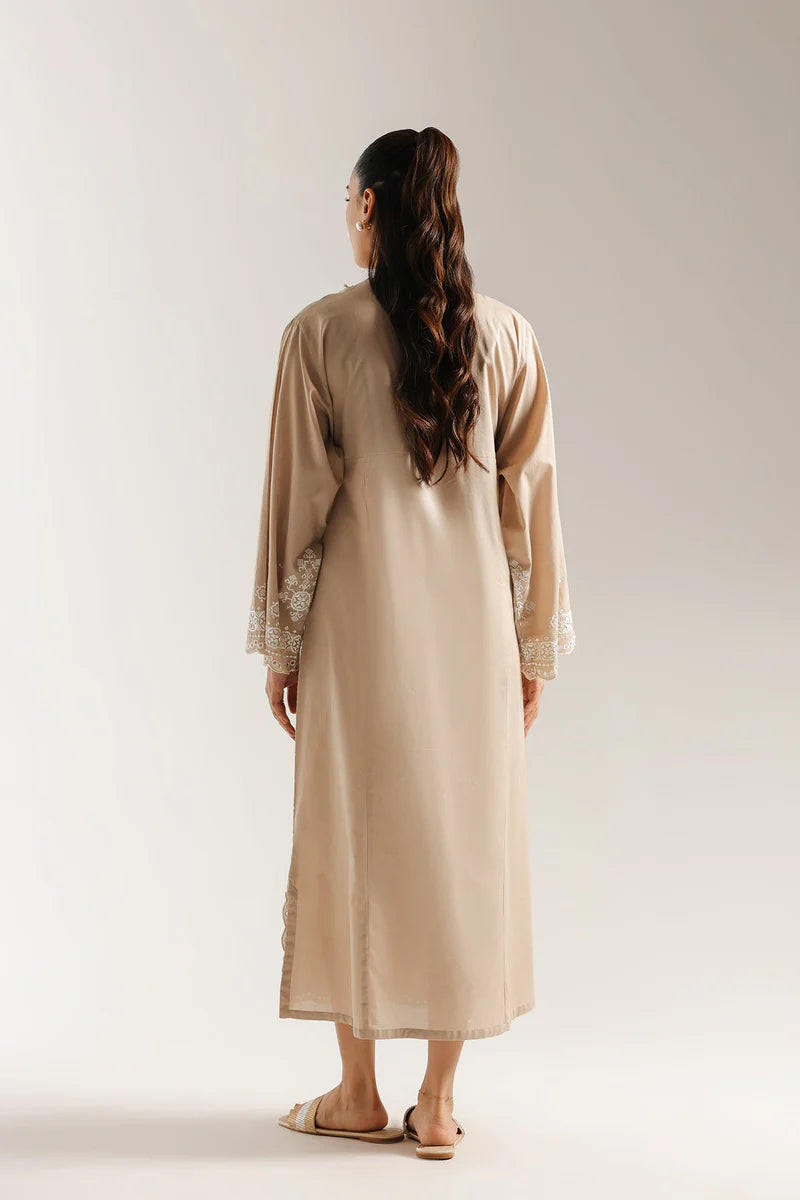 Radiate effortless elegance in this exquisite embroidered dress. Crafted from a soft, flowing fabric in a sophisticated beige hue, this maxi dress is adorned with delicate white embroidery that cascades gracefully from the bodice to the hem, adding a touch of intricate beauty. The comfortable silhouette and charming tassel detailing at the neckline complete this timeless piece, making it a versatile choice for any occasion.